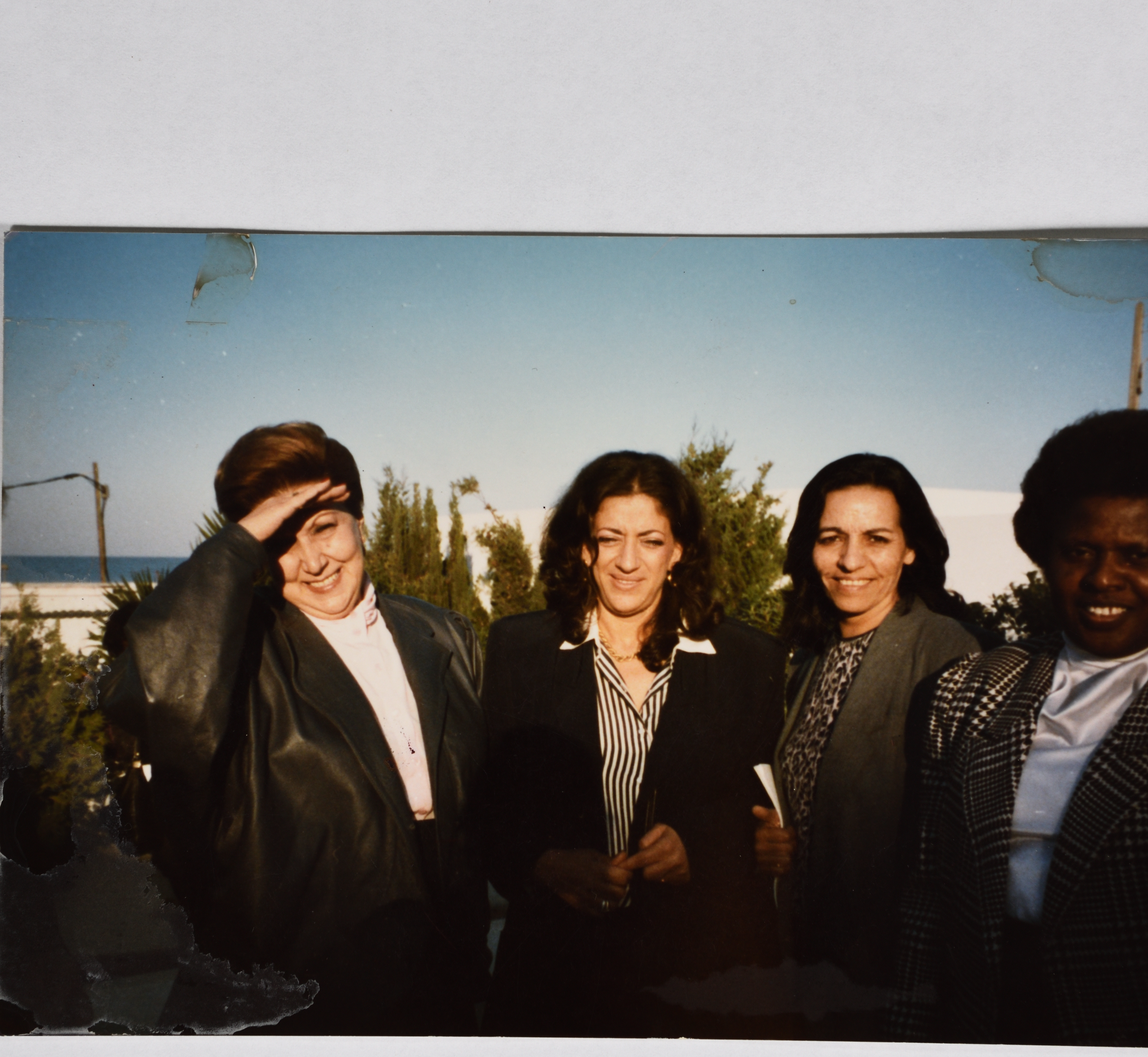 A colour photograph of the leaders of the Palestinian Women's Labor Federation, who are: the fighter Fatimeh Al Birnawi, Khadija Abu Ali, Firyal Abed Al Rahman and Najla' Yassin.
