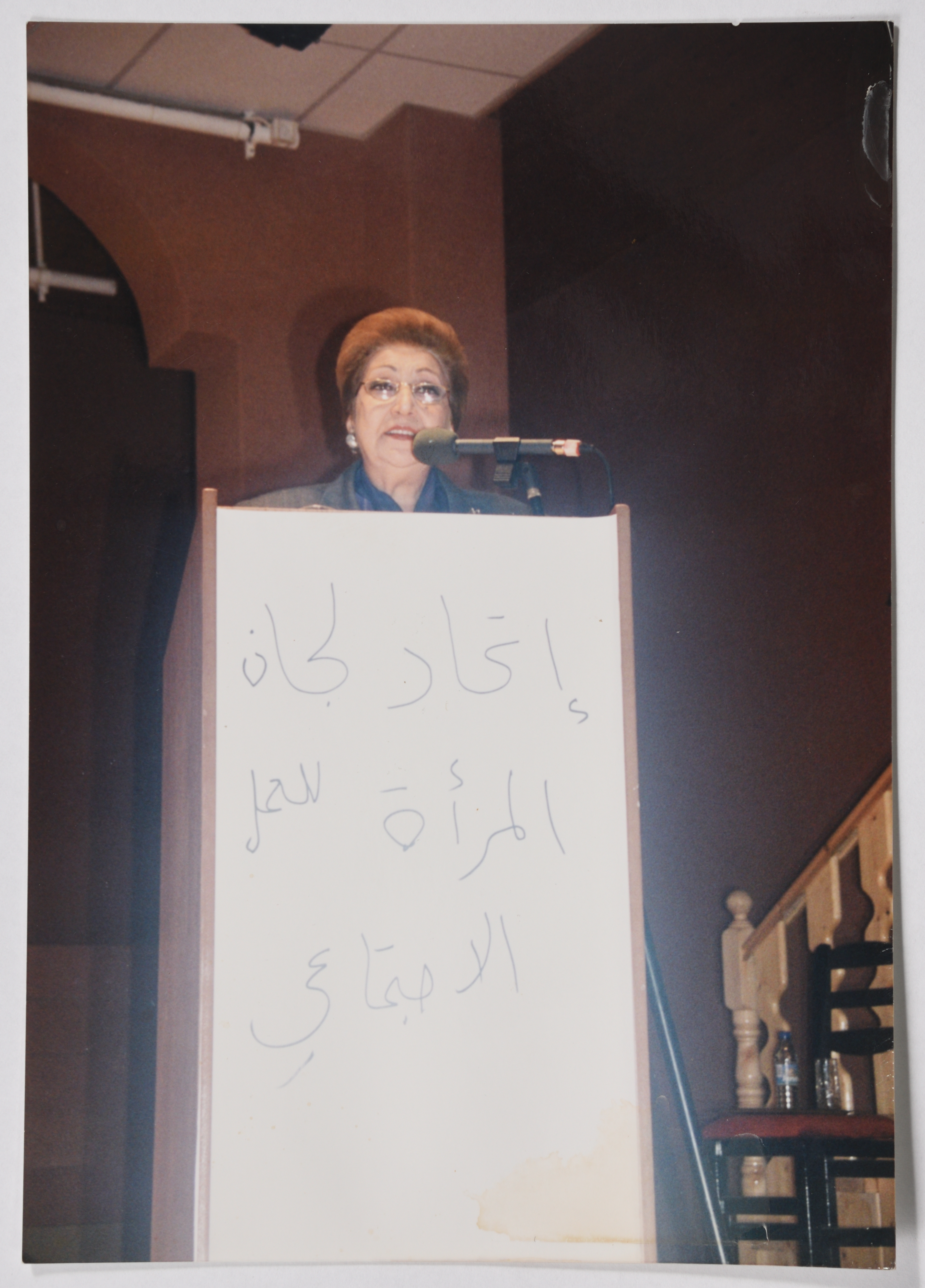 A colour photograph of Ms. Najla Yassin, receiving a speech at an event of the Union of Women's Committees for Social Action.