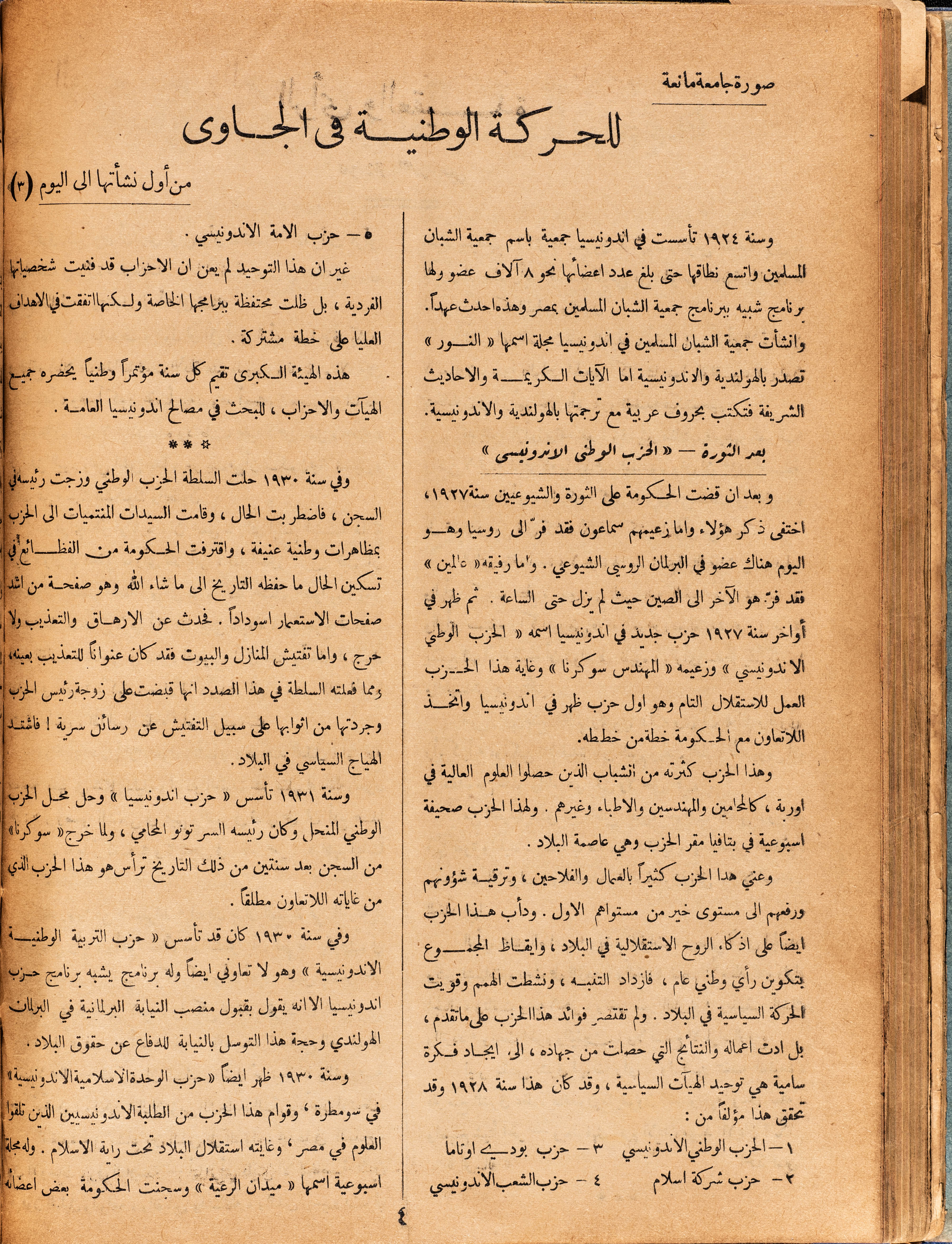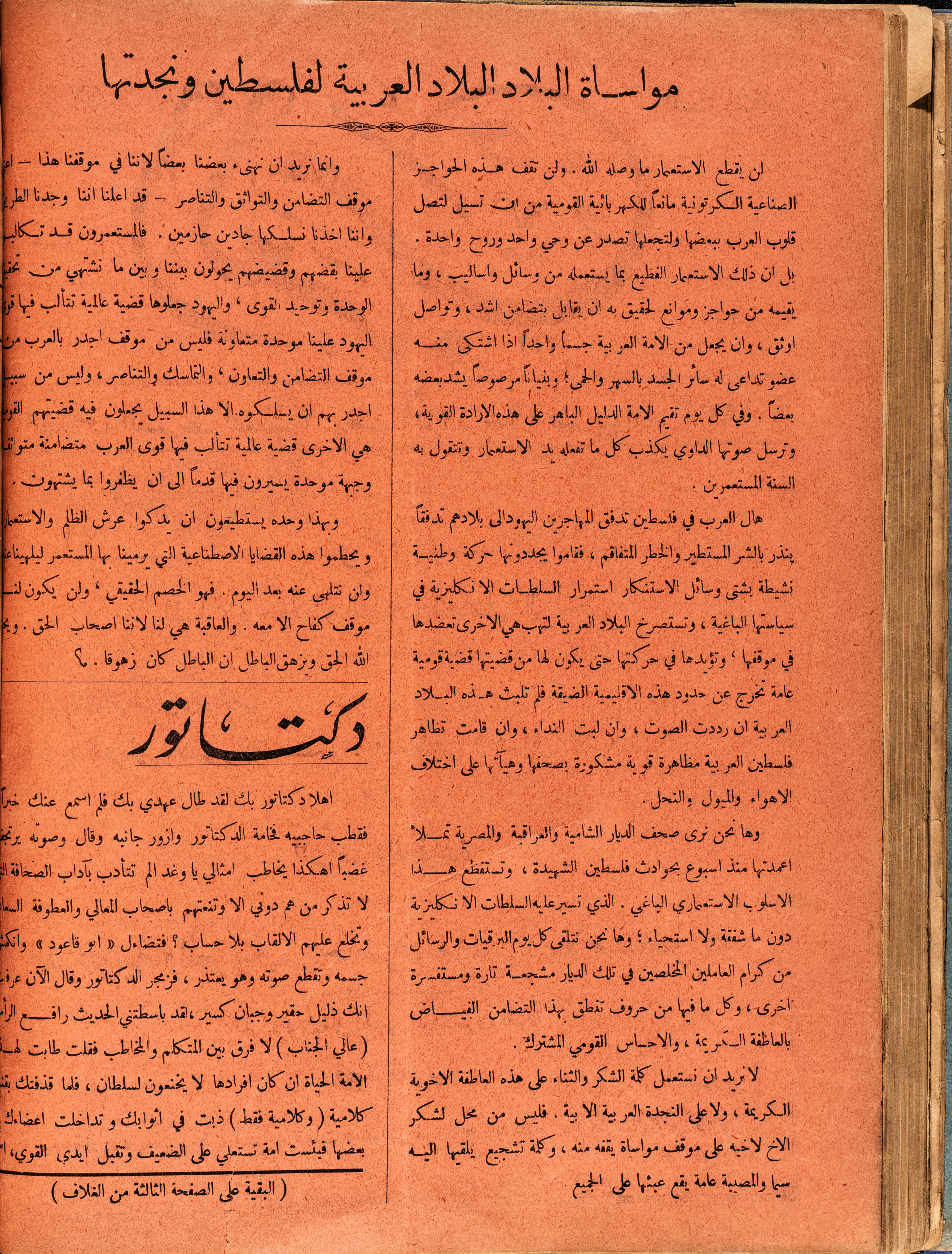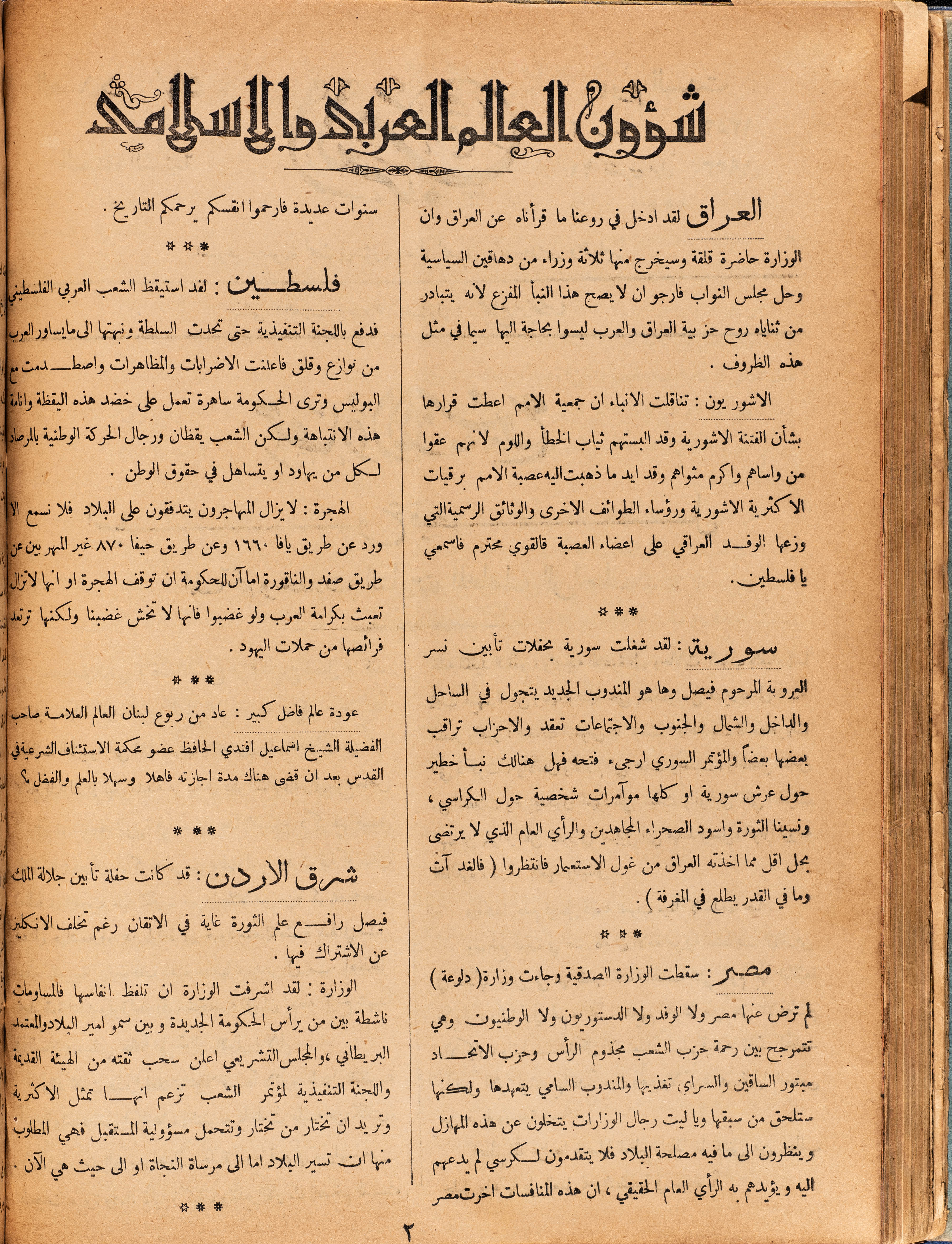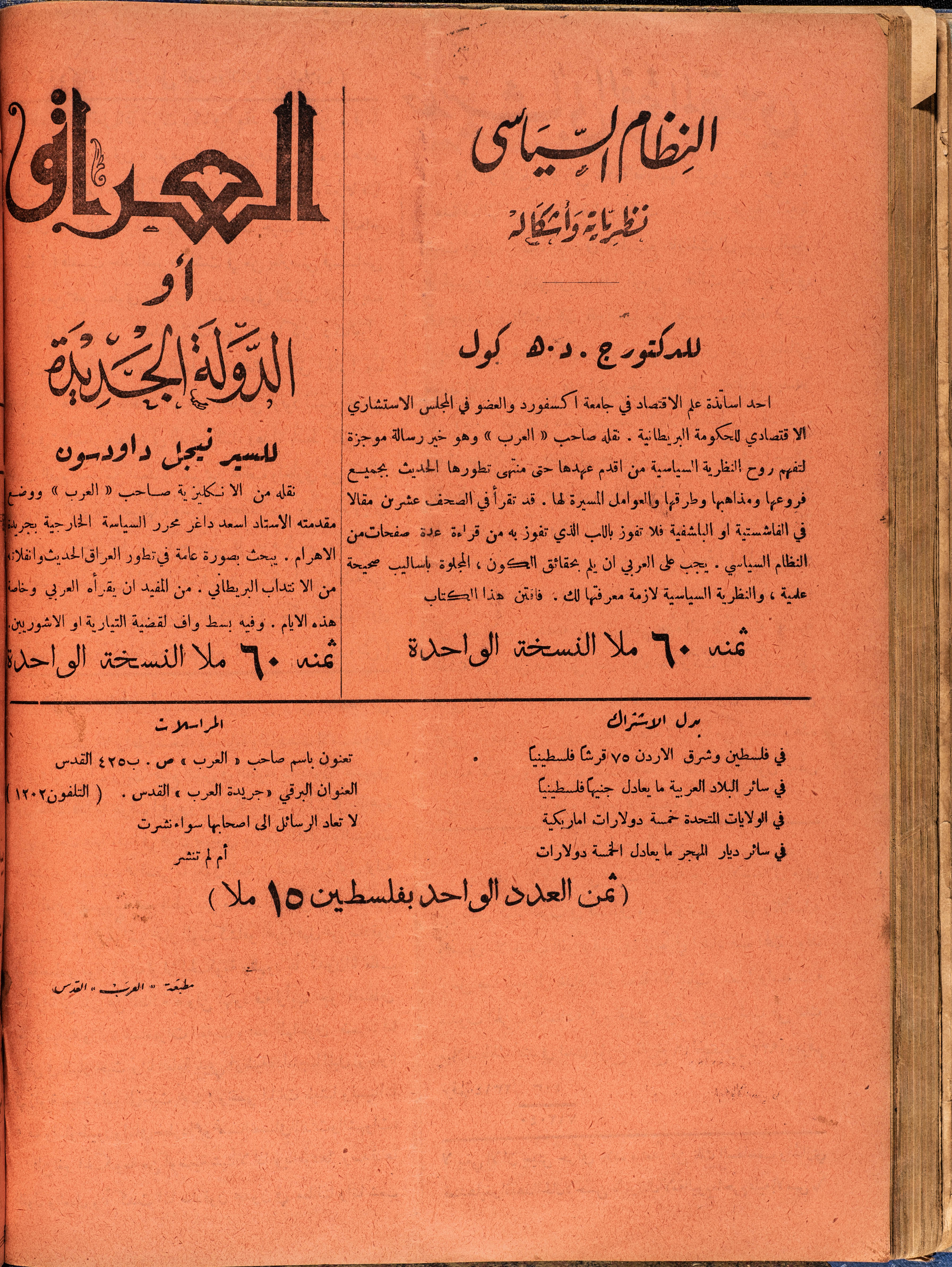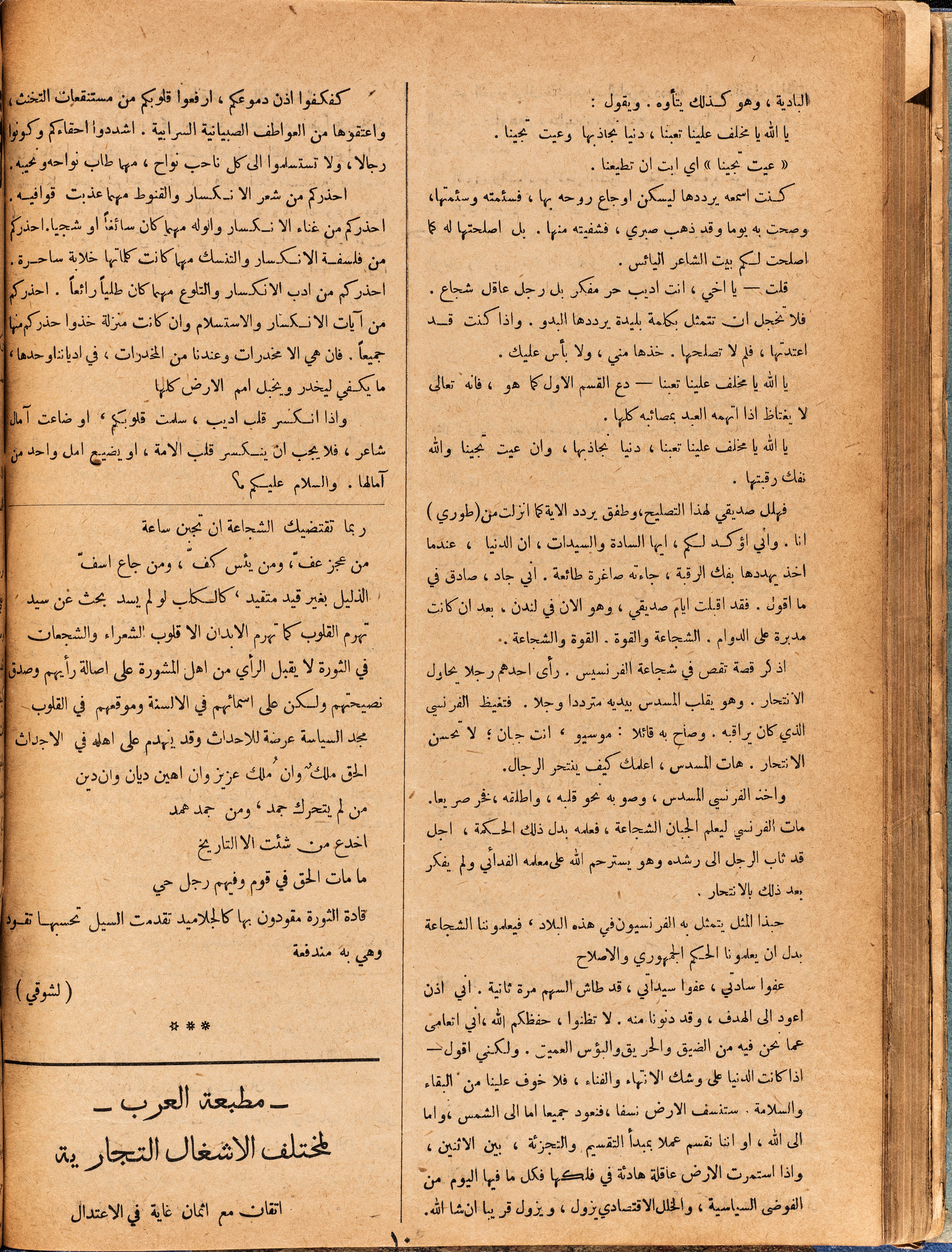Issued in Arabic on 21 October 1933, this 20-page periodical features the 57th issue of al-Arab Magazine. The issue embraces variegated articles and news including: 1. The Arabs Offering Consolation to Palestine, and the memorial service to the late Faiṣal, 2. The Muslim Arab World Affairs, 3. The Difference between Opinion and Creed, 4. The National Movement, 5. The Pharaonic and Arab Civilisations, 6. The Burnt Hadramaut by Mohammad Abdullah al-Amudy, 7. Literature pieces titled, 'Likes and Dis-likes', 'Kurla's Proses', 'Expatriate Mail', 'Barbed Flowers', 'The Dictator'.