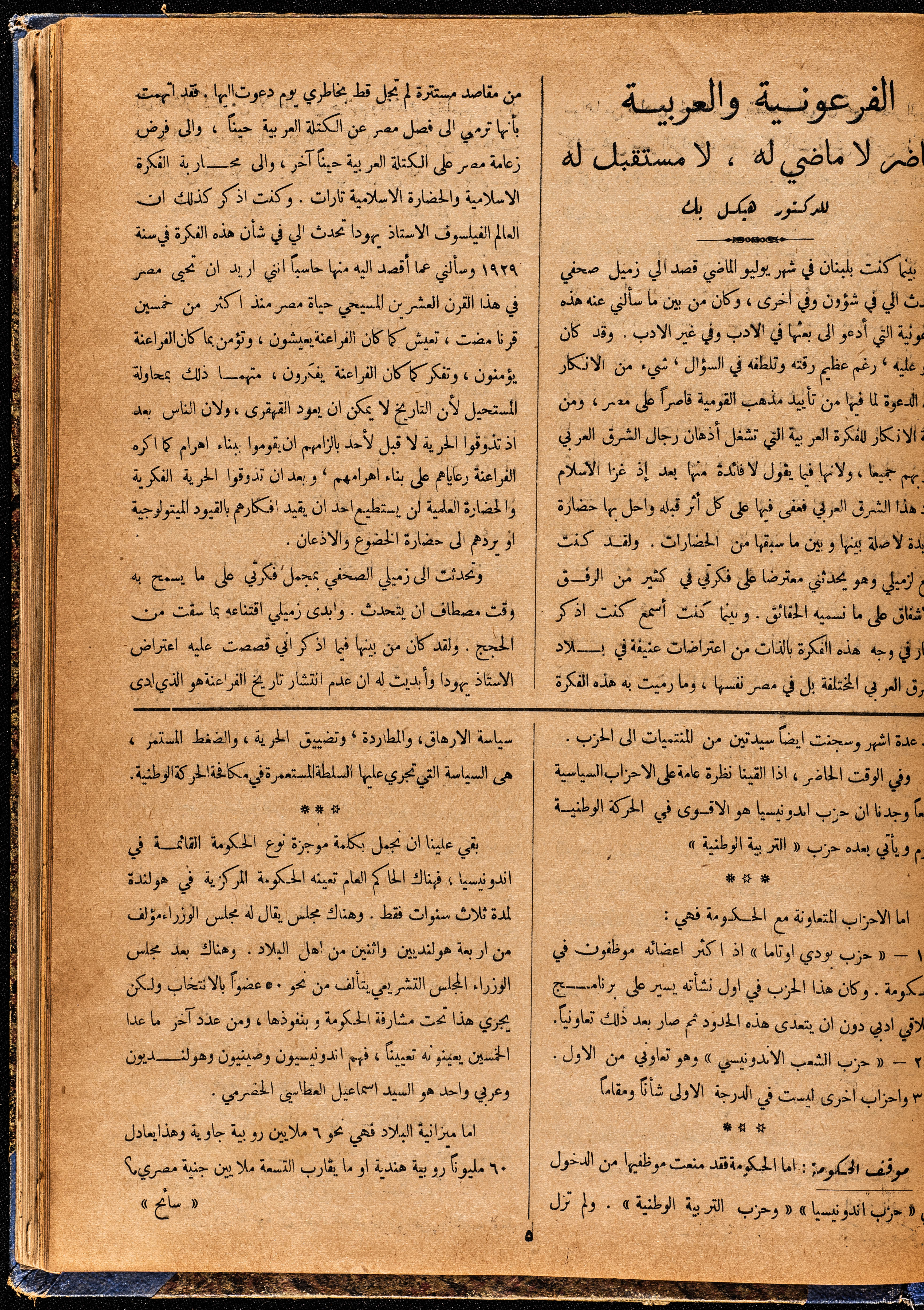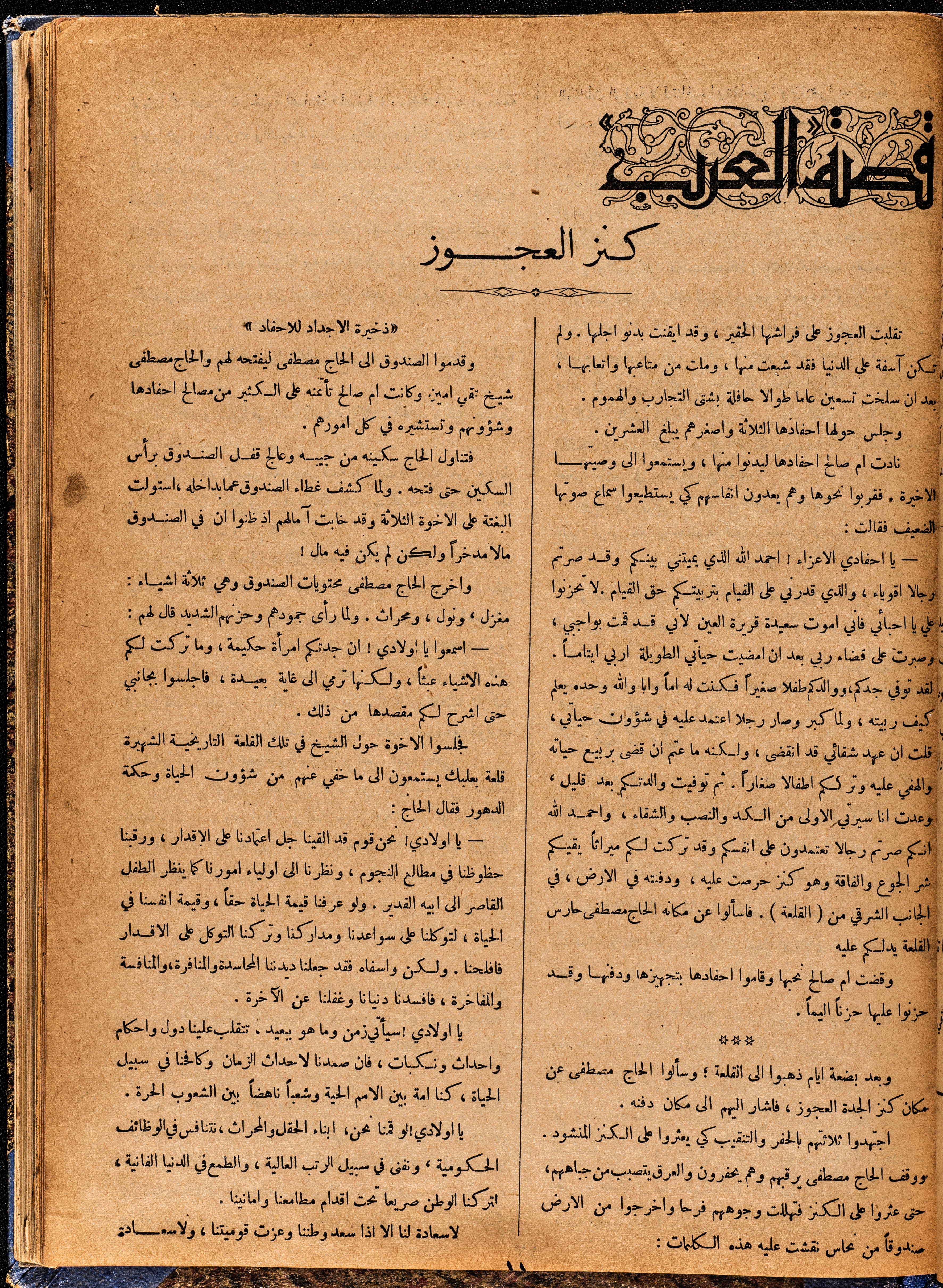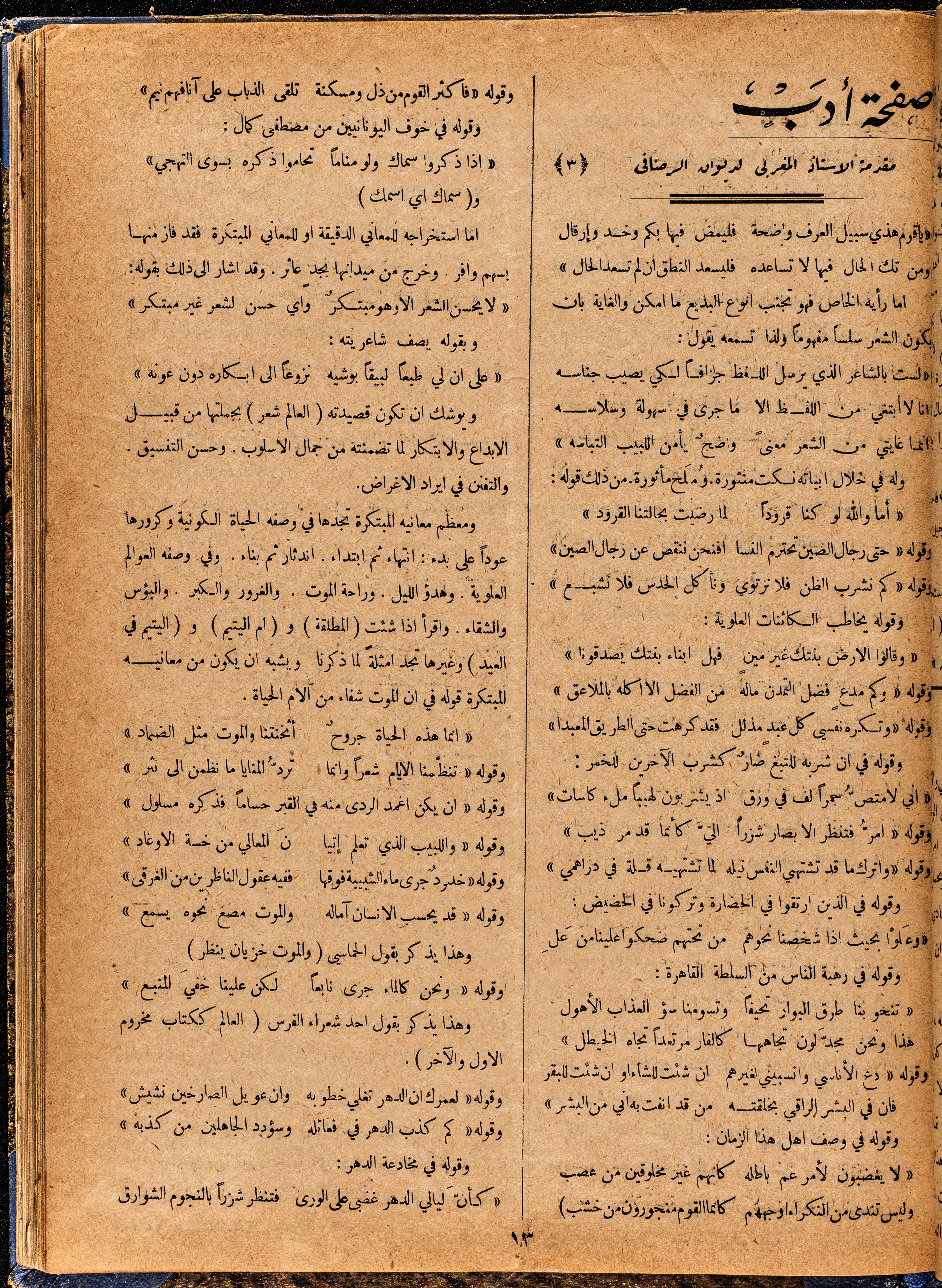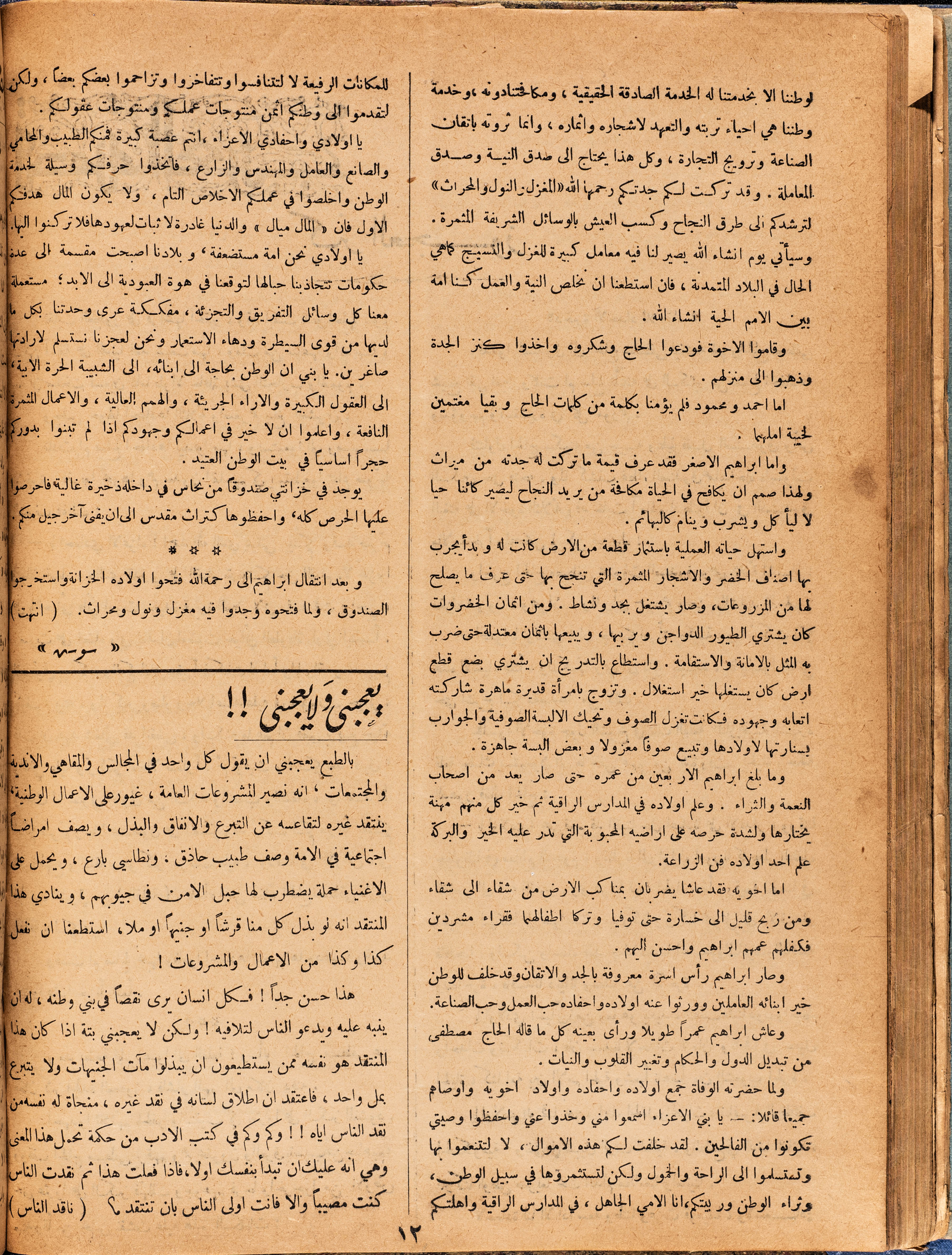 Issued in Arabic on 21 October 1933, this 20-page periodical features the 57th issue of al-Arab Magazine. The issue embraces variegated articles and news including: 1. The Arabs Offering Consolation to Palestine, and the memorial service to the late Faiṣal, 2. The Muslim Arab World Affairs, 3. The Difference between Opinion and Creed, 4. The National Movement, 5. The Pharaonic and Arab Civilisations, 6. The Burnt Hadramaut by Mohammad Abdullah al-Amudy, 7. Literature pieces titled, 'Likes and Dis-likes', 'Kurla's Proses', 'Expatriate Mail', 'Barbed Flowers', 'The Dictator'.