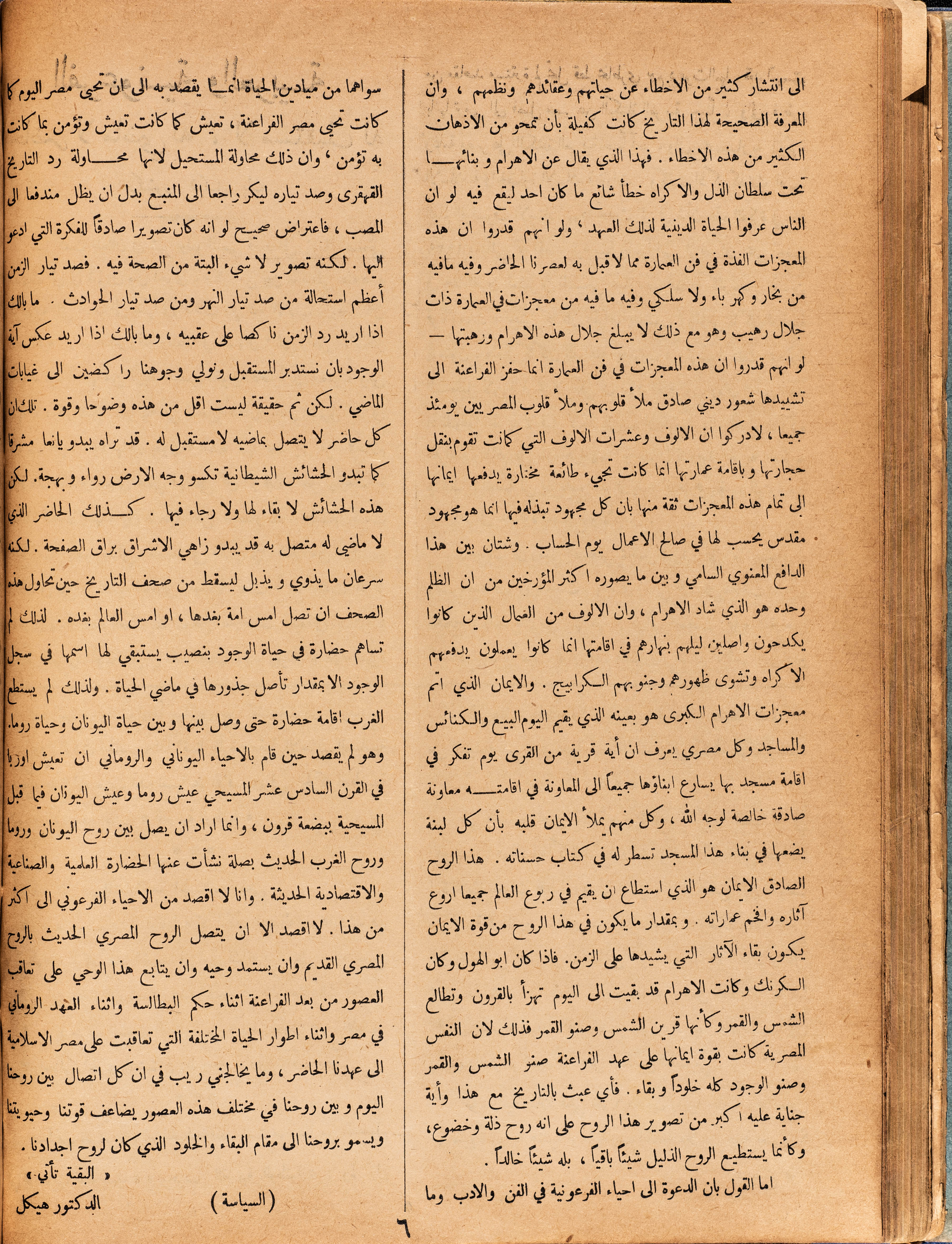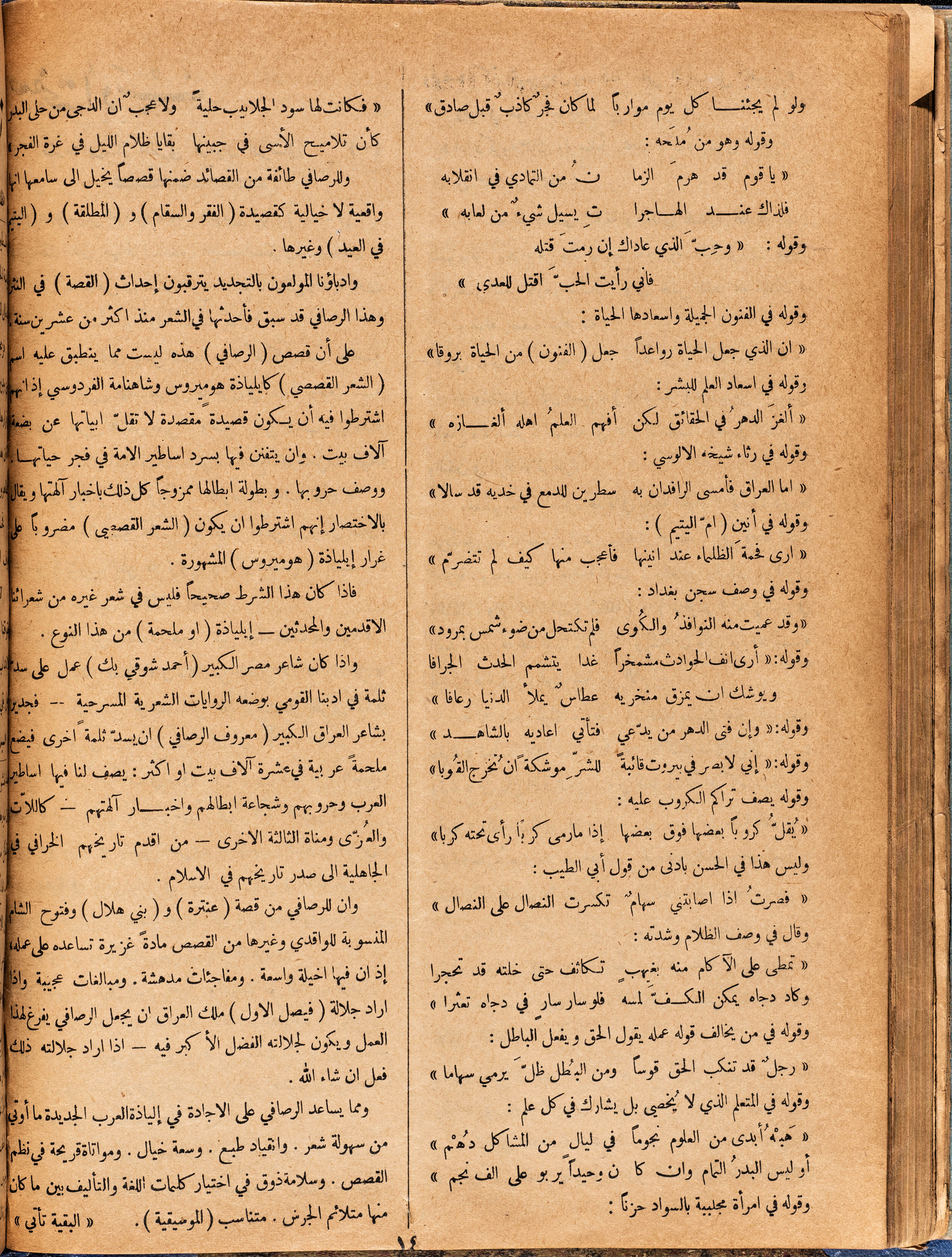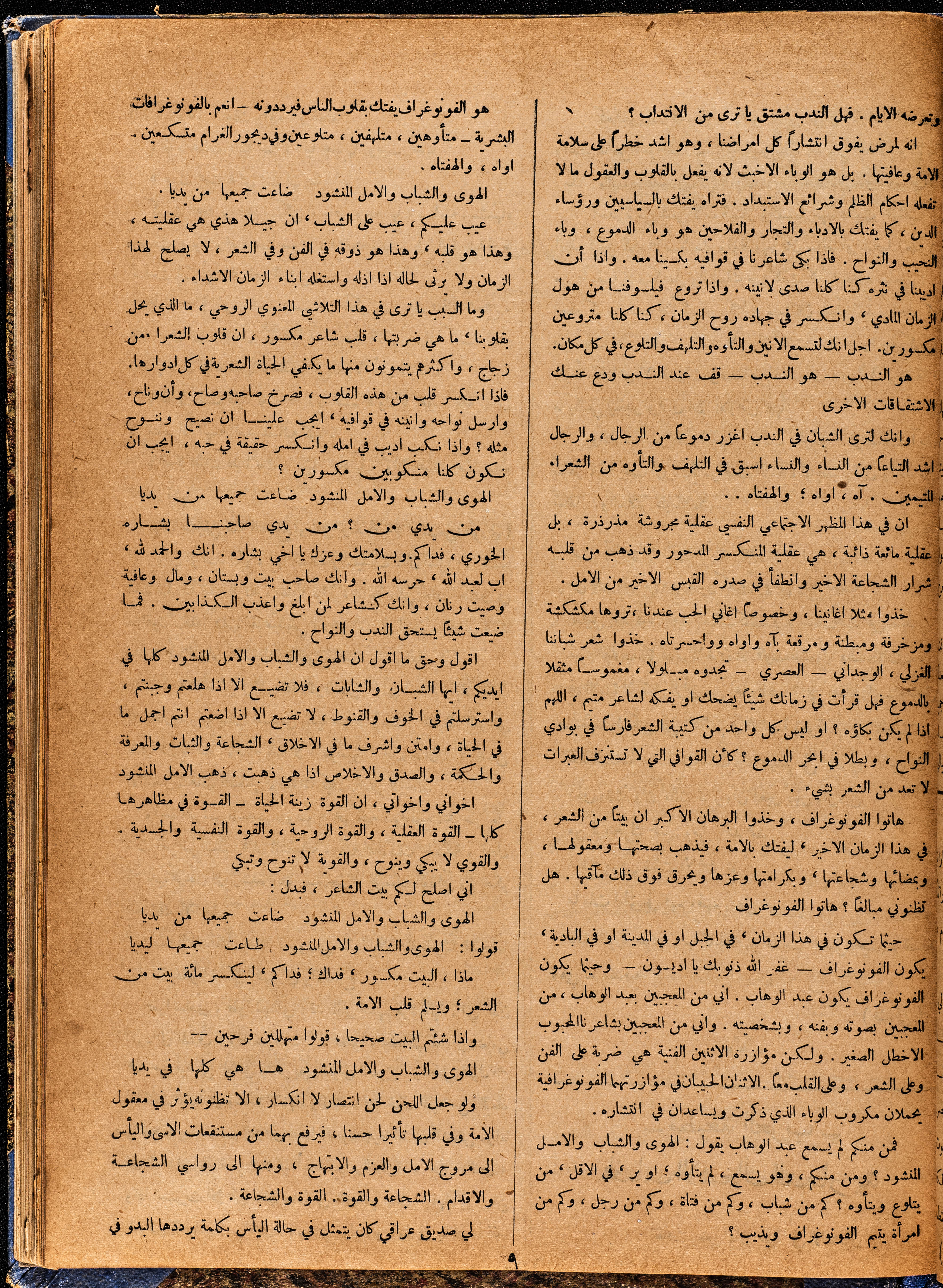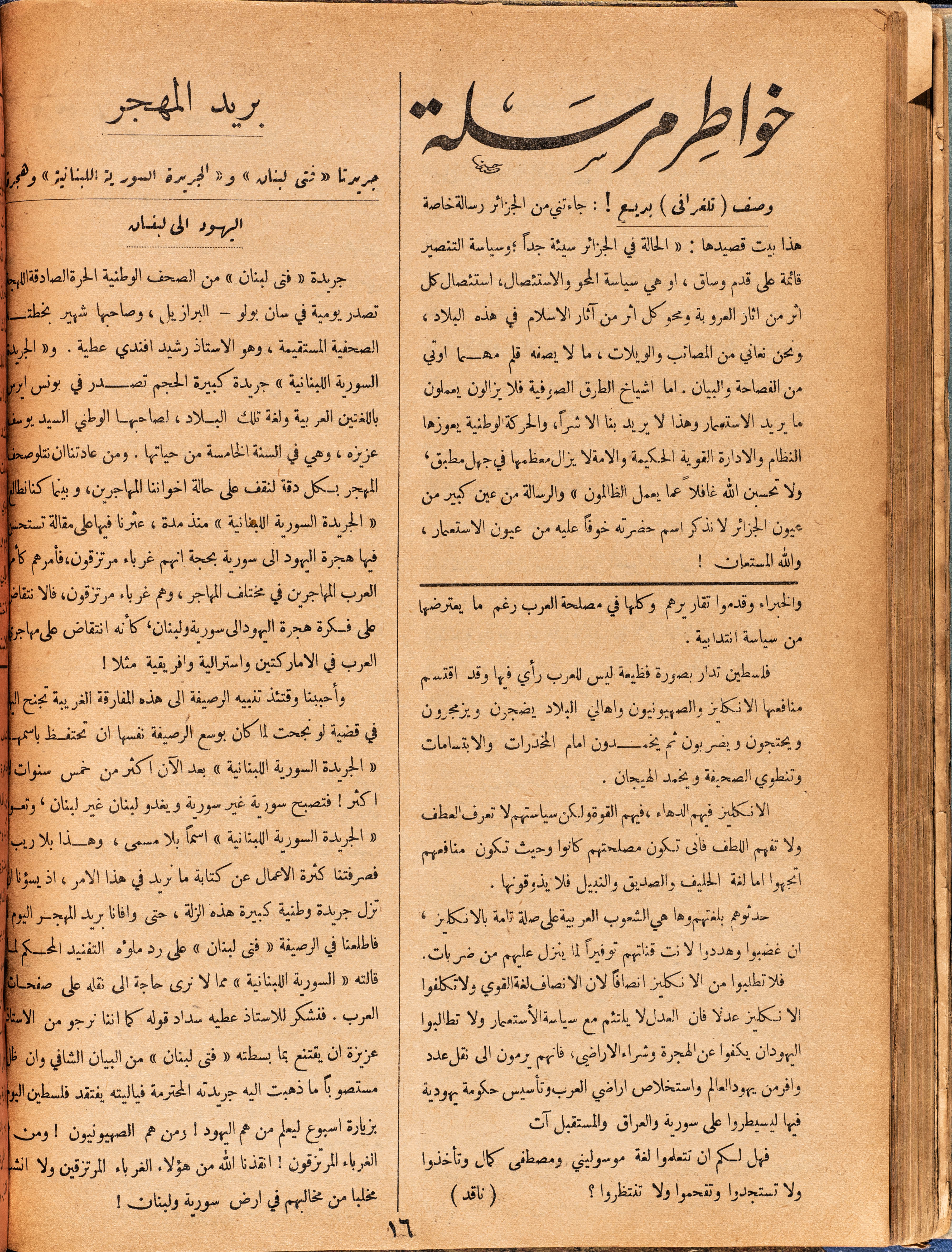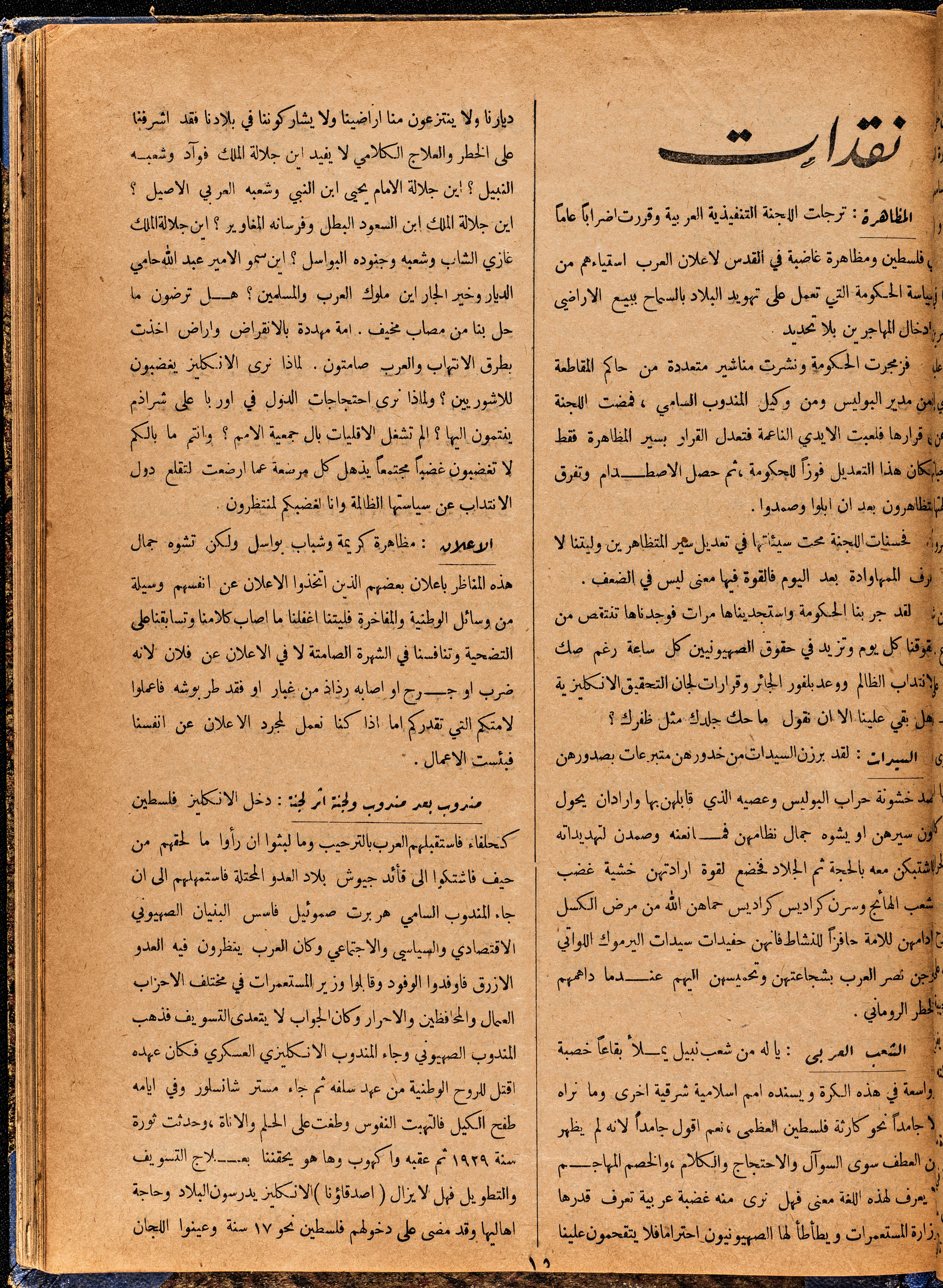 Issued in Arabic on 21 October 1933, this 20-page periodical features the 57th issue of al-Arab Magazine. The issue embraces variegated articles and news including: 1. The Arabs Offering Consolation to Palestine, and the memorial service to the late Faiṣal, 2. The Muslim Arab World Affairs, 3. The Difference between Opinion and Creed, 4. The National Movement, 5. The Pharaonic and Arab Civilisations, 6. The Burnt Hadramaut by Mohammad Abdullah al-Amudy, 7. Literature pieces titled, 'Likes and Dis-likes', 'Kurla's Proses', 'Expatriate Mail', 'Barbed Flowers', 'The Dictator'.
