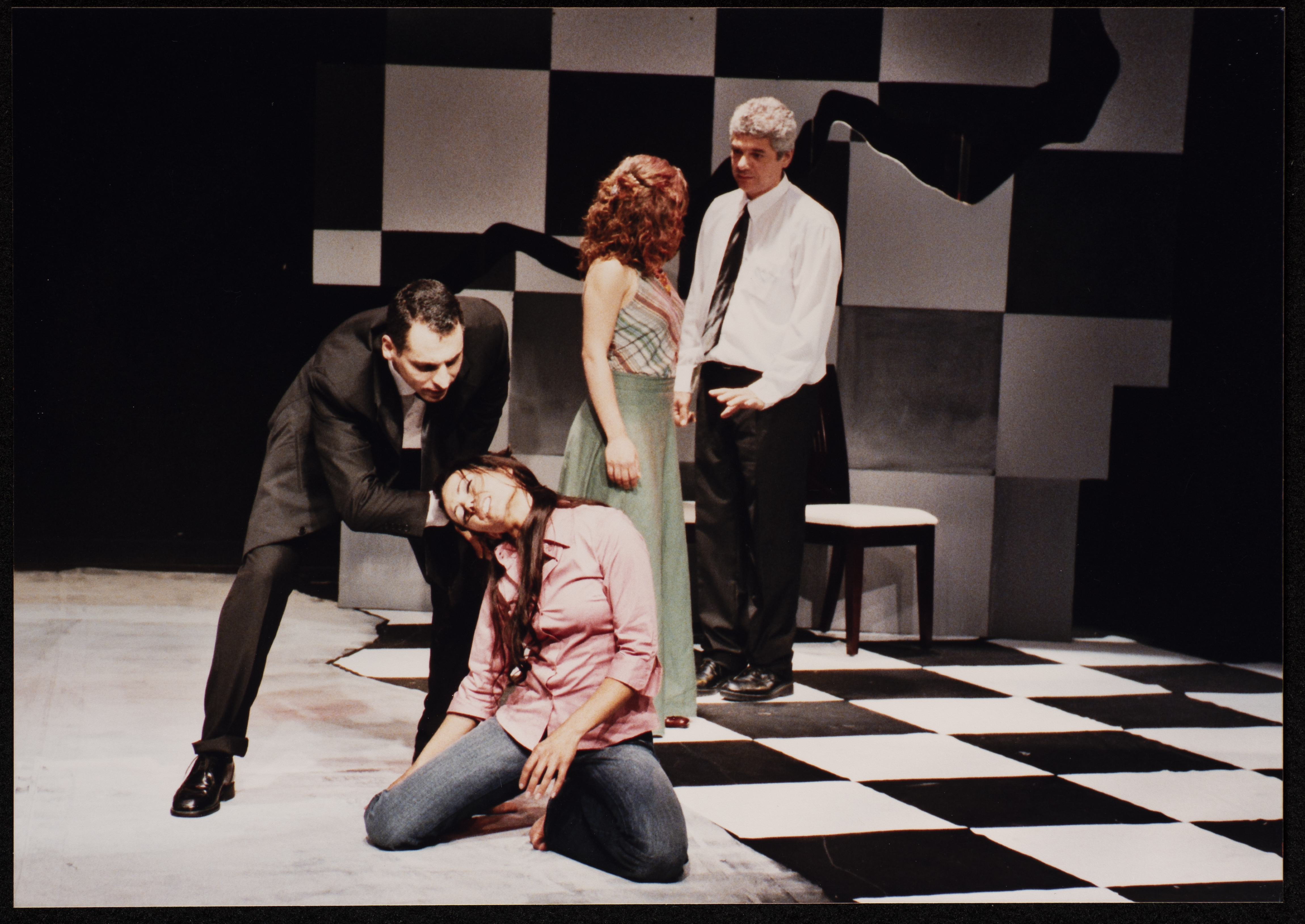 صورة ملونة تجمع حنان حلو وآمال قيس وجواد عبد الغني وإياد شتي خلال أدائهم لمشهد جماعي أثناء عؤض مسرحية بياض العينين أمام الجمهور. يذكر أن مسرحية بياض العينين، من انتاج مسرح الميدان عام 2005، وتأليف أيمن إغبارية واخراج منير بكرية، وتدور أحداثها حول حادثة دهس طفل فلسطيني لأبن عامل فلسطيني من مدينة جنين داخل الأراضي المحتلة عام 1948، هذه الحادثة تكشف العديد من الأحداث المسكوت عنها لدى العرب واليهود في الأراضي المحلتة عام 1948.