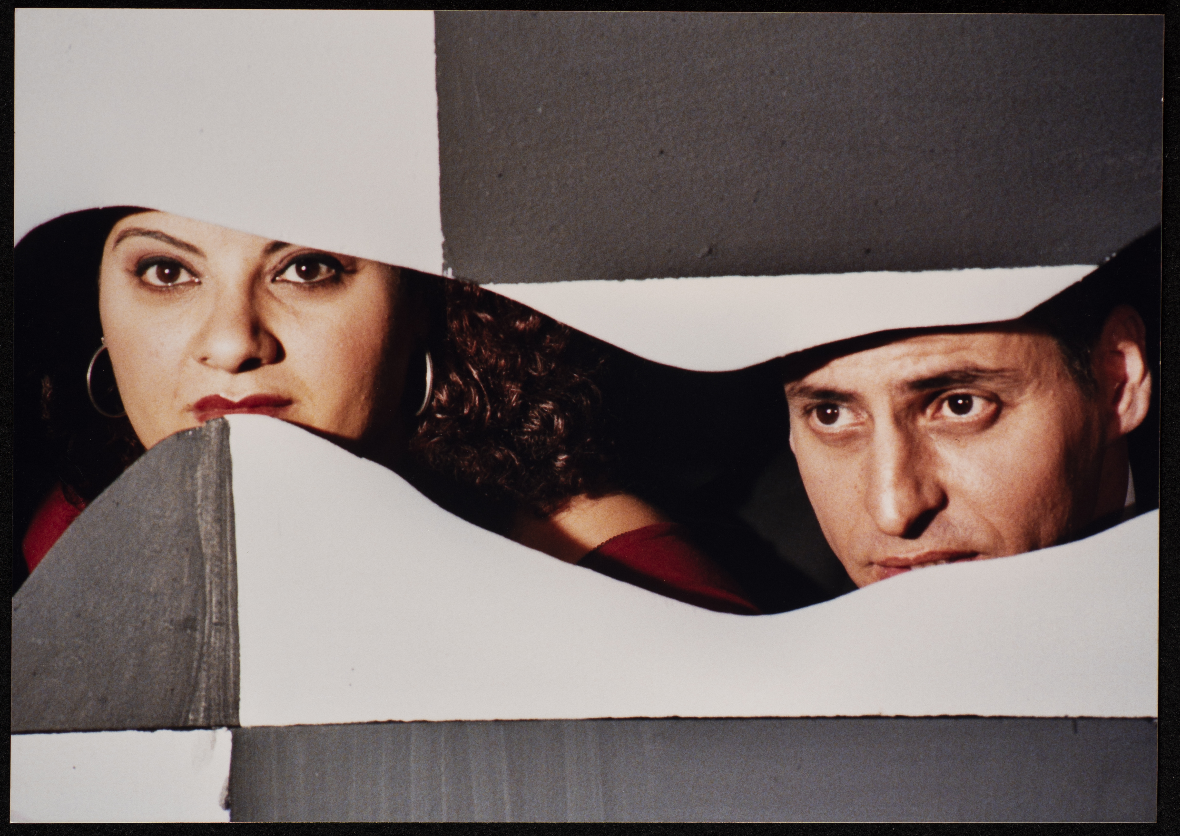 صورة ملونة يظهرفيها جواد عبد الغني ونسرين فاعور وهما ينظران من خلف لوح خشبي خلال أدائهما لأحد مشاهد مسرحية بياض العينين. يذكر أن مسرحية بياض العينين، من انتاج مسرح الميدان عام 2005، وتأليف أيمن إغبارية واخراج منير بكرية، وتدور أحداثها حول حادثة دهس طفل فلسطيني لأبن عامل فلسطيني من مدينة جنين داخل الأراضي المحتلة عام 1948، هذه الحادثة تكشف العديد من الأحداث المسكوت عنها لدى العرب واليهود في الأراضي المحلتة عام 1948.