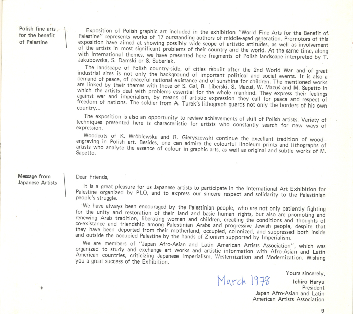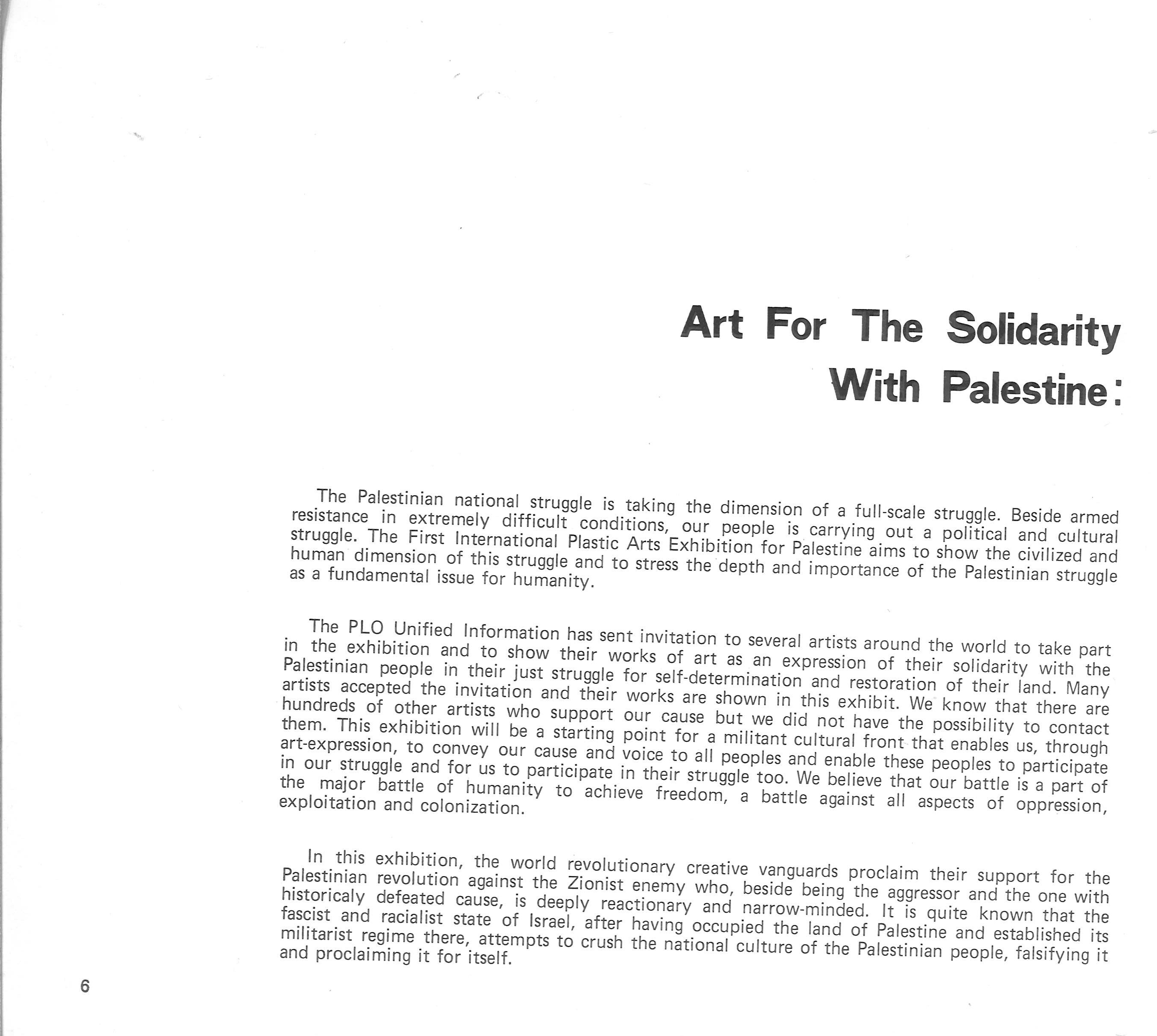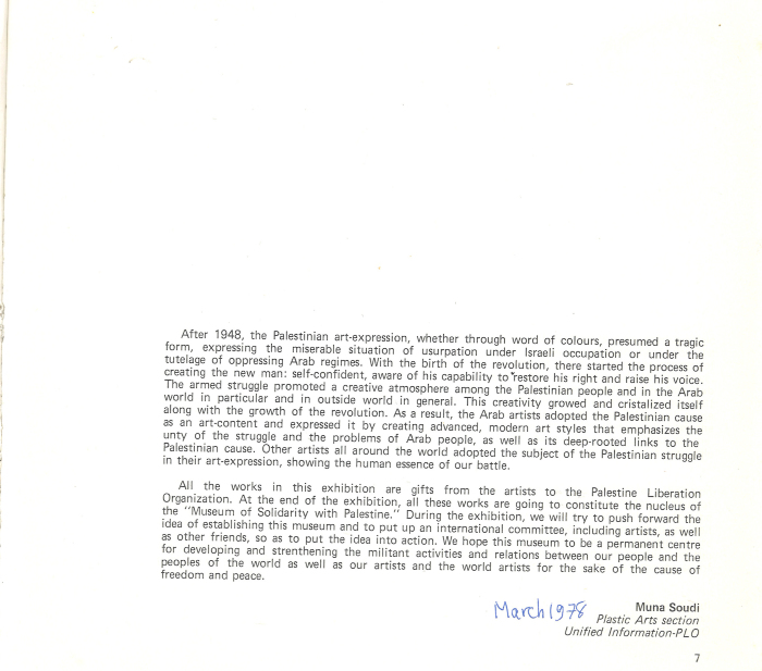 وثيقة مكونة من 4 صفحات تتضمن رسائل تضامنية من مجموعة من الفنانين حول العالم بعد تلقيهم دعوات للمشاركة في المعرض التشكيلي العالمي من أجل فلسطين، الذي انعقد في بيروت في ربيع سنة 1978. إحدى هذه الرسائل من روبيرتو ماتا، فنان تشيلي، والتي يتحدث فيها عن دور الفن كسياسة في التعبير عن التضامن مع الفلسطينيين، وضرورة تشكيل جبهة ثقافية وهو موضوع ناقشه، كما يذكر في الرسالة، مع سعيد حمامي، سياسي فلسطيني. كما تتضمن الرسائل رسالة من مجموعة من الفنانيين البولنديين ومجموعة من الفنانيين اليابانيين، ورسالة من الفنانة الأردنية منى السعودي بعنوان "فن من أجل التضامن مع فلسطين."