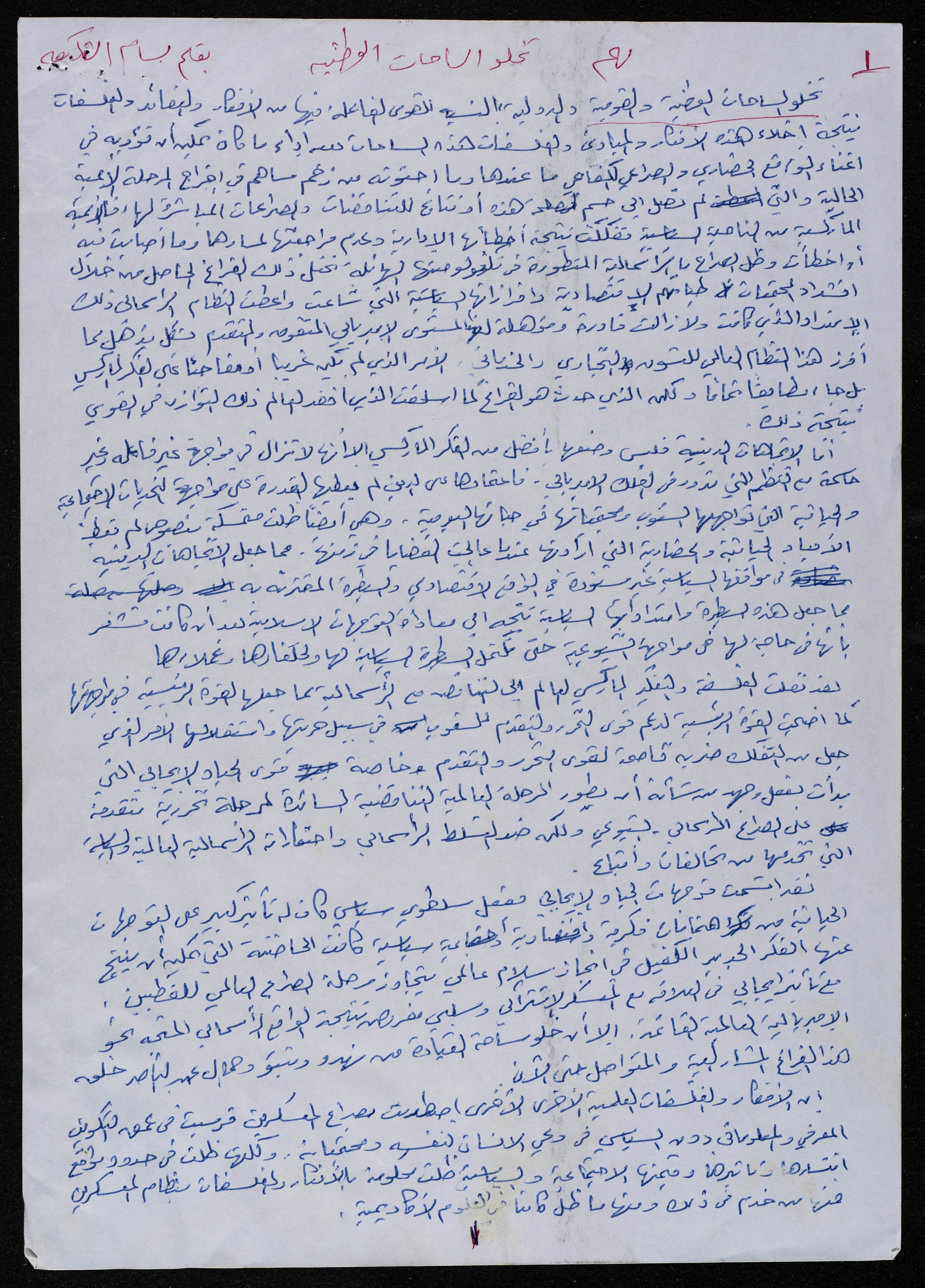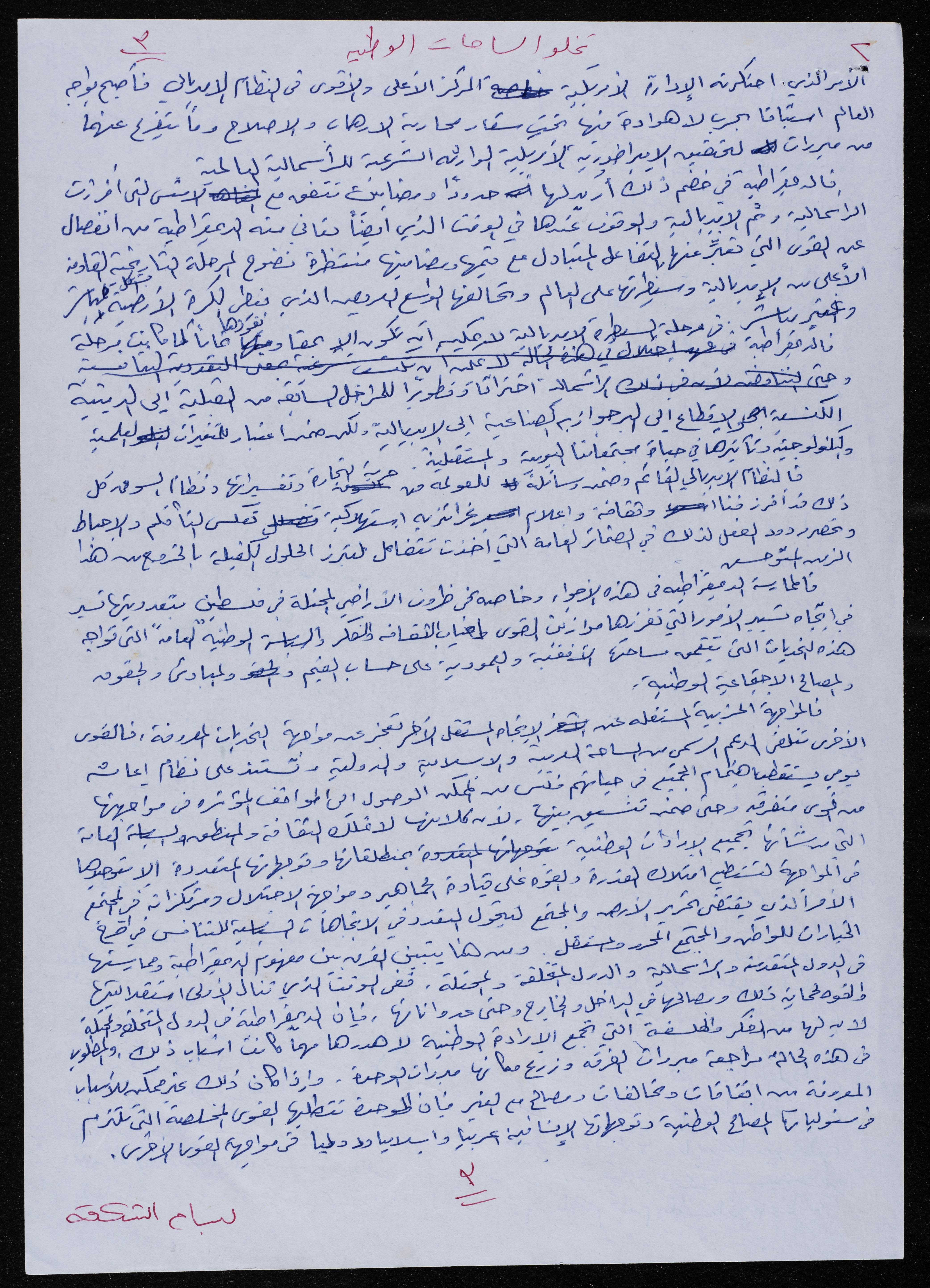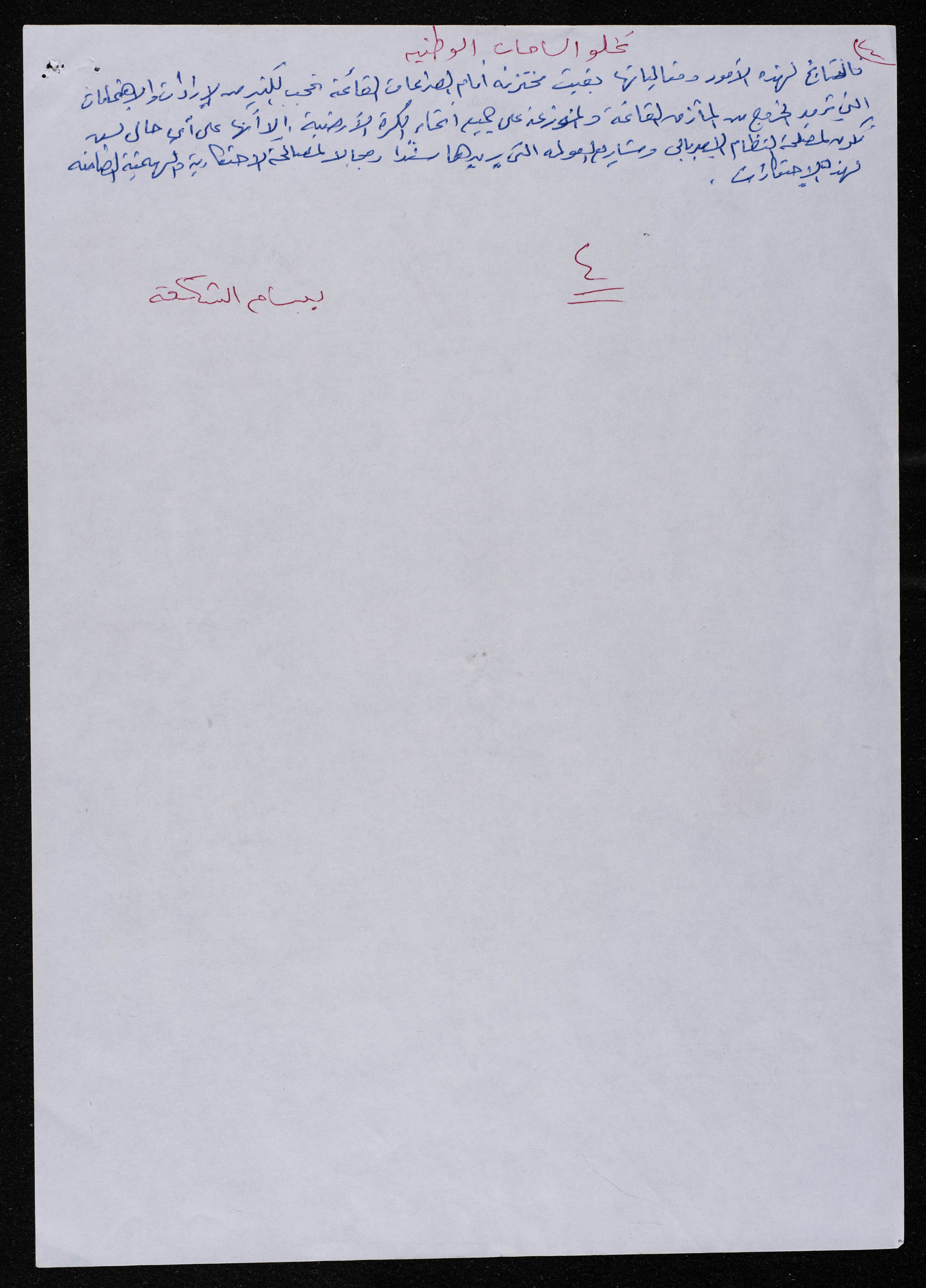 كتبت باللغة العربية وبخط اليد، تعكس هذه الوثيقة مسودة مقال مكونة من أربع صفحات، كتبها بسام الشكعة، يتحدث فيها عن خلو الساحات الوطنية والقومية والدولية فيما يتعلق بموضوع القوى الفاعلة وافتقارها للمبادئ والعقائد وفلسفات أساسية.