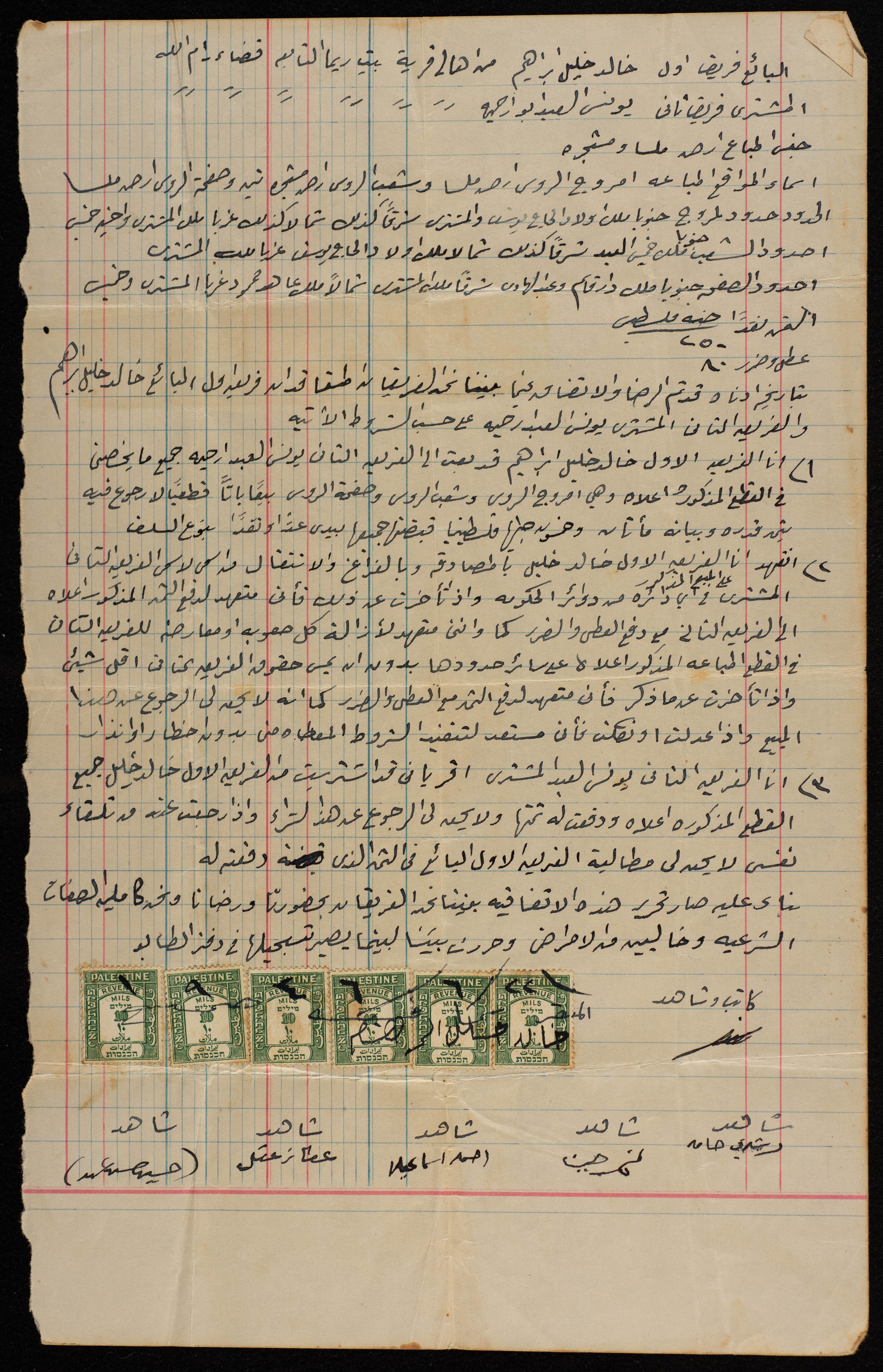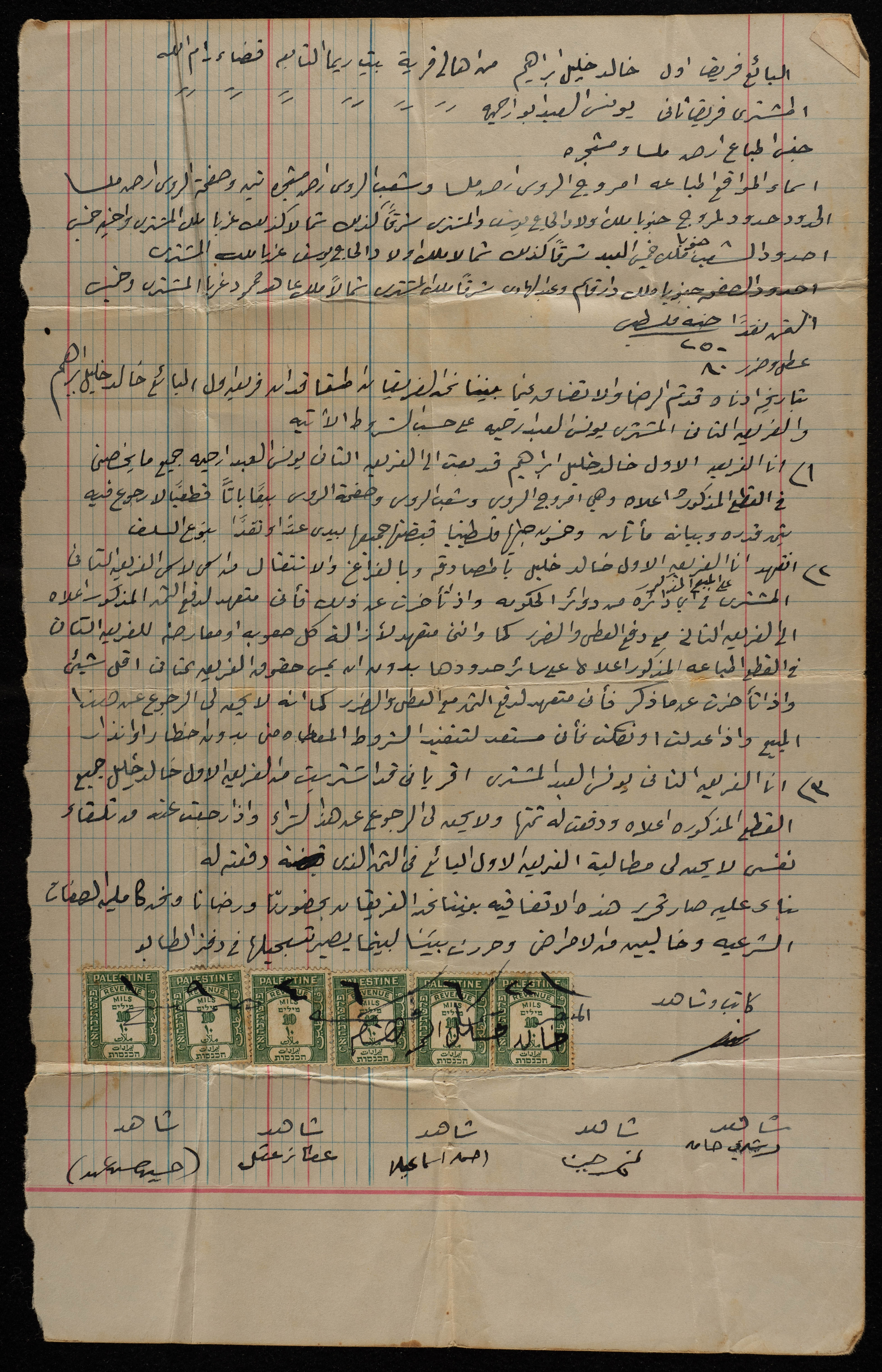 Found in Umar Shafiq ar-Rimawy Collection, this handwritten land deed was signed by Khalid Khalil selling a piece of land in Beit Rima to Yunis abu Irhaima on June 22, 1946. Ahmad Ismaʿil, Ata Zaʿtar, and others signed the deed as witnesses.