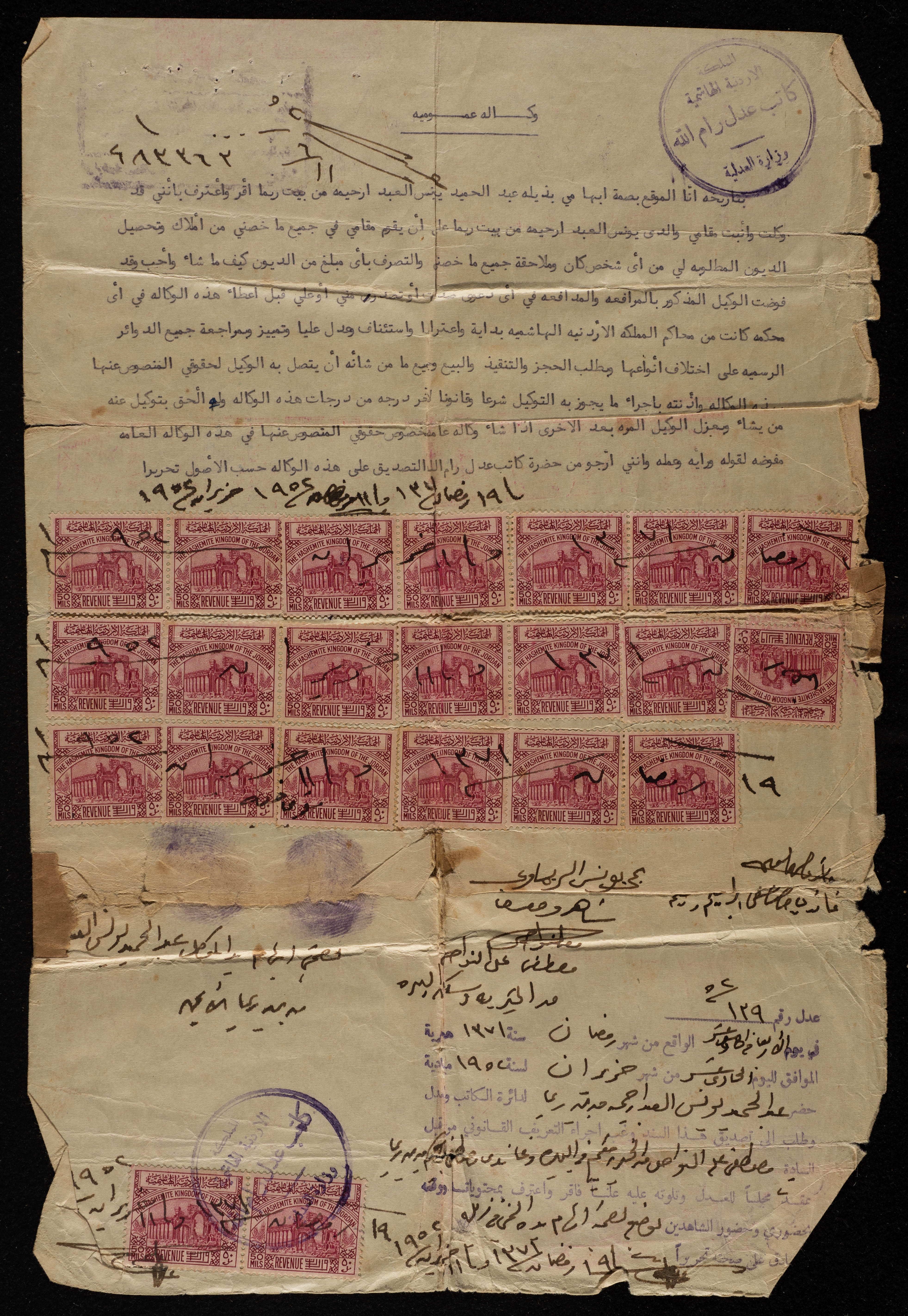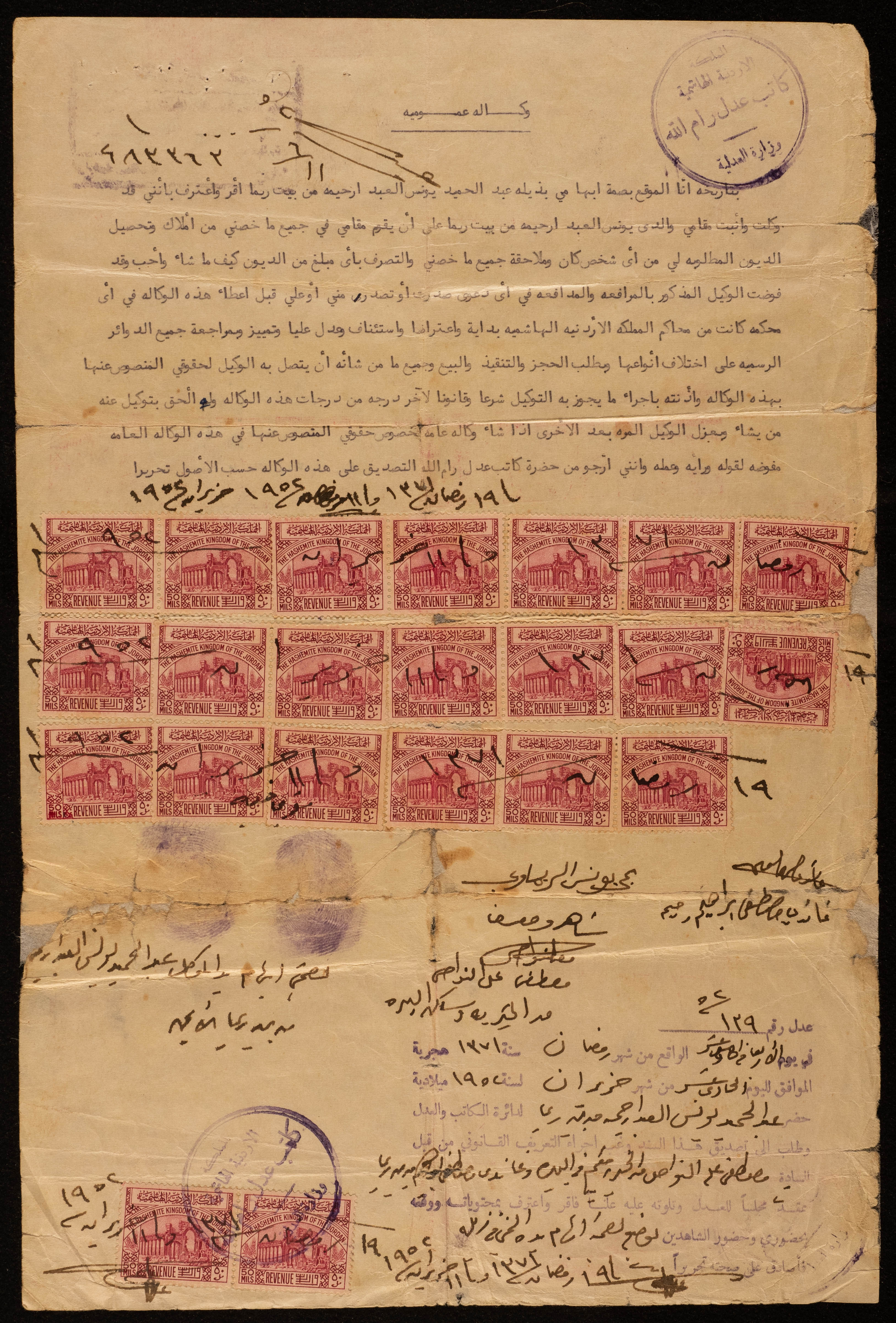 وثيقة مطبوعة باللغة العربية، تتضمن وكالة عبد الحميد ارحيمه من بيت ريما لوالده يونس العبد ارحيه من بيت ريما على ان يكون مسؤول عن جميع املاكه وتحصيل الديون المطلوبة من اي شخص والتصرف بأي مبلغغ من الديون وشهد بذلك يحيى يونس الريماوي بتاريخ 11حزيران 1952. وجدت في مجموعة عمر شفيق الريماوي