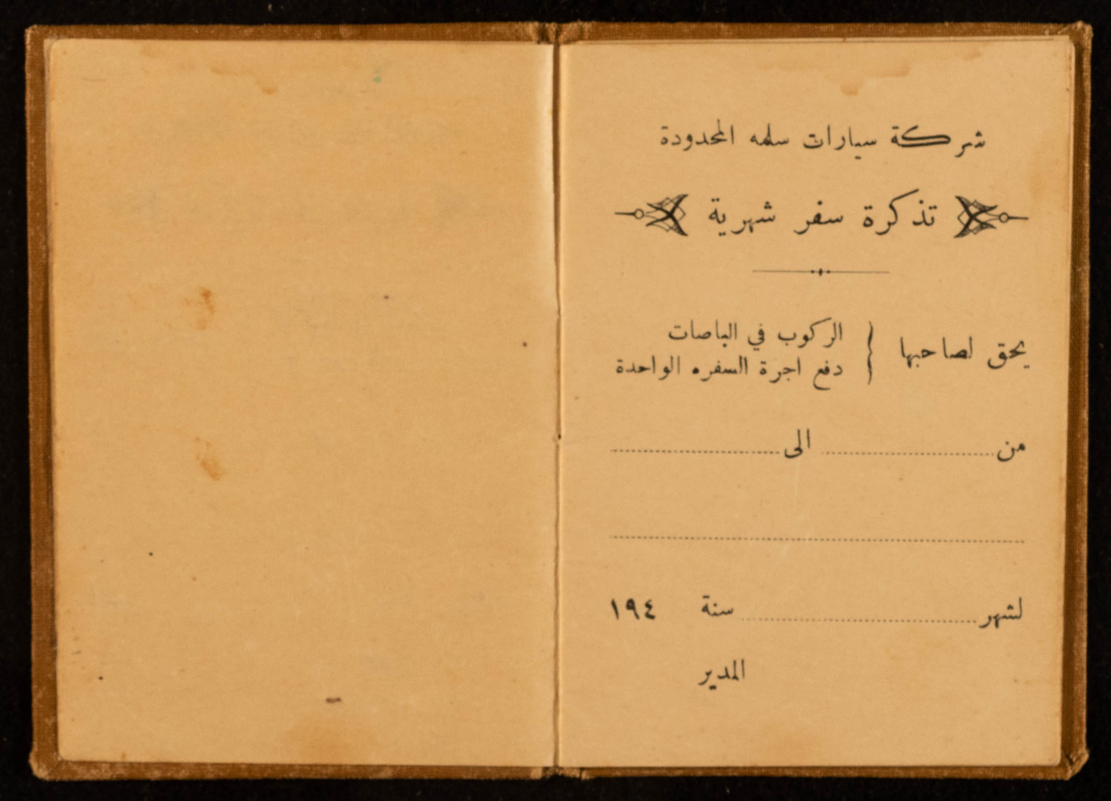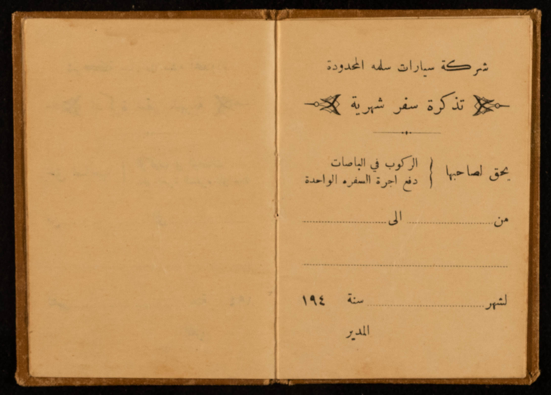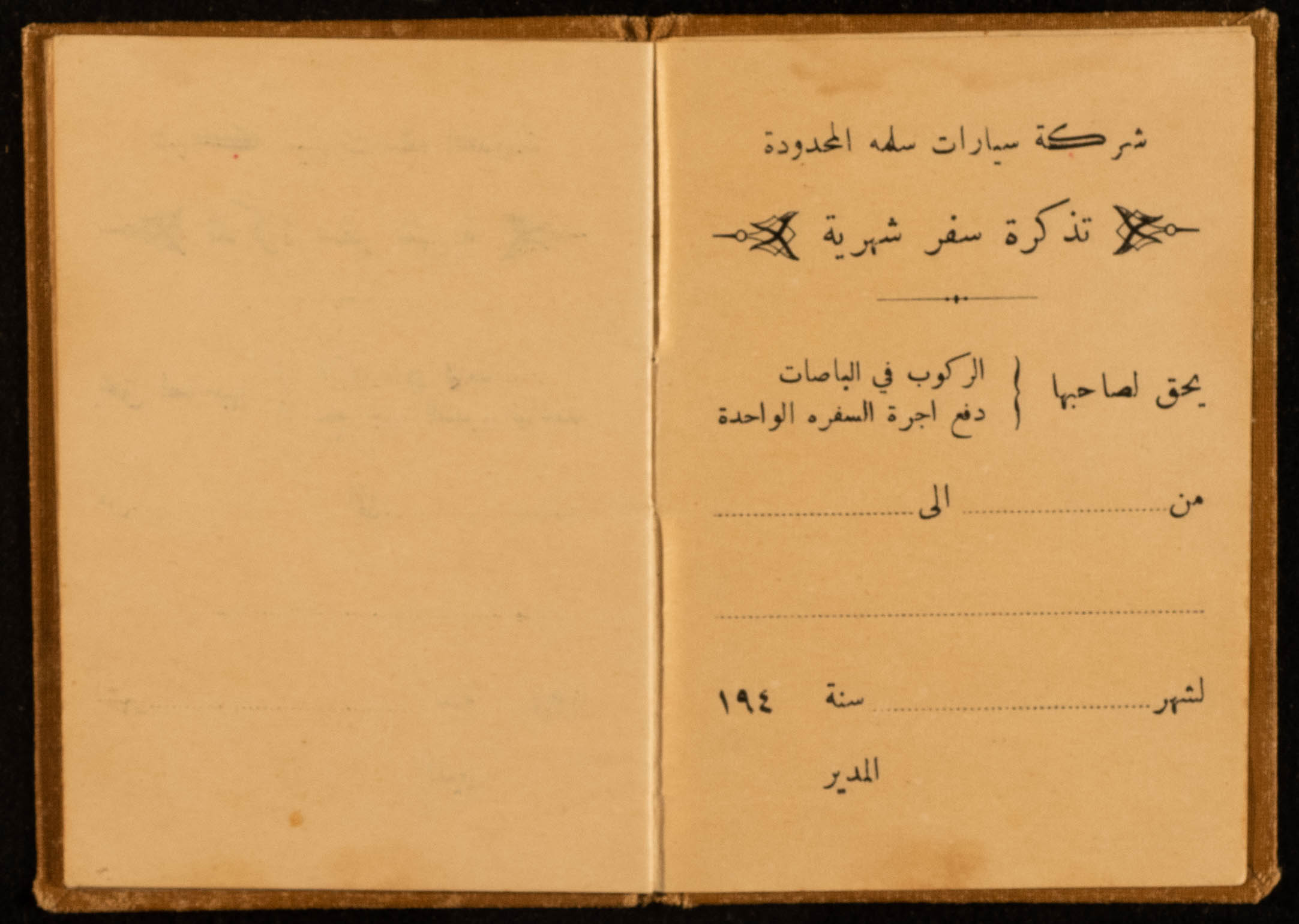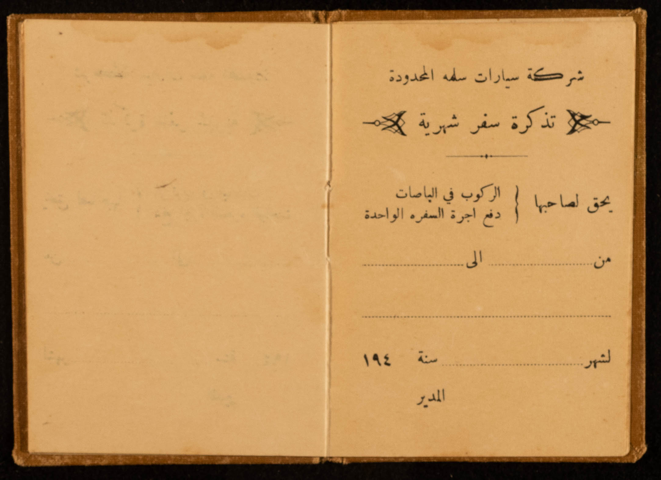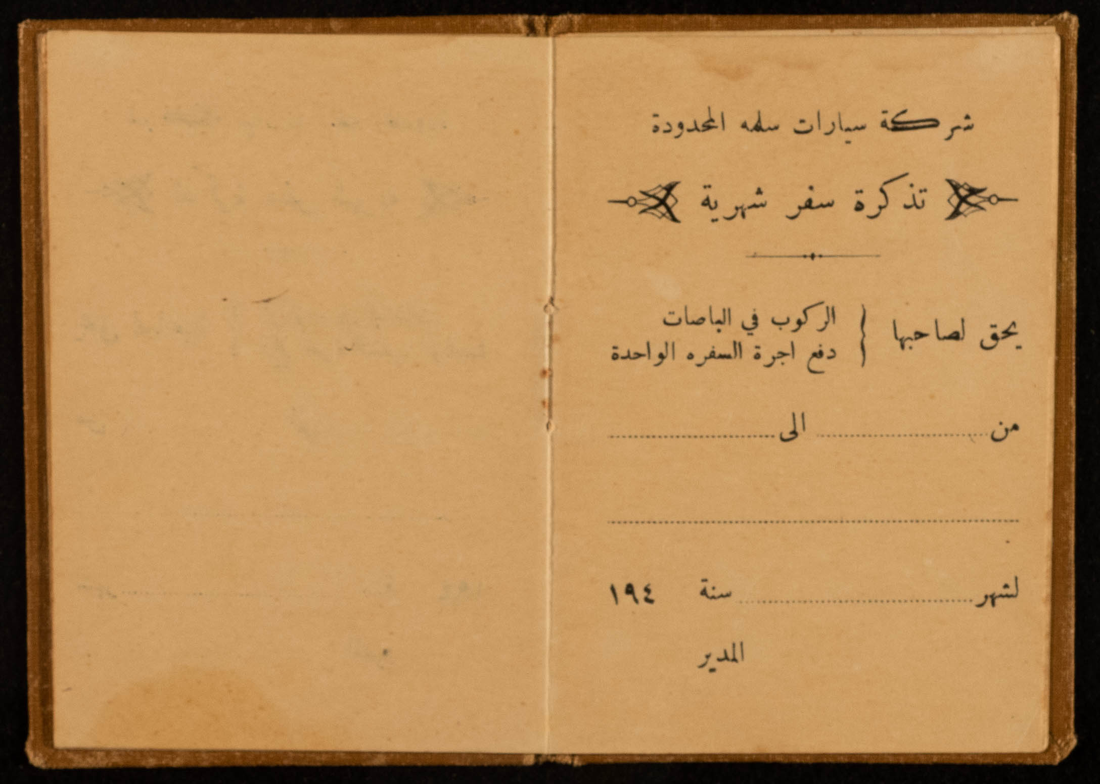 وثيقة مطبوعة باللغة العربية، تتضمن تذكرة سفر شهرية ليونس العبد ارحيمه الريماوي صادرة عن شركة سيارات سلمة المحدودة حيث يحق له الركوب في الباصات من بيت ريما الى يافا. وجدت في مجموعة عمر شفيق الريماوي