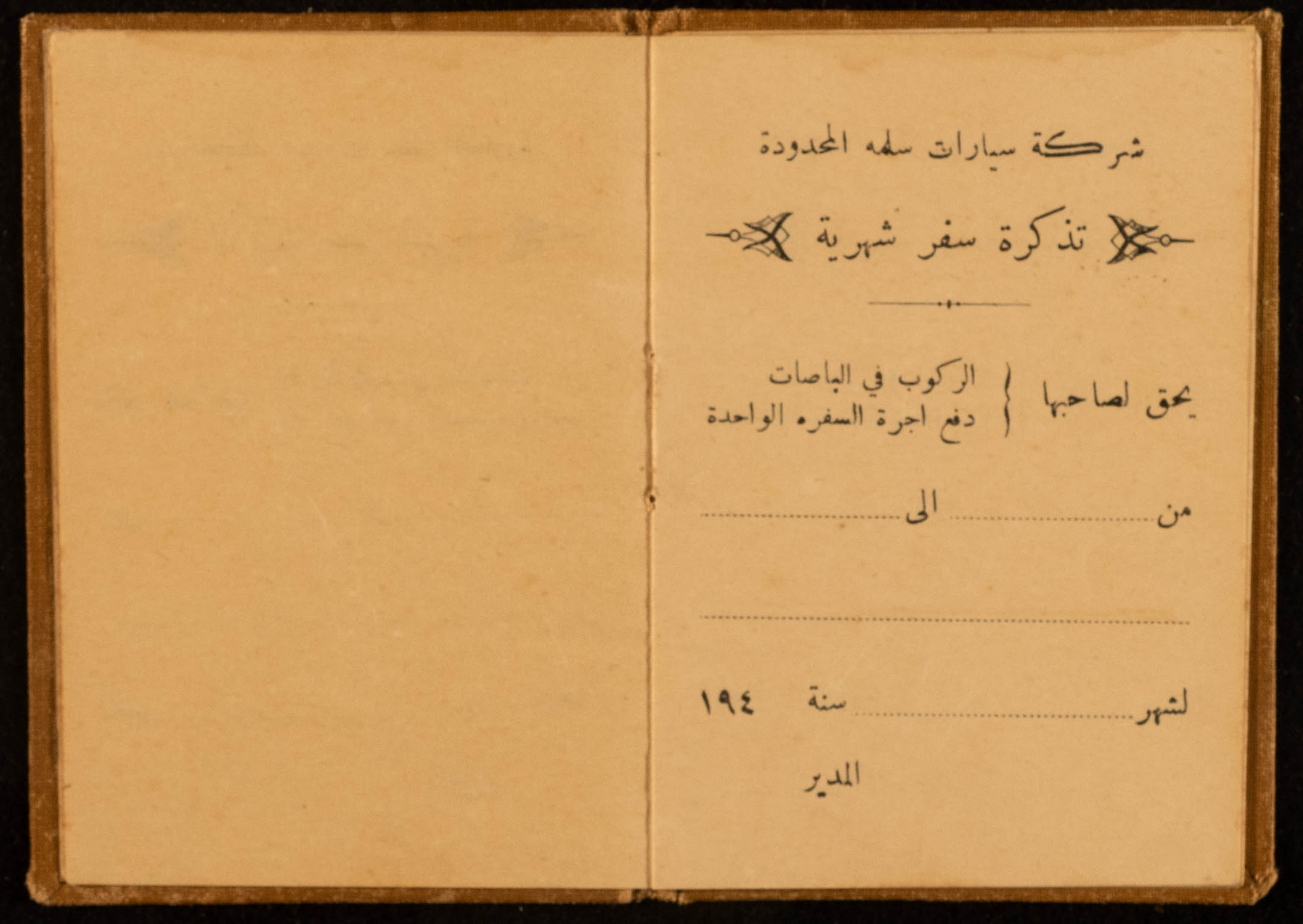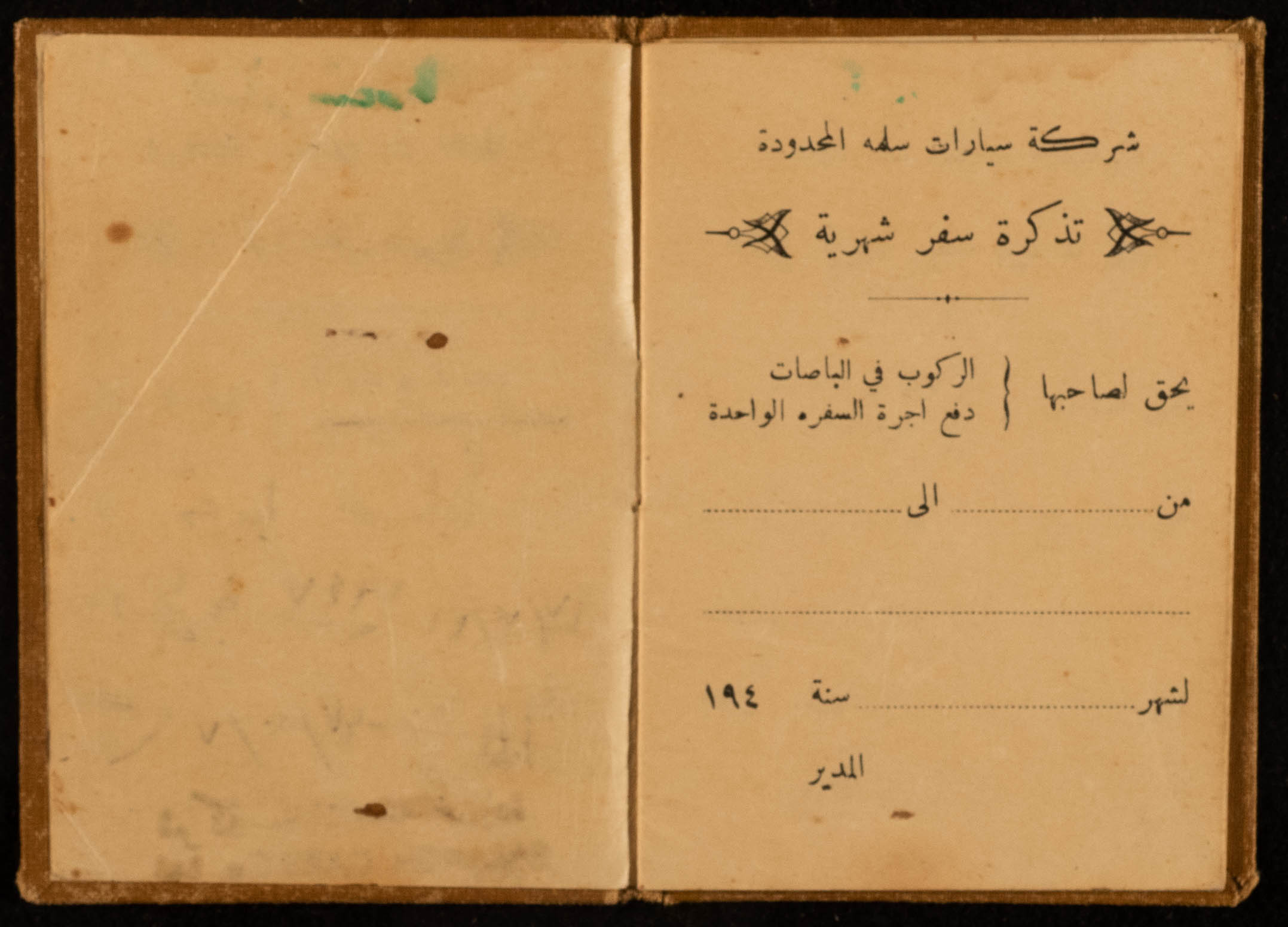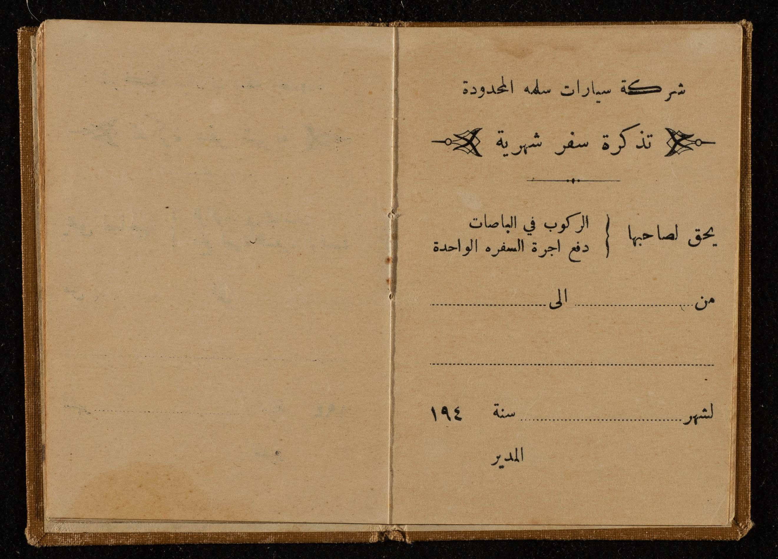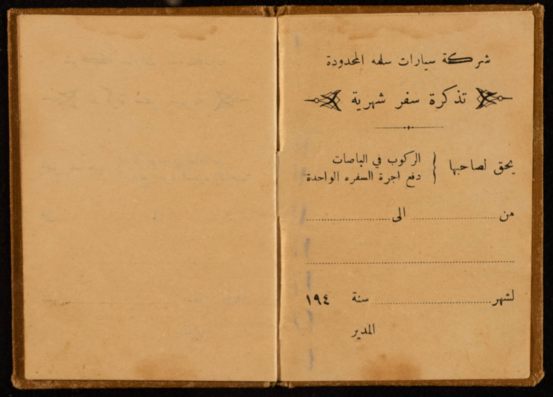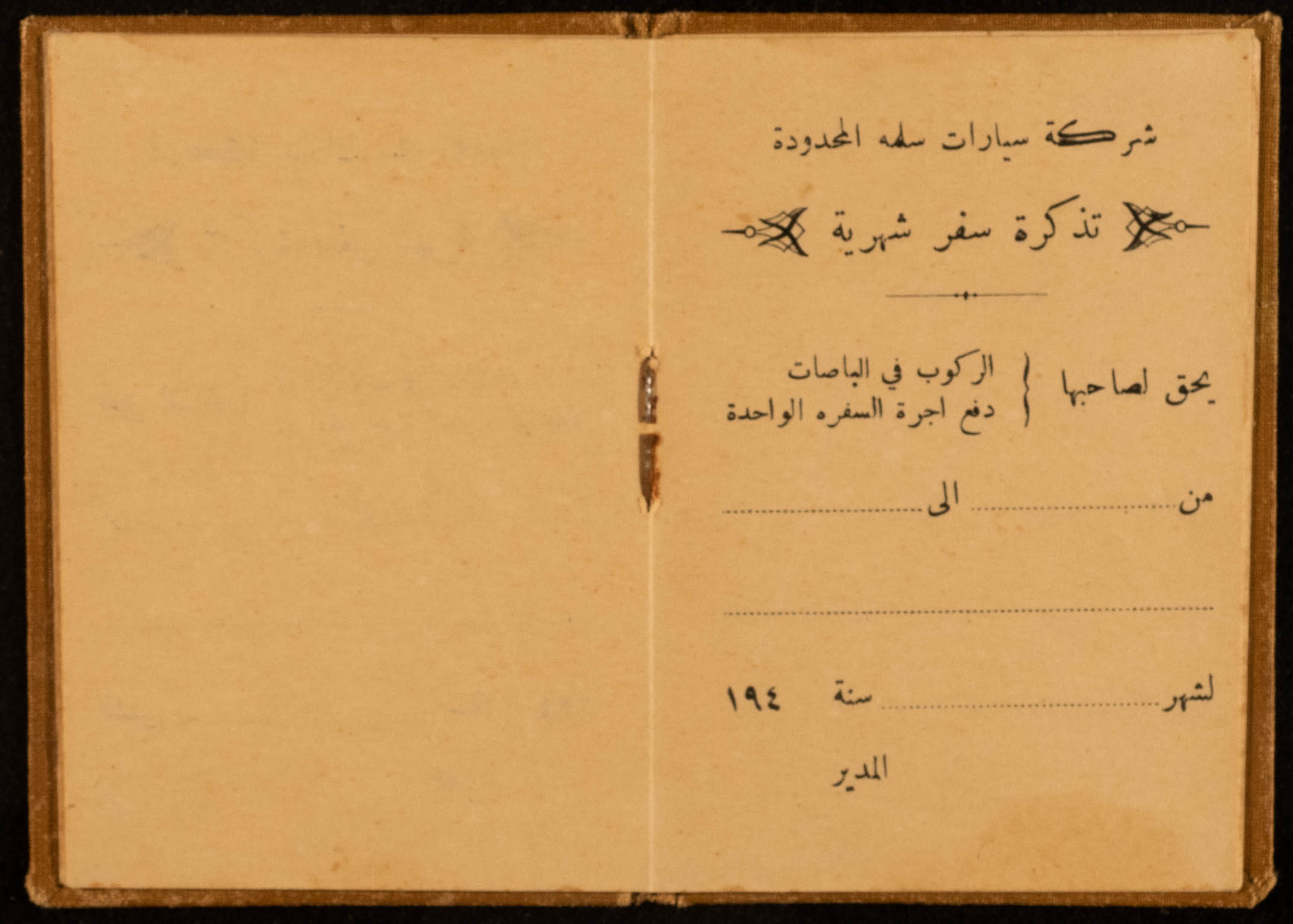 وثيقة مطبوعة باللغة العربية، تتضمن تذكرة سفر شهرية ليونس العبد ارحيمه الريماوي صادرة عن شركة سيارات سلمة المحدودة حيث يحق له الركوب في الباصات من بيت ريما الى يافا. وجدت في مجموعة عمر شفيق الريماوي