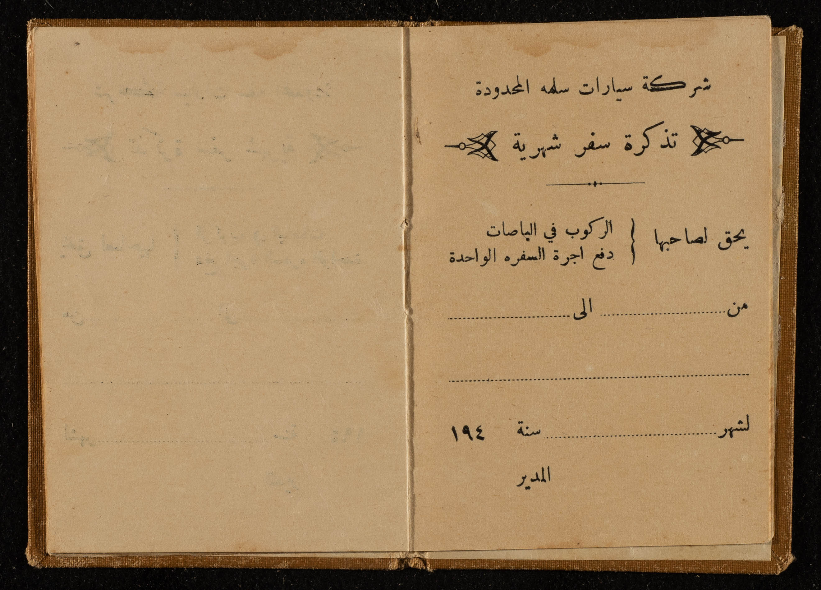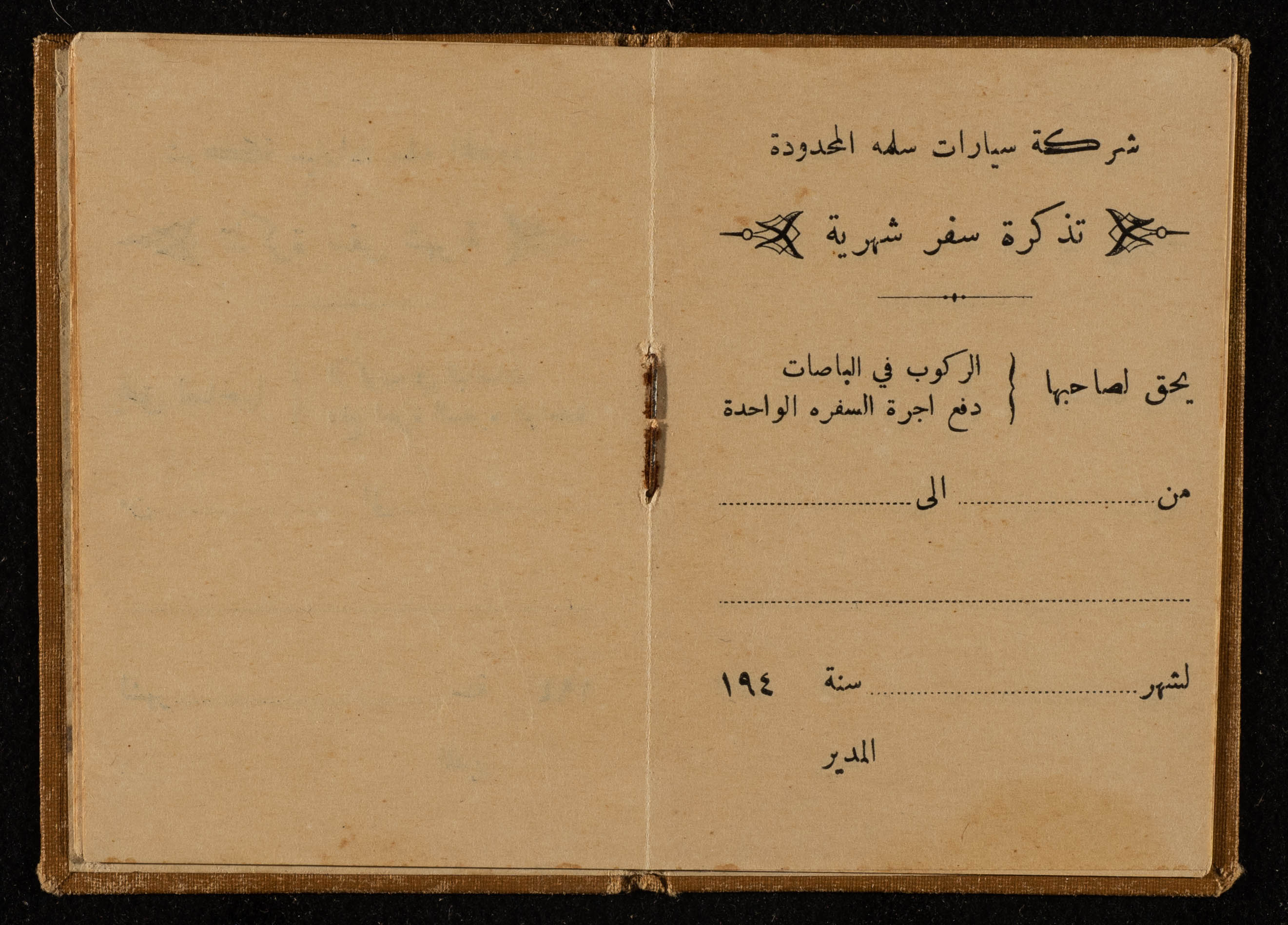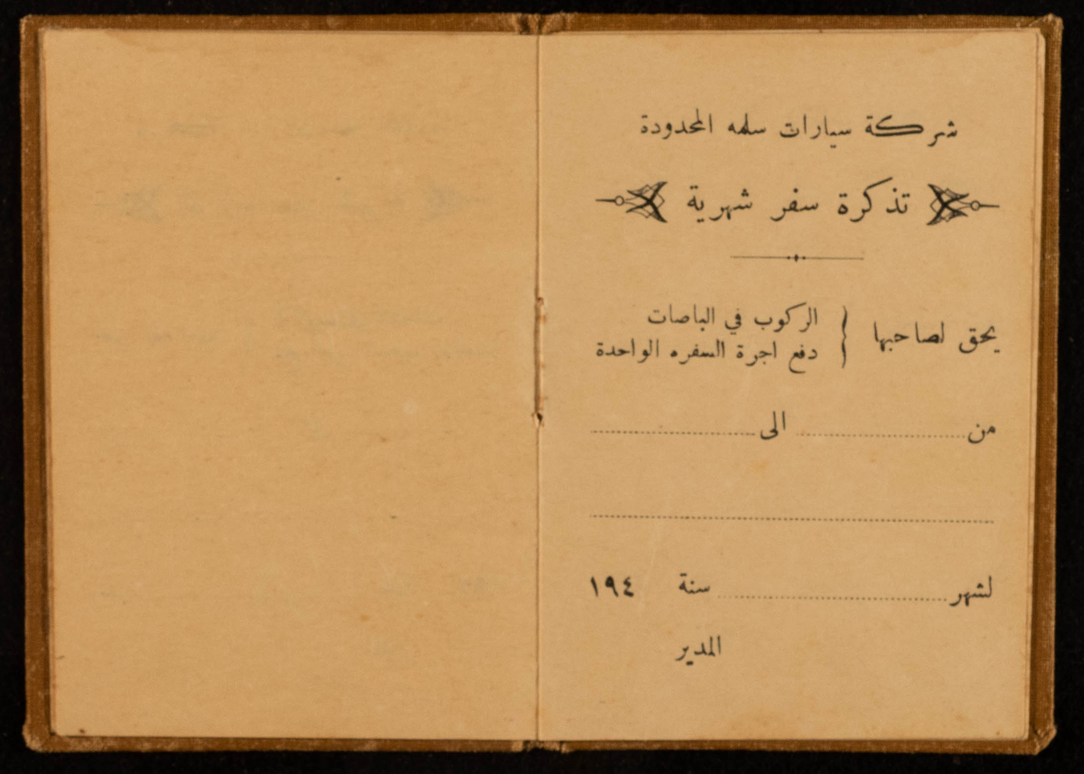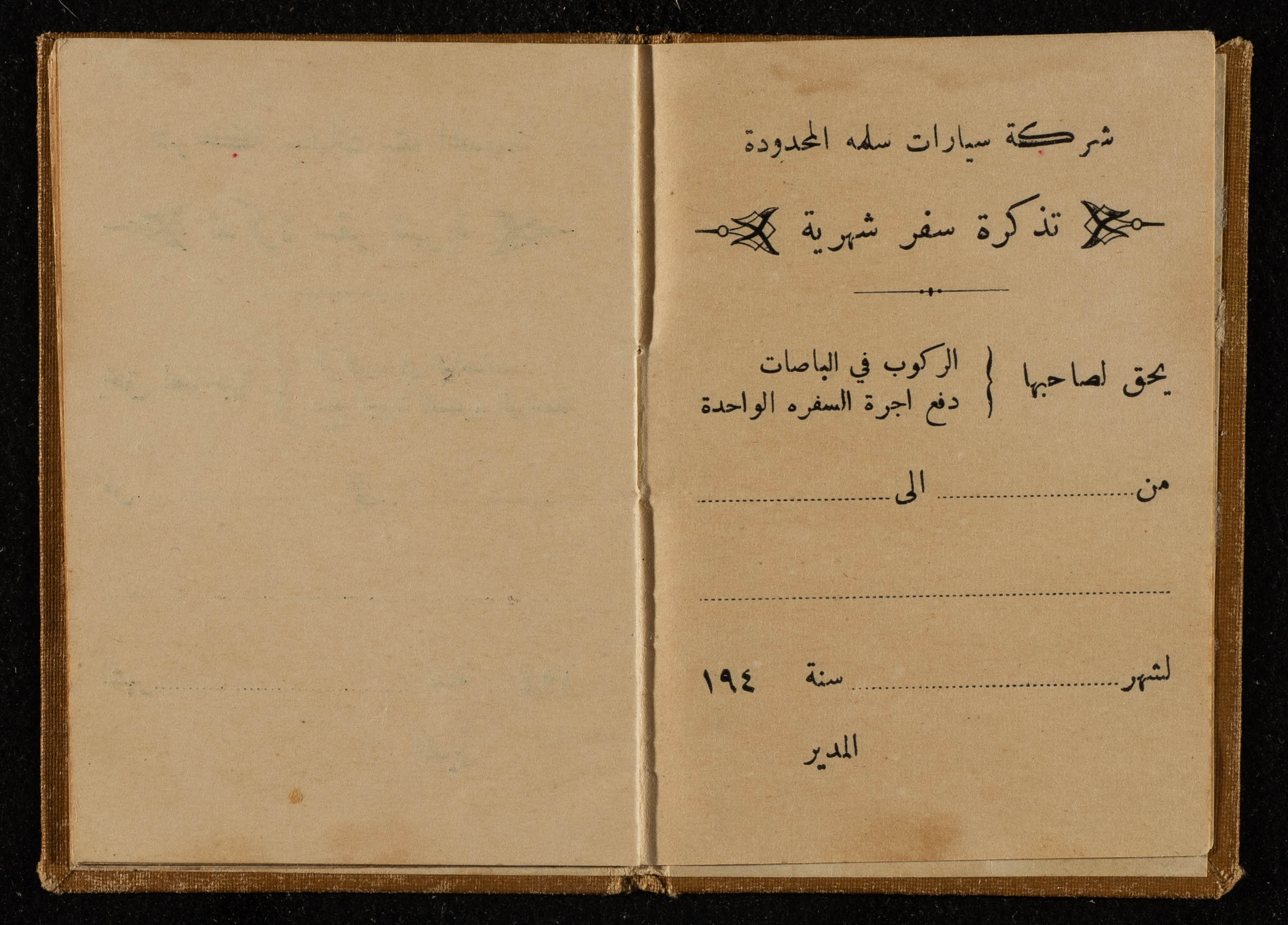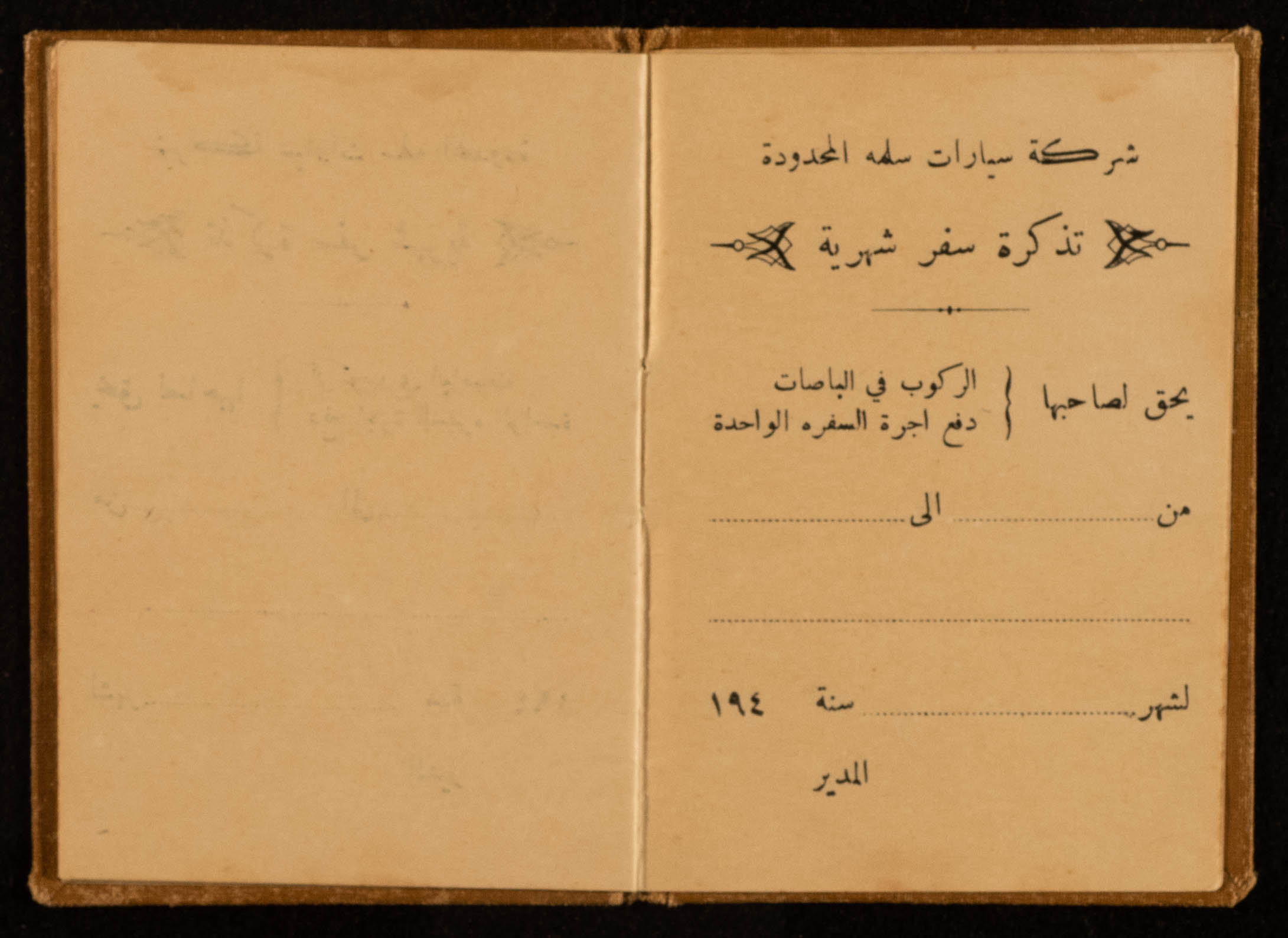 وثيقة مطبوعة باللغة العربية، تتضمن تذكرة سفر شهرية ليونس العبد ارحيمه الريماوي صادرة عن شركة سيارات سلمة المحدودة حيث يحق له الركوب في الباصات من بيت ريما الى يافا. وجدت في مجموعة عمر شفيق الريماوي