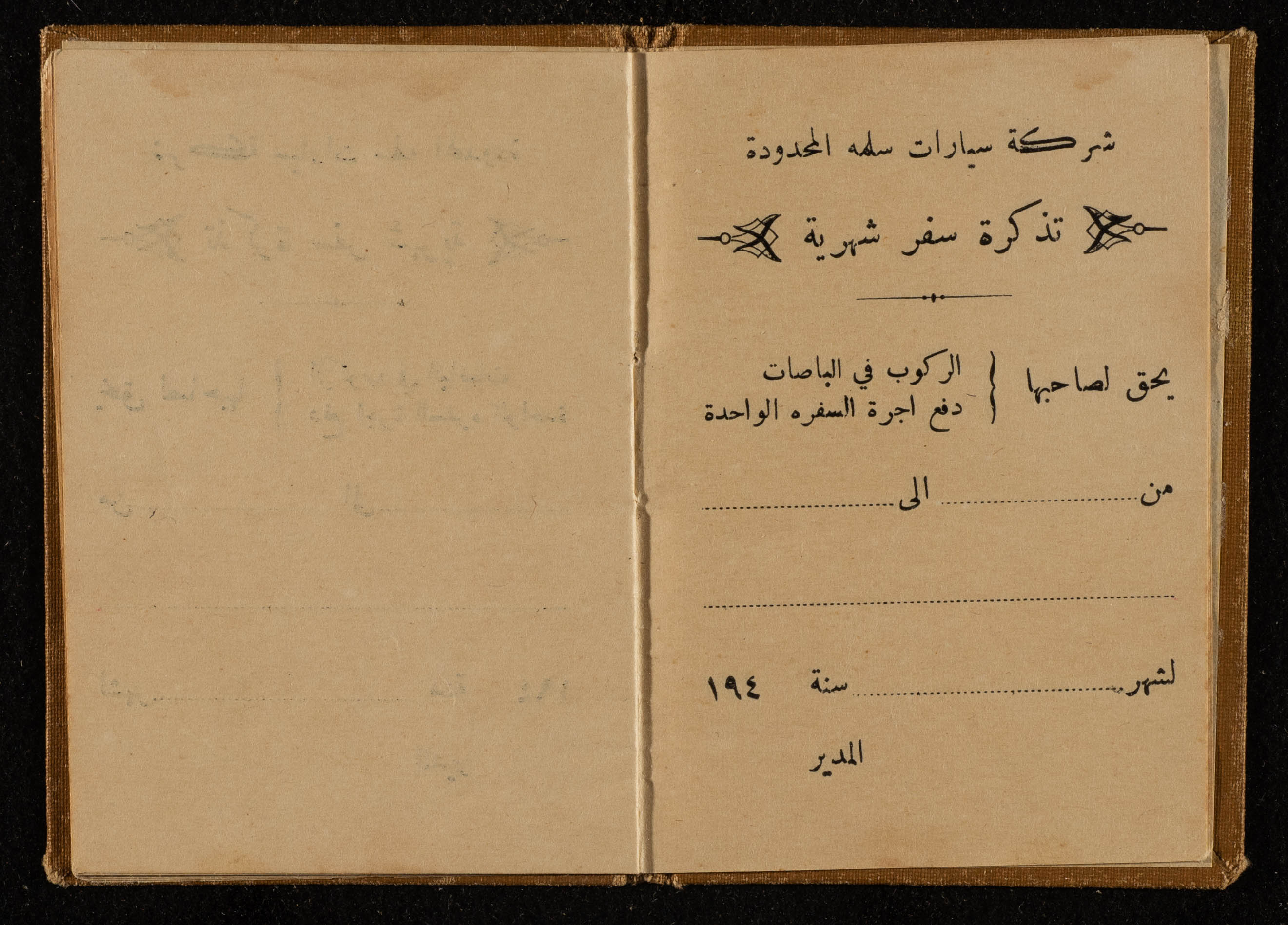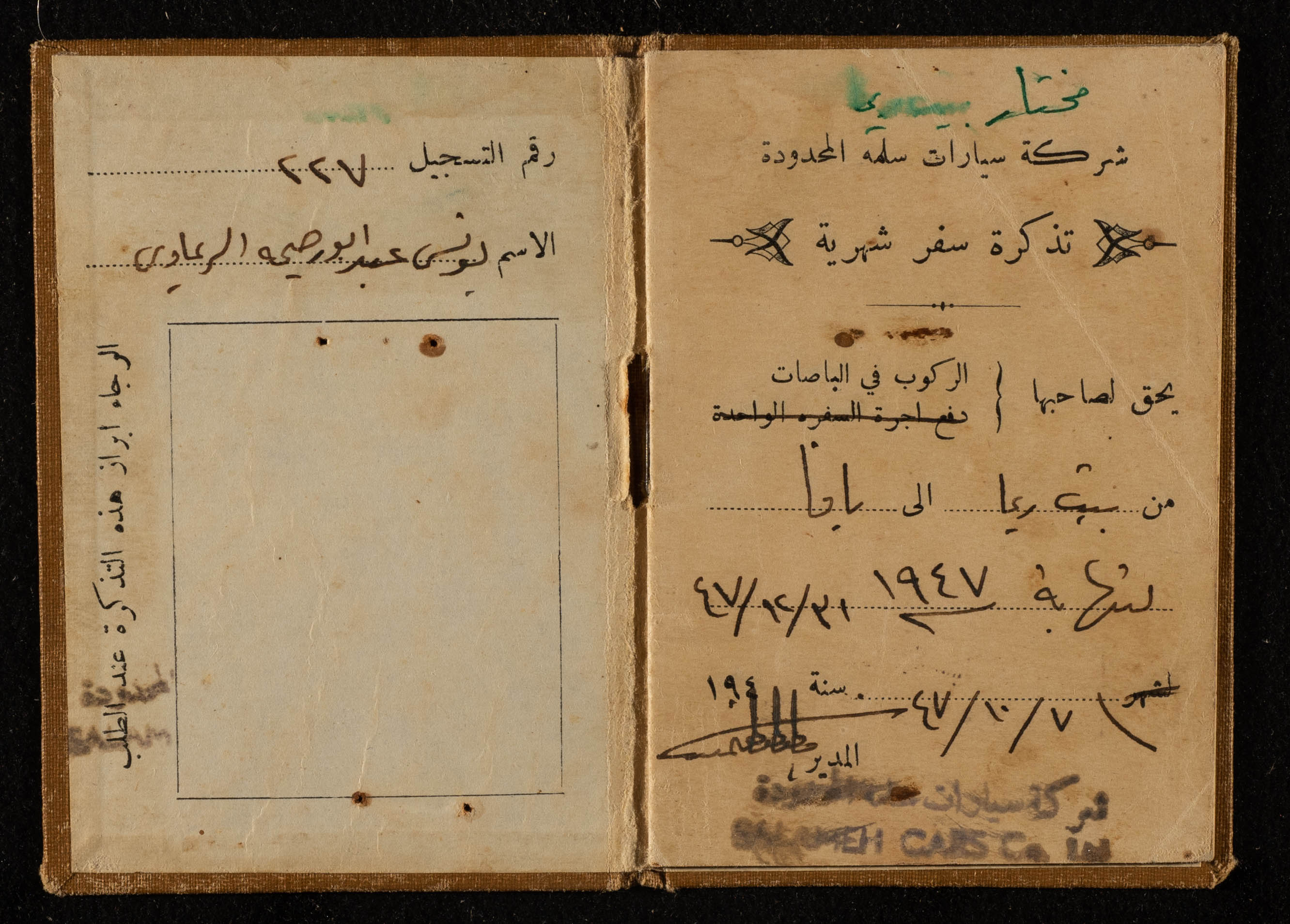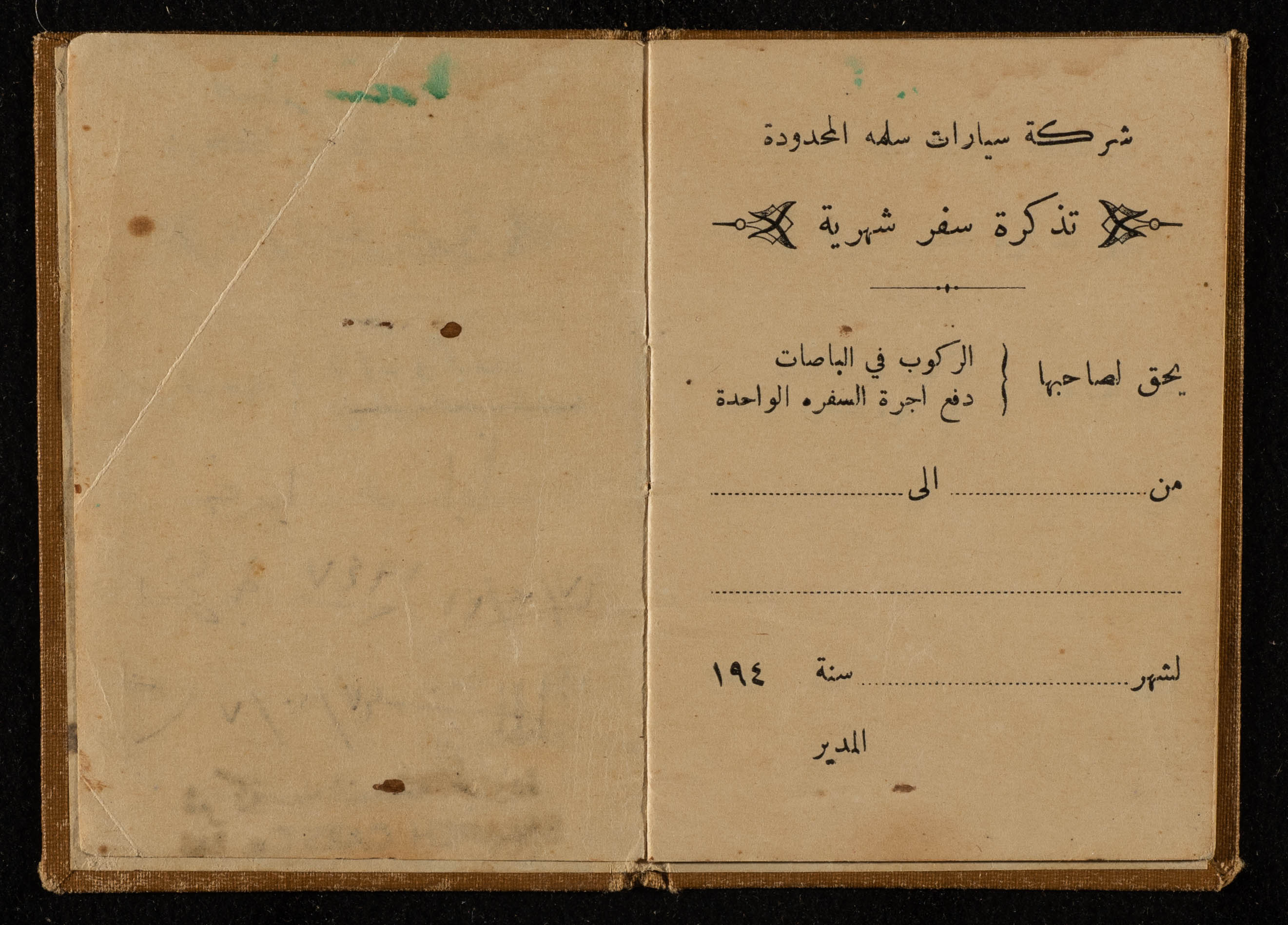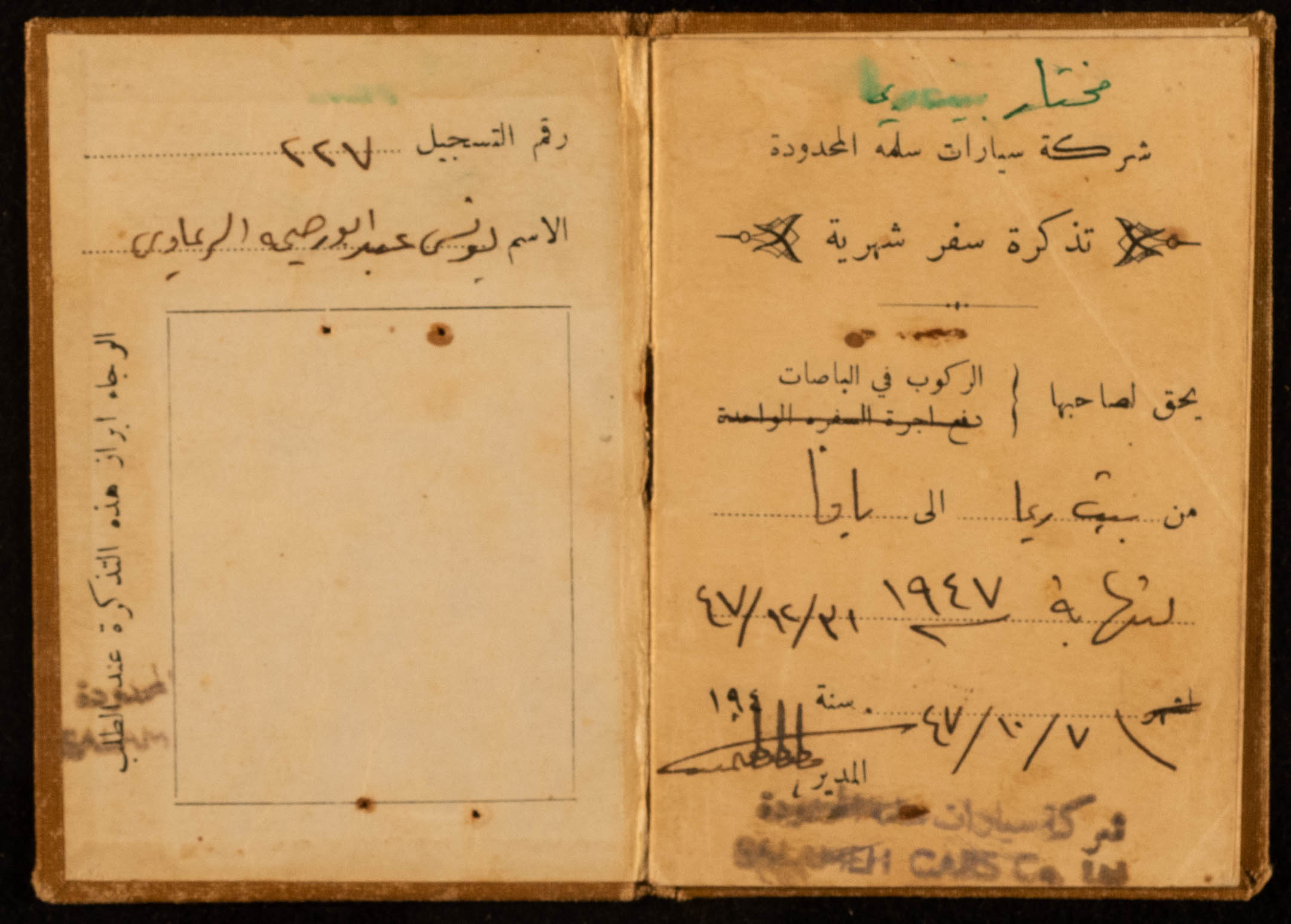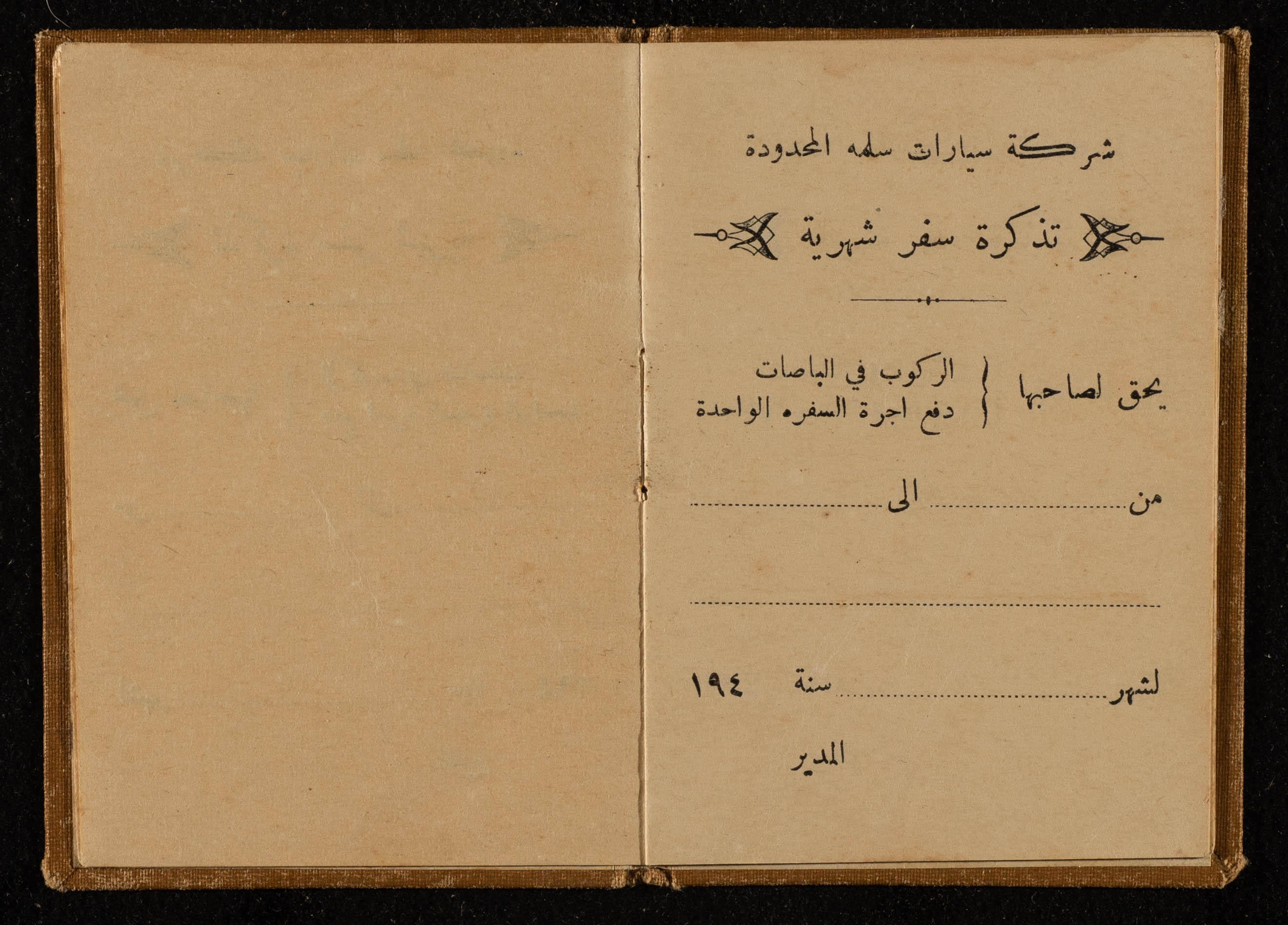 وثيقة مطبوعة باللغة العربية، تتضمن تذكرة سفر شهرية ليونس العبد ارحيمه الريماوي صادرة عن شركة سيارات سلمة المحدودة حيث يحق له الركوب في الباصات من بيت ريما الى يافا. وجدت في مجموعة عمر شفيق الريماوي