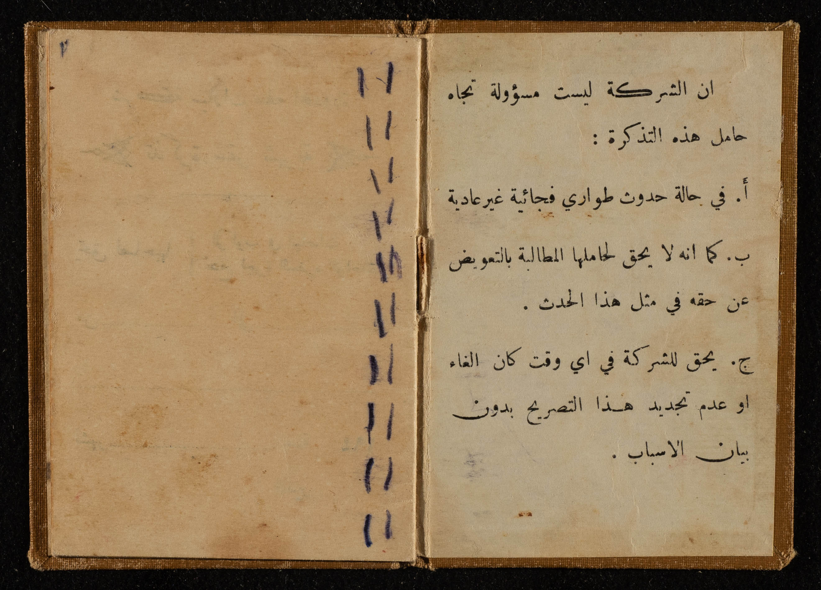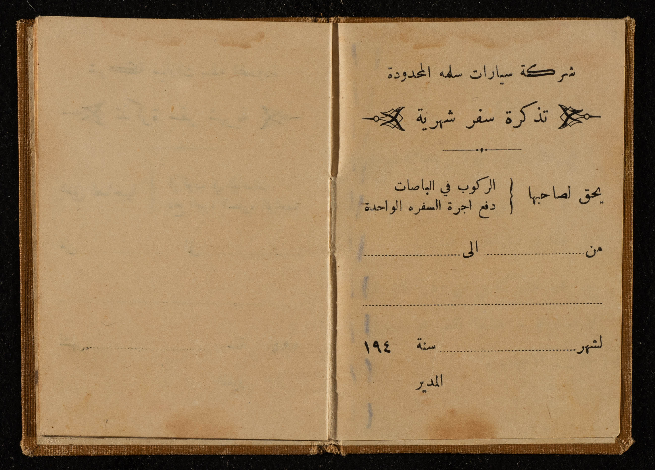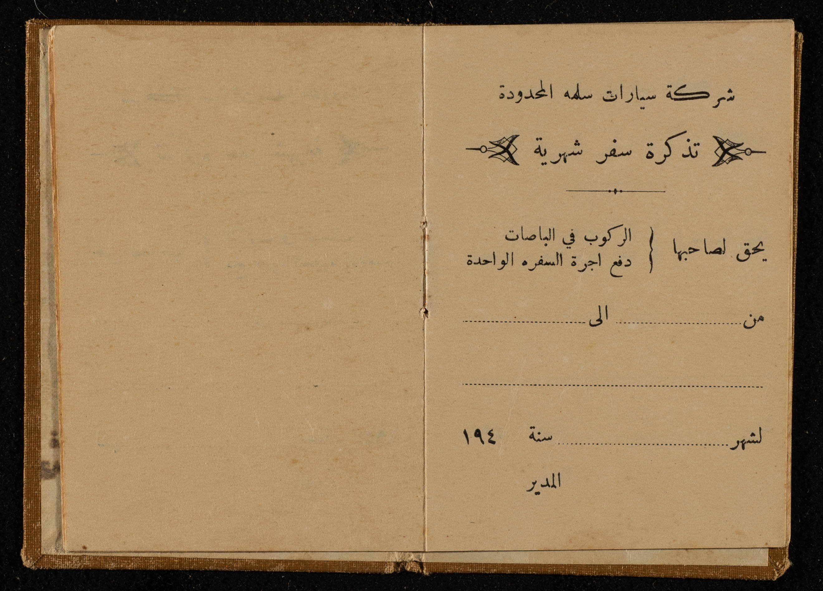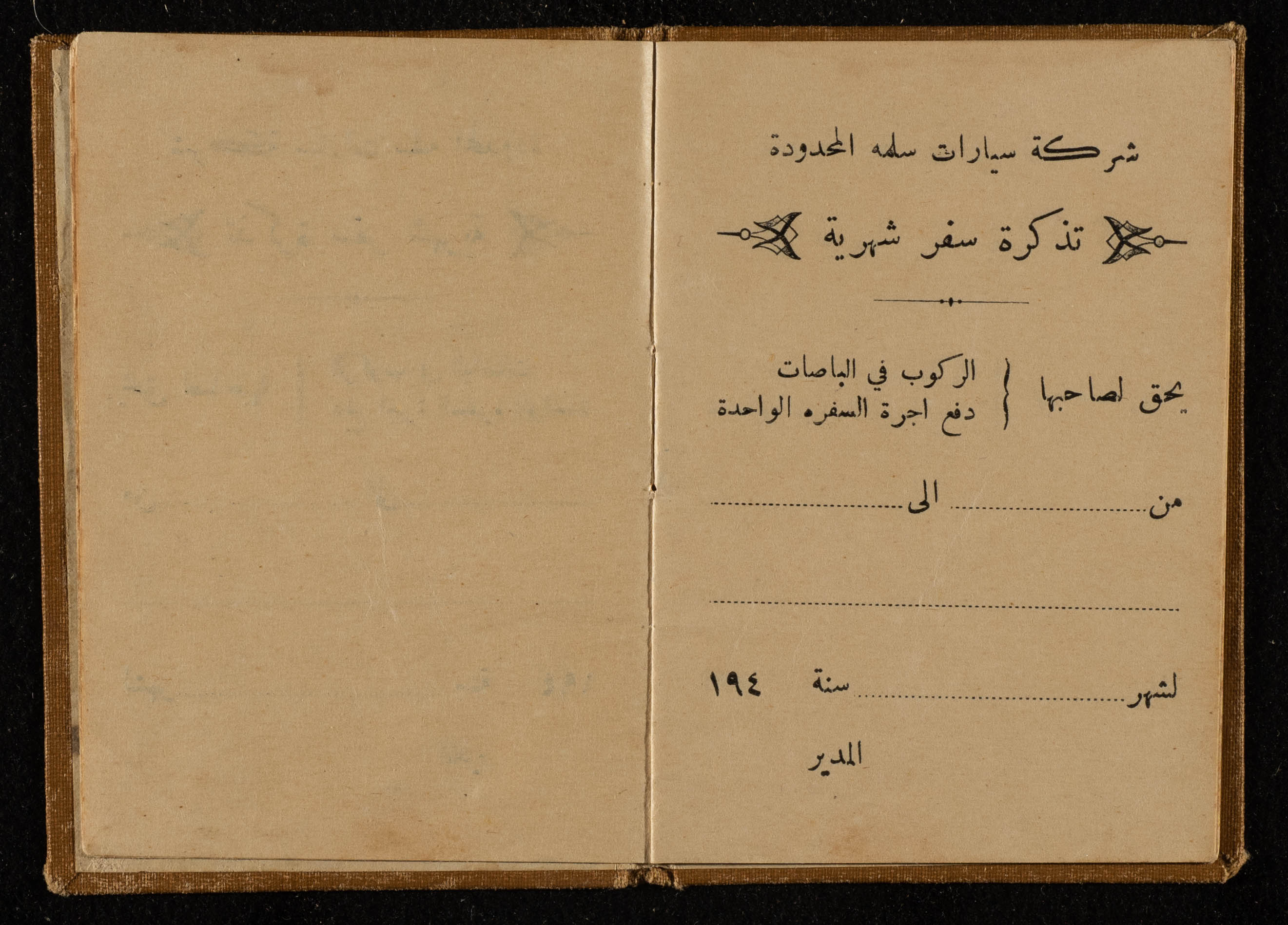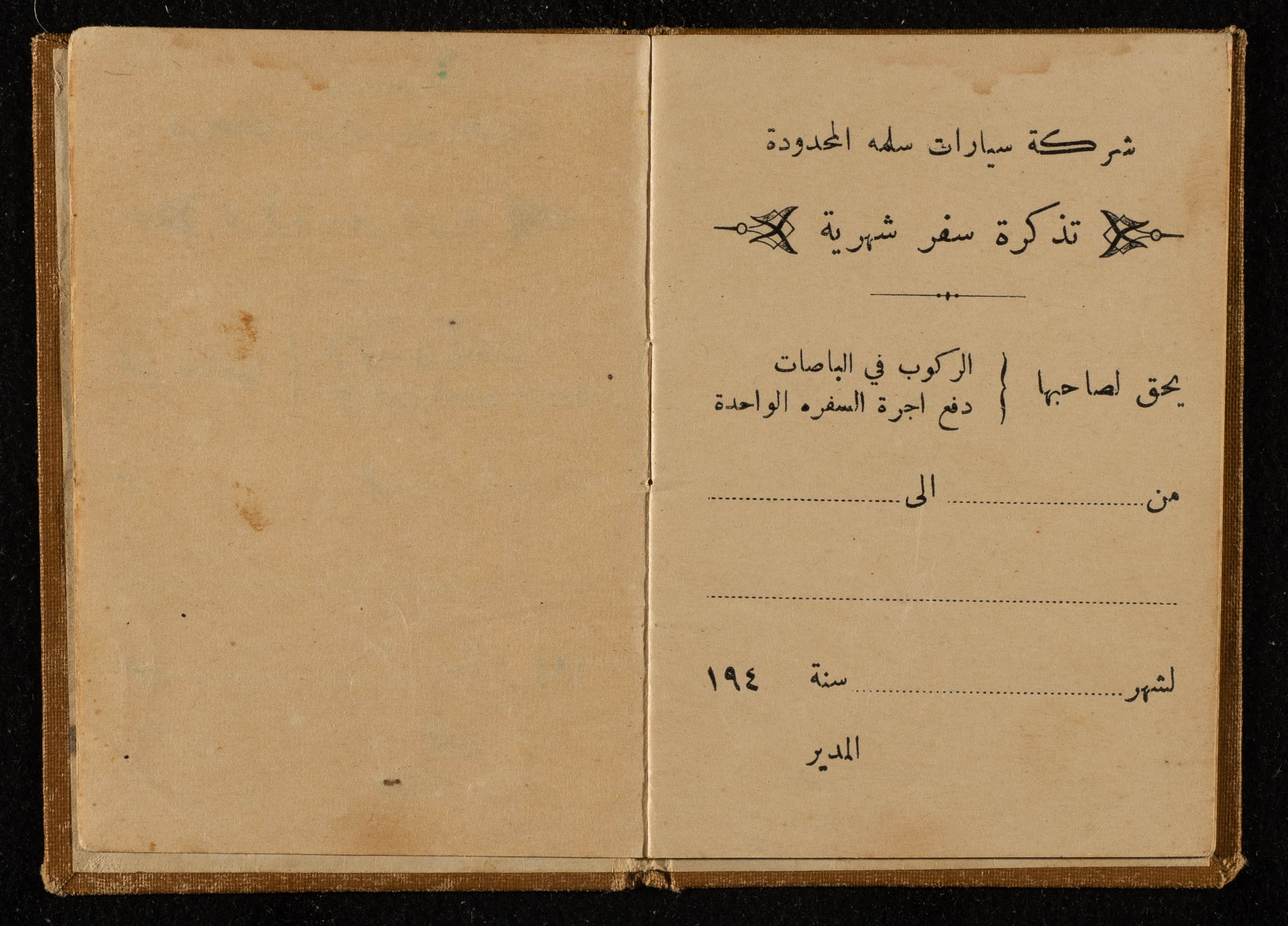 وثيقة مطبوعة باللغة العربية، تتضمن تذكرة سفر شهرية ليونس العبد ارحيمه الريماوي صادرة عن شركة سيارات سلمة المحدودة حيث يحق له الركوب في الباصات من بيت ريما الى يافا. وجدت في مجموعة عمر شفيق الريماوي