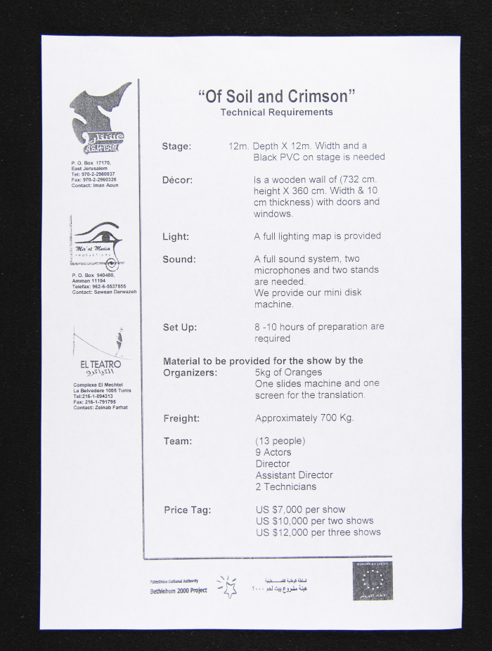 Printed in English, this document features a list of all technical requirements needed for the implementation of "Of Soil and Crimson", a paly by Ashtar Theatre from Palestine, Mirror Media Production in Jordan, and El Teatro Theatre in Tunisia.