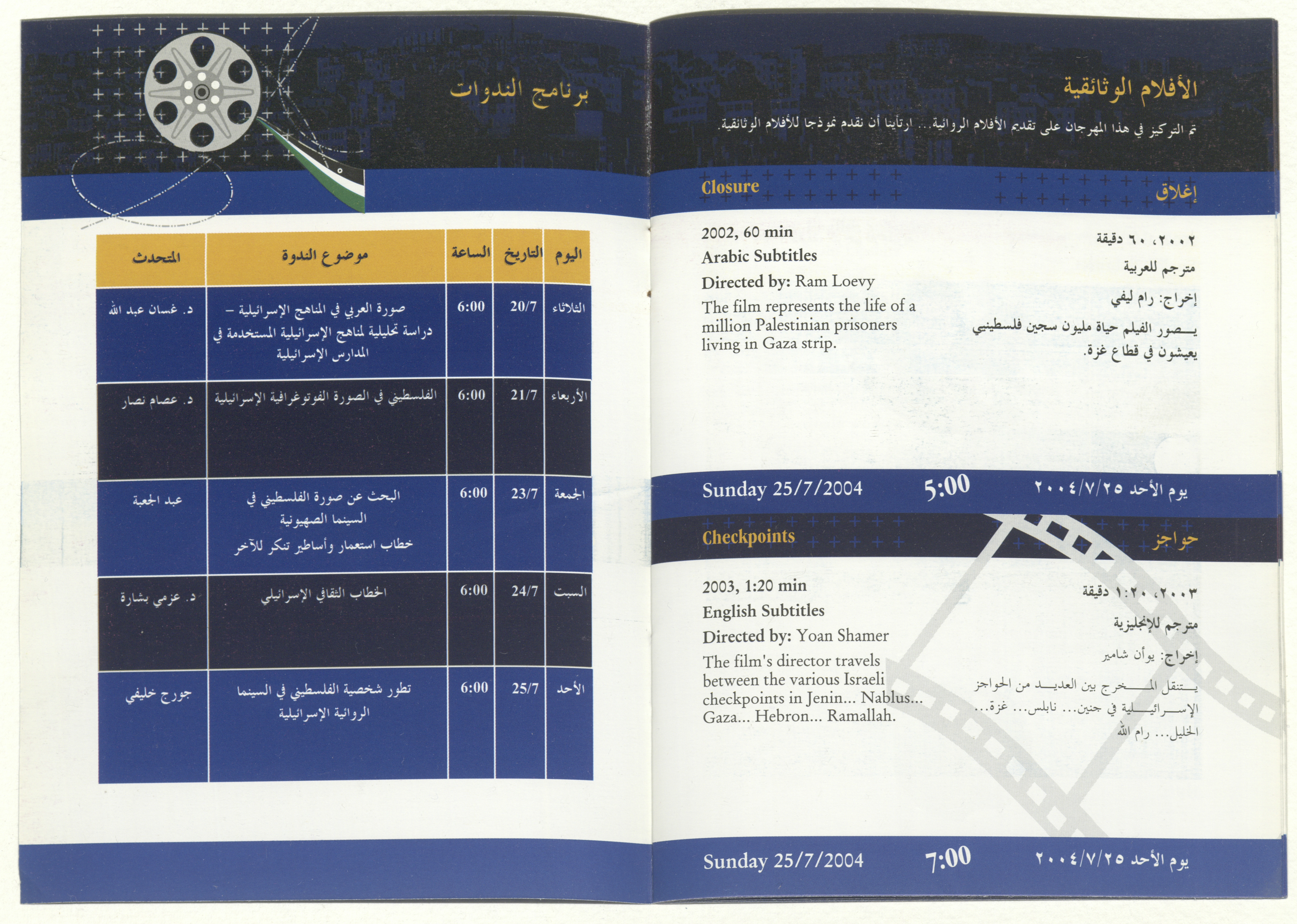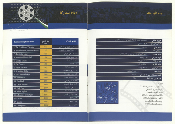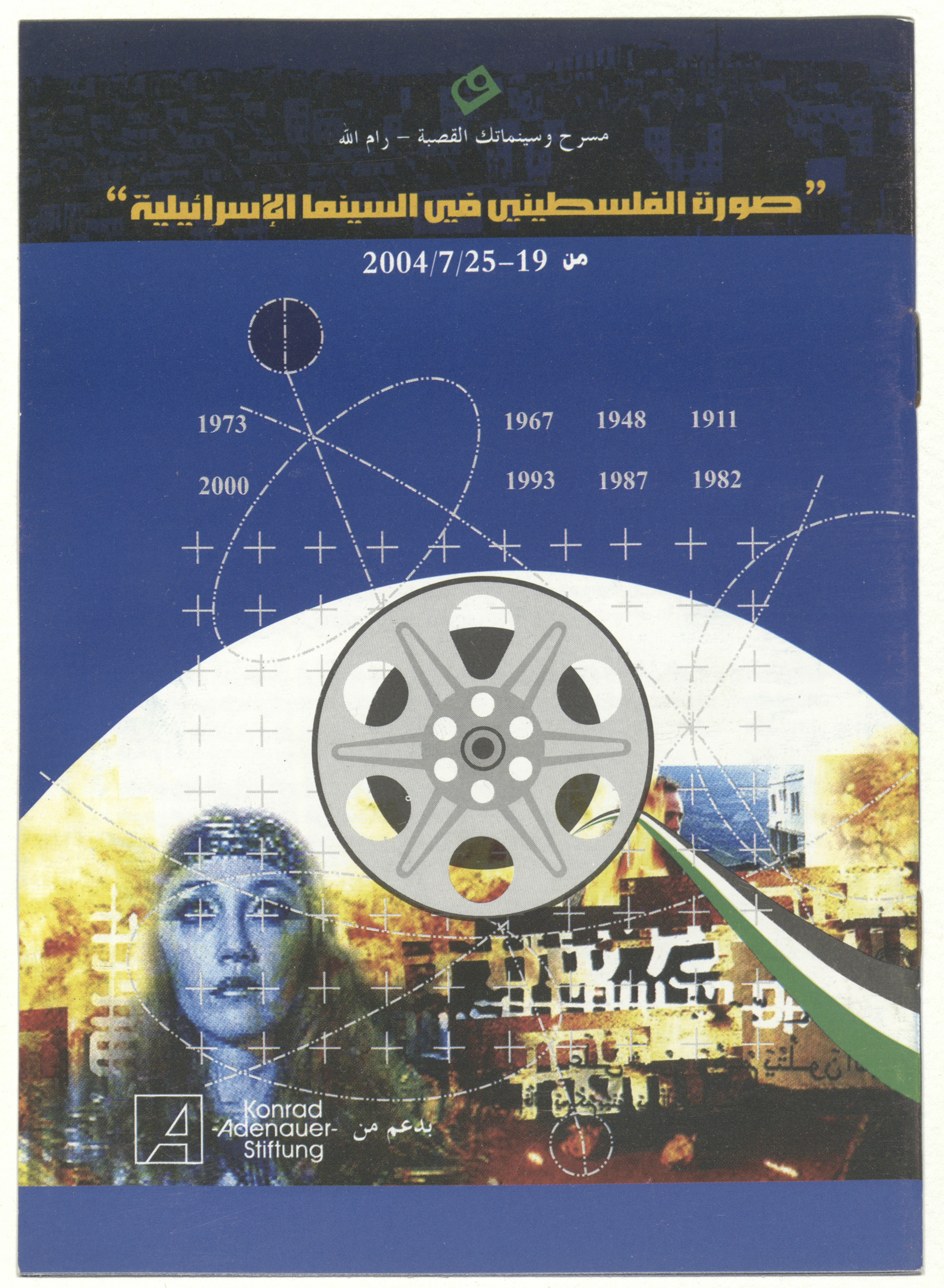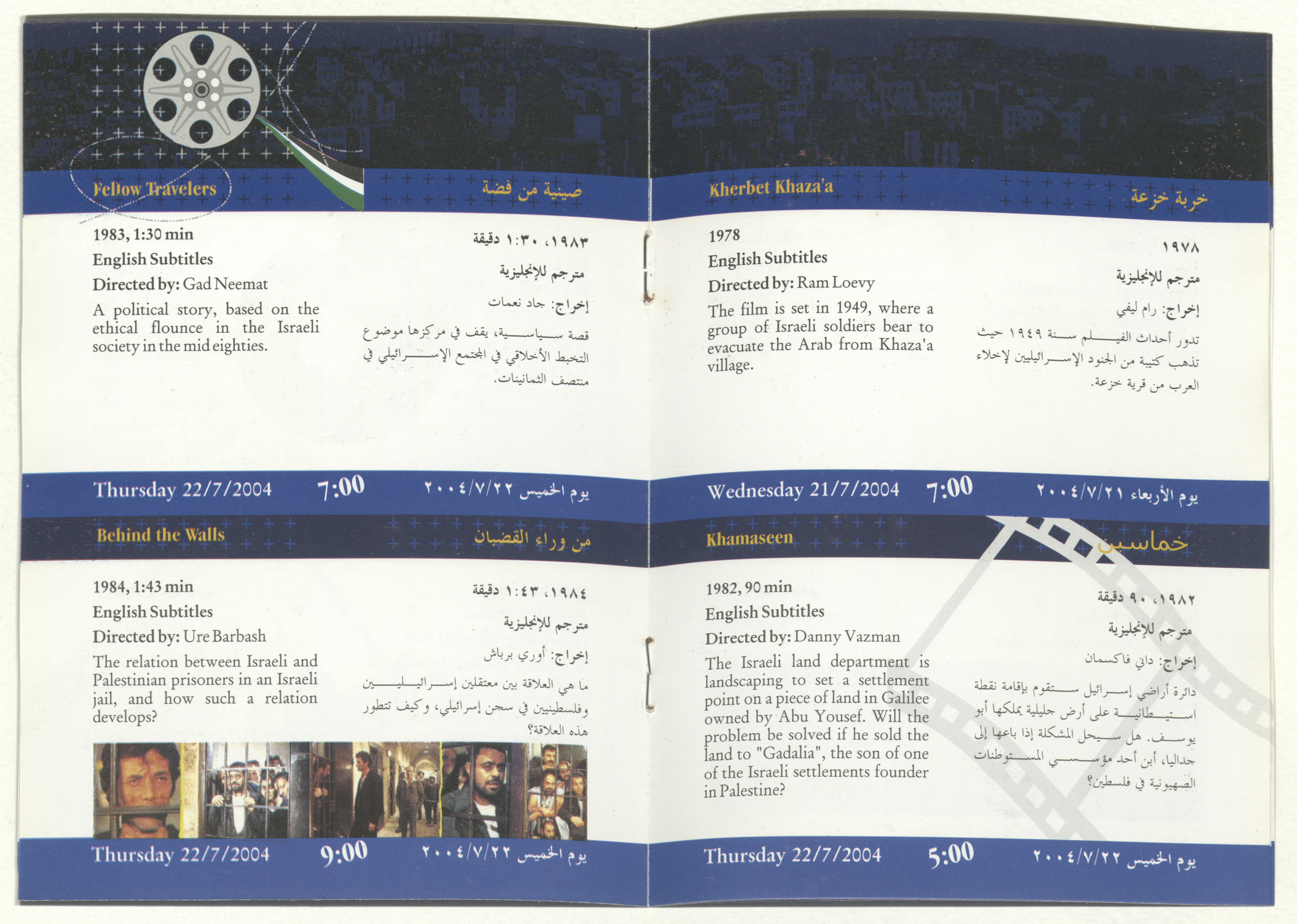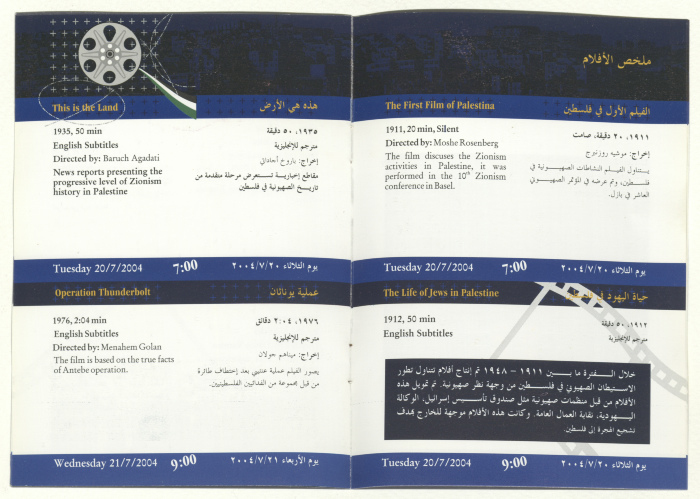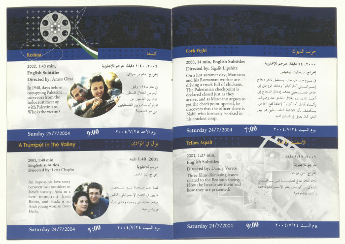 A brochure for a film festival organized by al-Kasaba Theatre and Cinematheque, presenting a collection of Israeli films tackling the Palestinian-Israeli conflict throughout the time periods coinciding with the stages of the national struggle since 1911-2002. The festival also features symposiums and discussion panels on 19-25 July 2004.