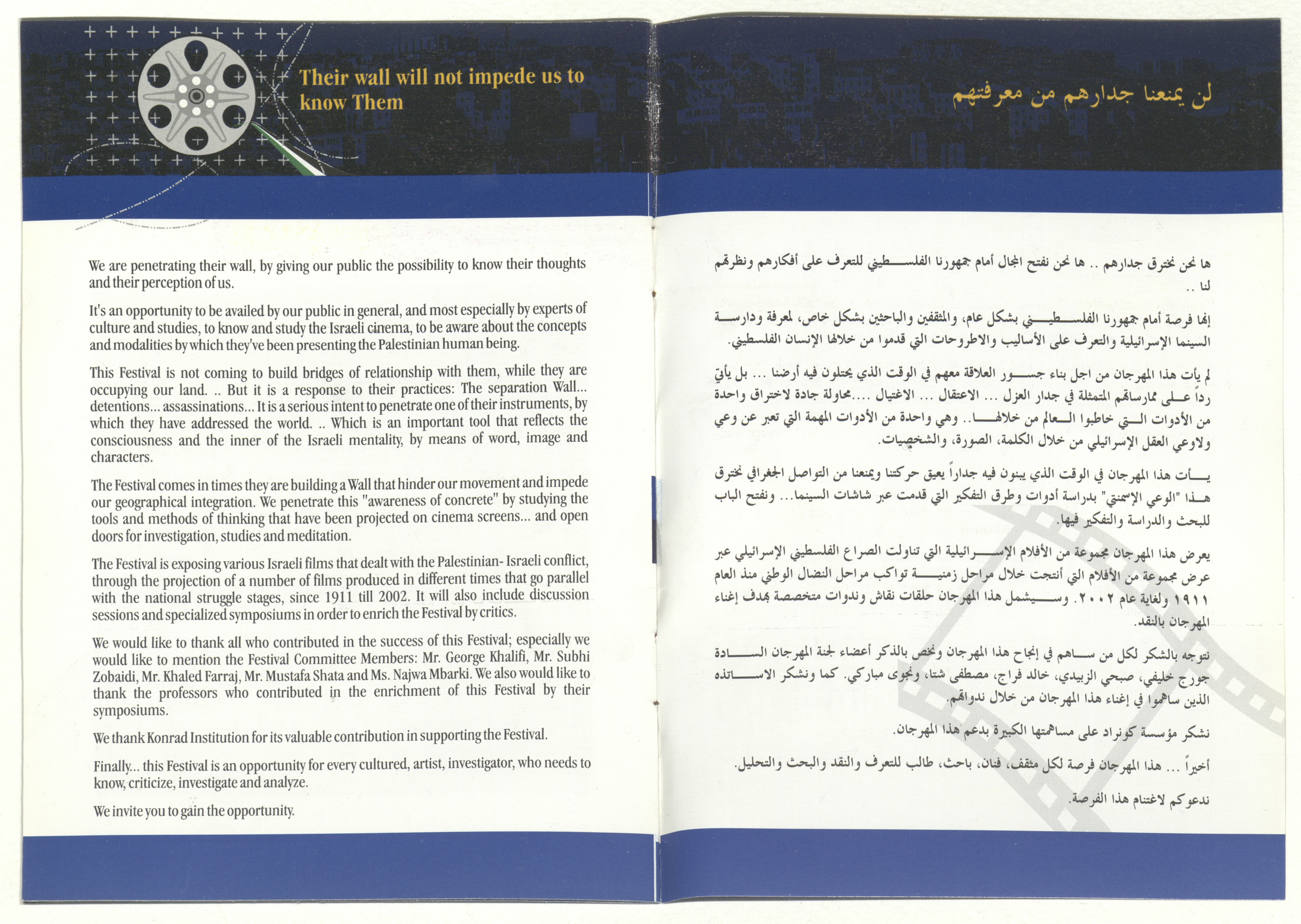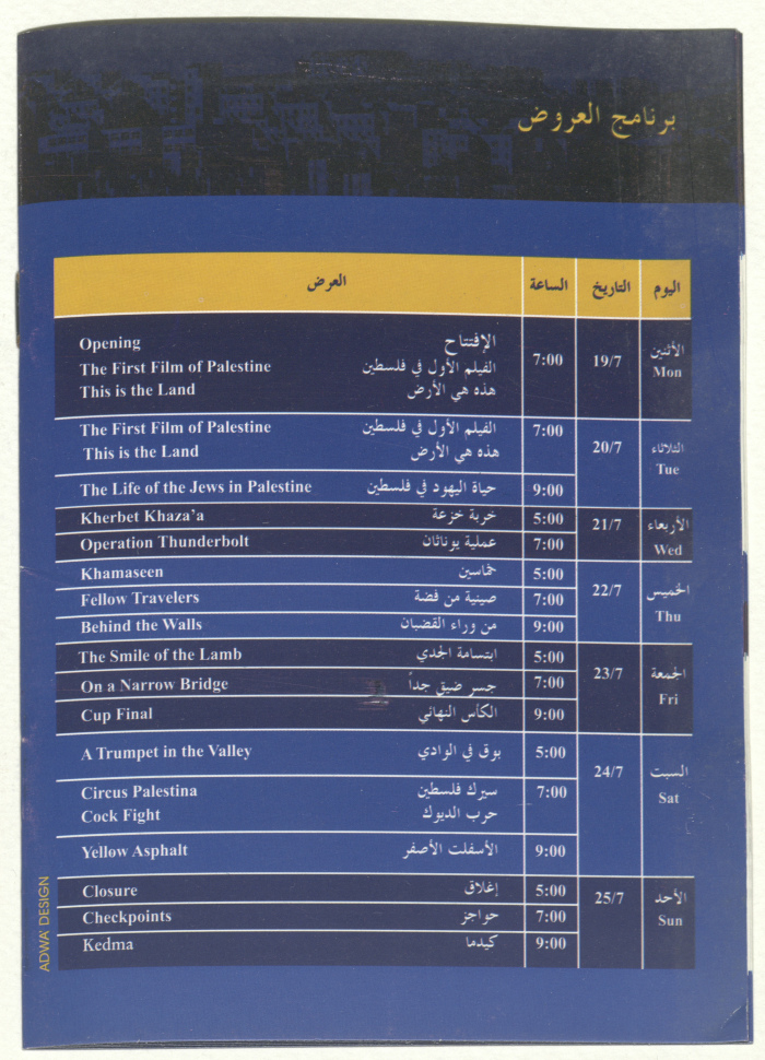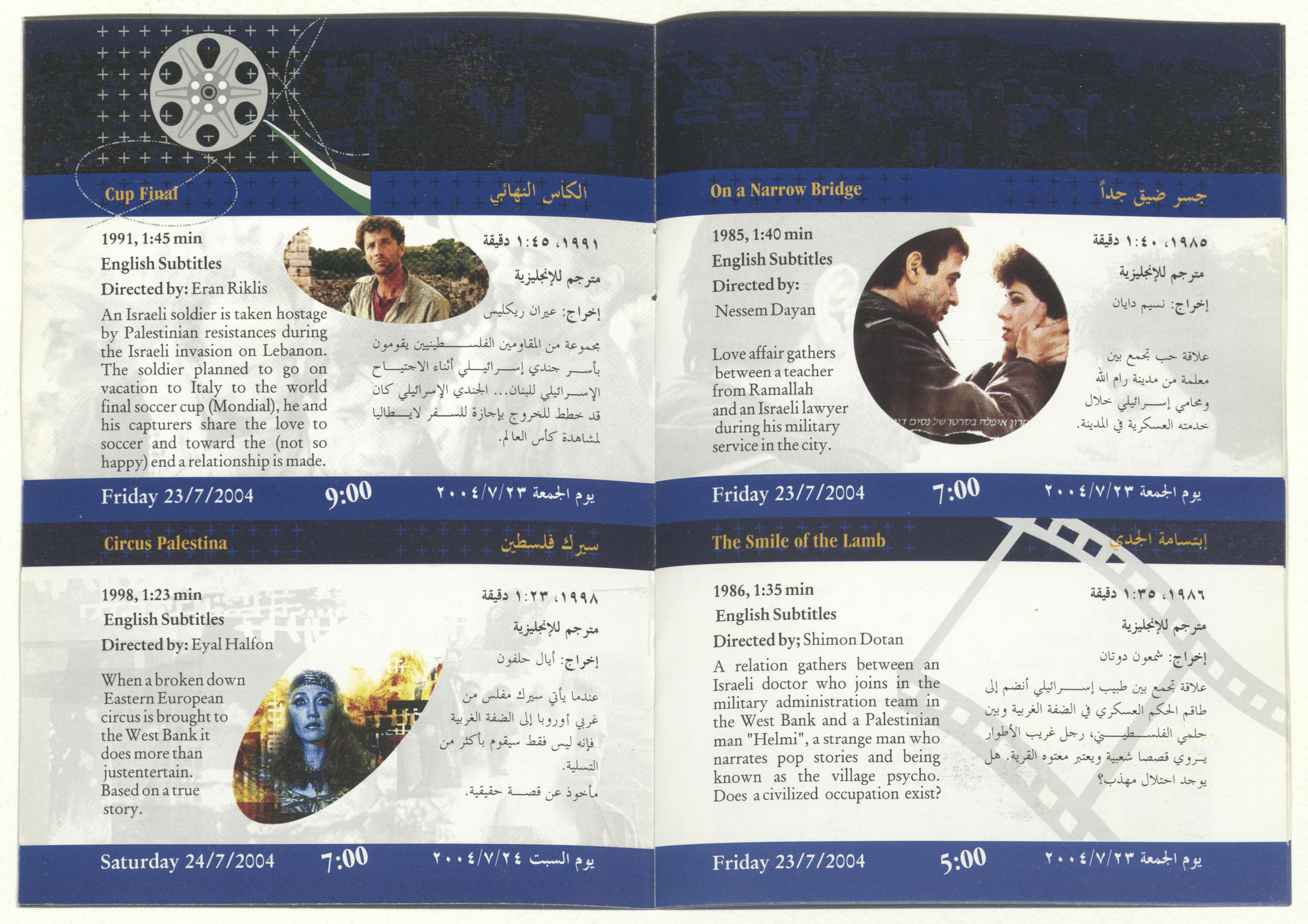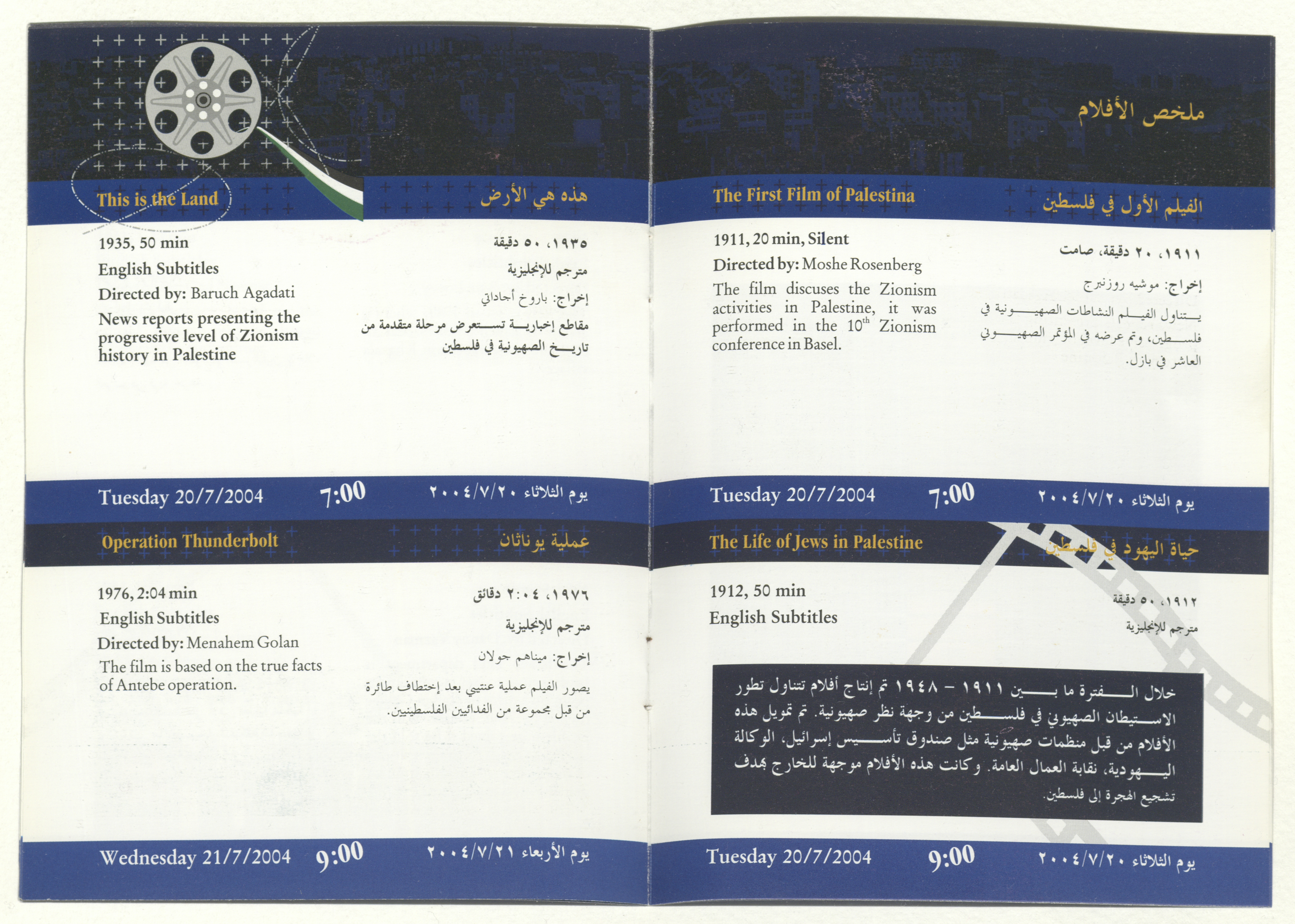 A brochure for a film festival organized by al-Kasaba Theatre and Cinematheque, presenting a collection of Israeli films tackling the Palestinian-Israeli conflict throughout the time periods coinciding with the stages of the national struggle since 1911-2002. The festival also features symposiums and discussion panels on 19-25 July 2004.