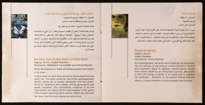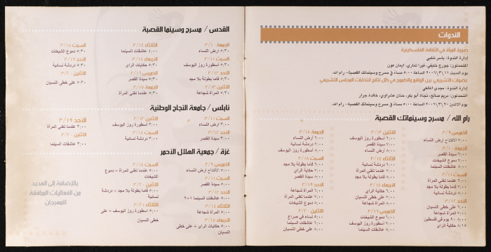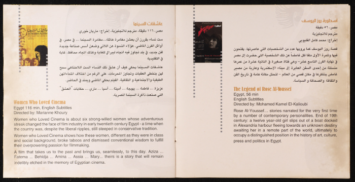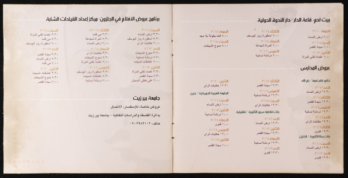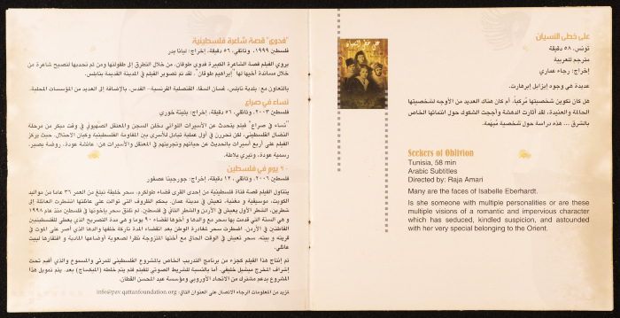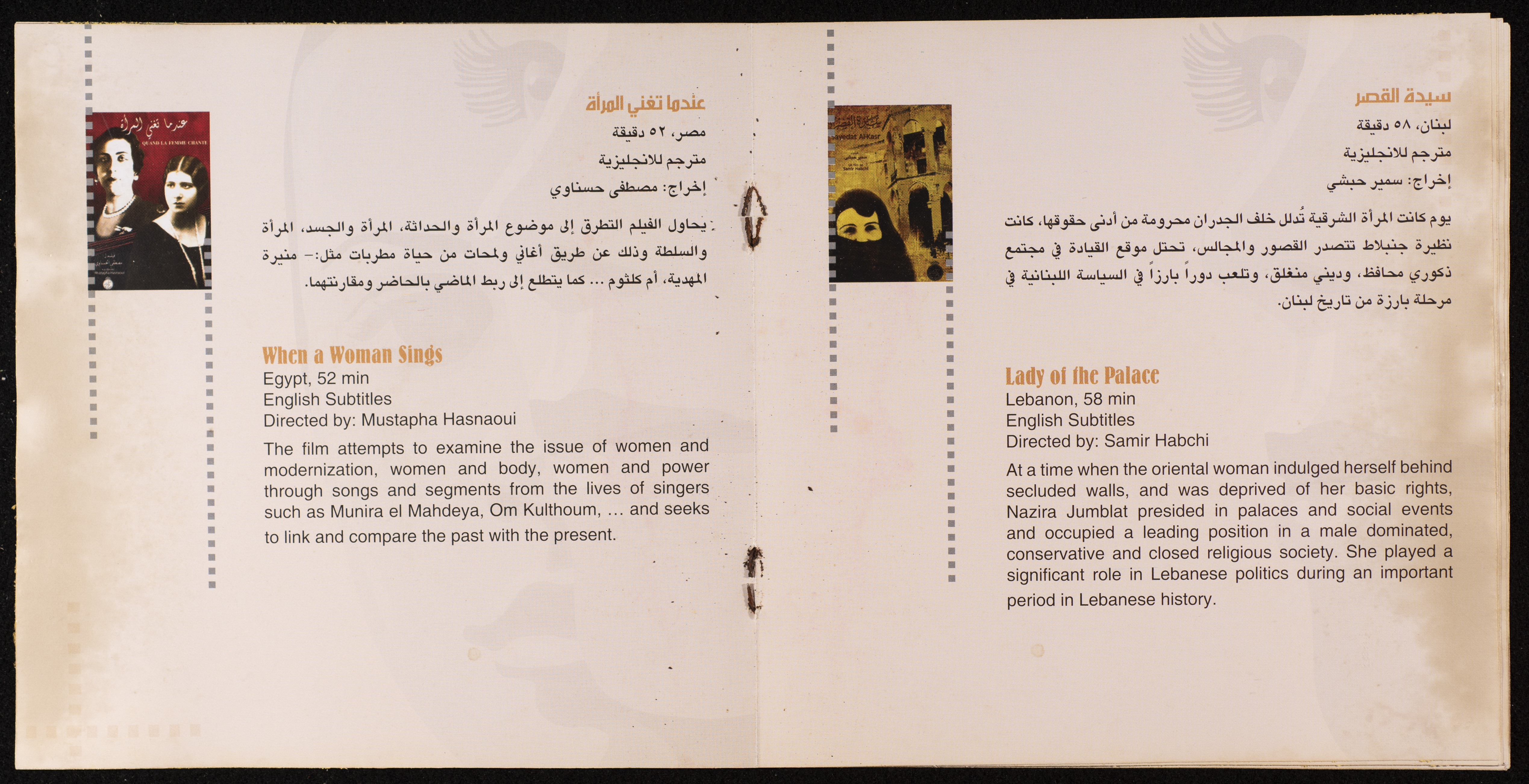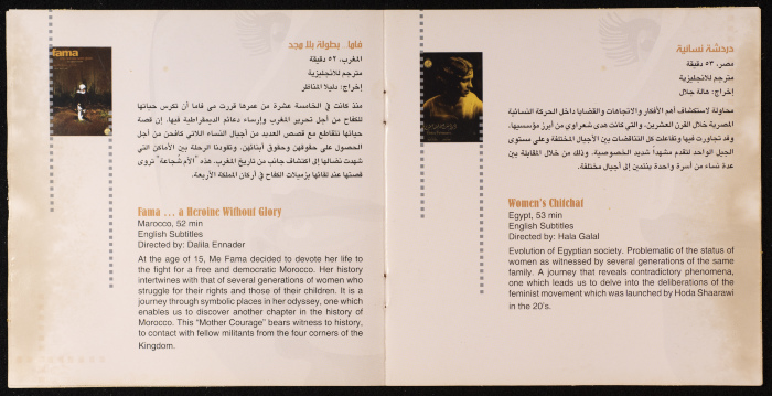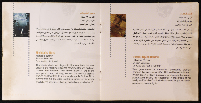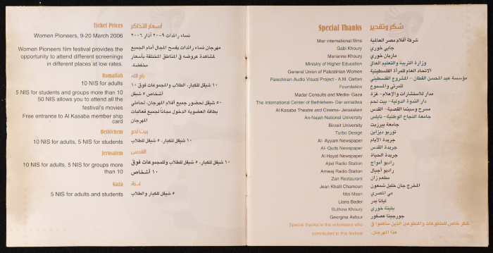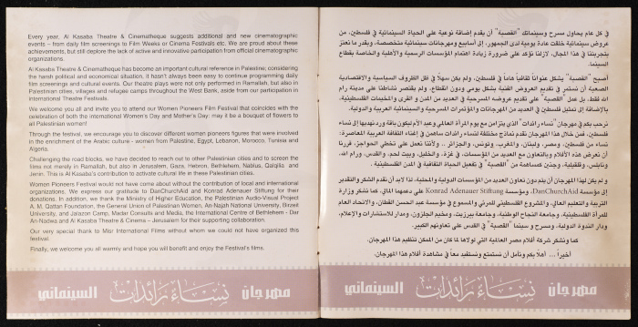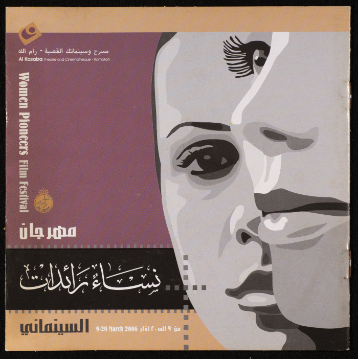 A booklet published by al-Kasaba Theatre and Cinematheque promoting the programme of film screenings, theatre plays, and symposiums held as part of Women Pioneers Film Festival. The festival took place from March 9 to March 20, 2006.