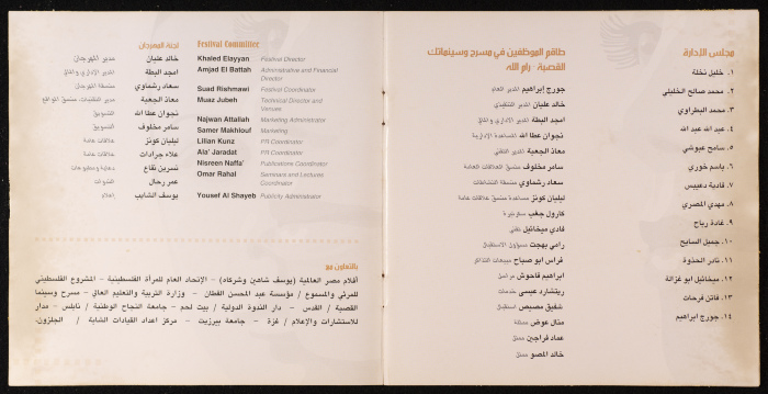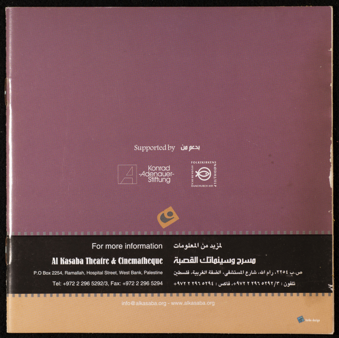Asad, Hamzah, "The al-Kasaba Theatre and Cinematheque Collection," archival inventory, July 2018 the Palestinian Museum Digital Archive. ;George Ibrahim (General director of al-Kasaba Theatre and Cinematheque), partially recorded interview with PMDA researcher Hamzah Asad, 2019, non-transcript, the Palestinian Museum Digital Archive.