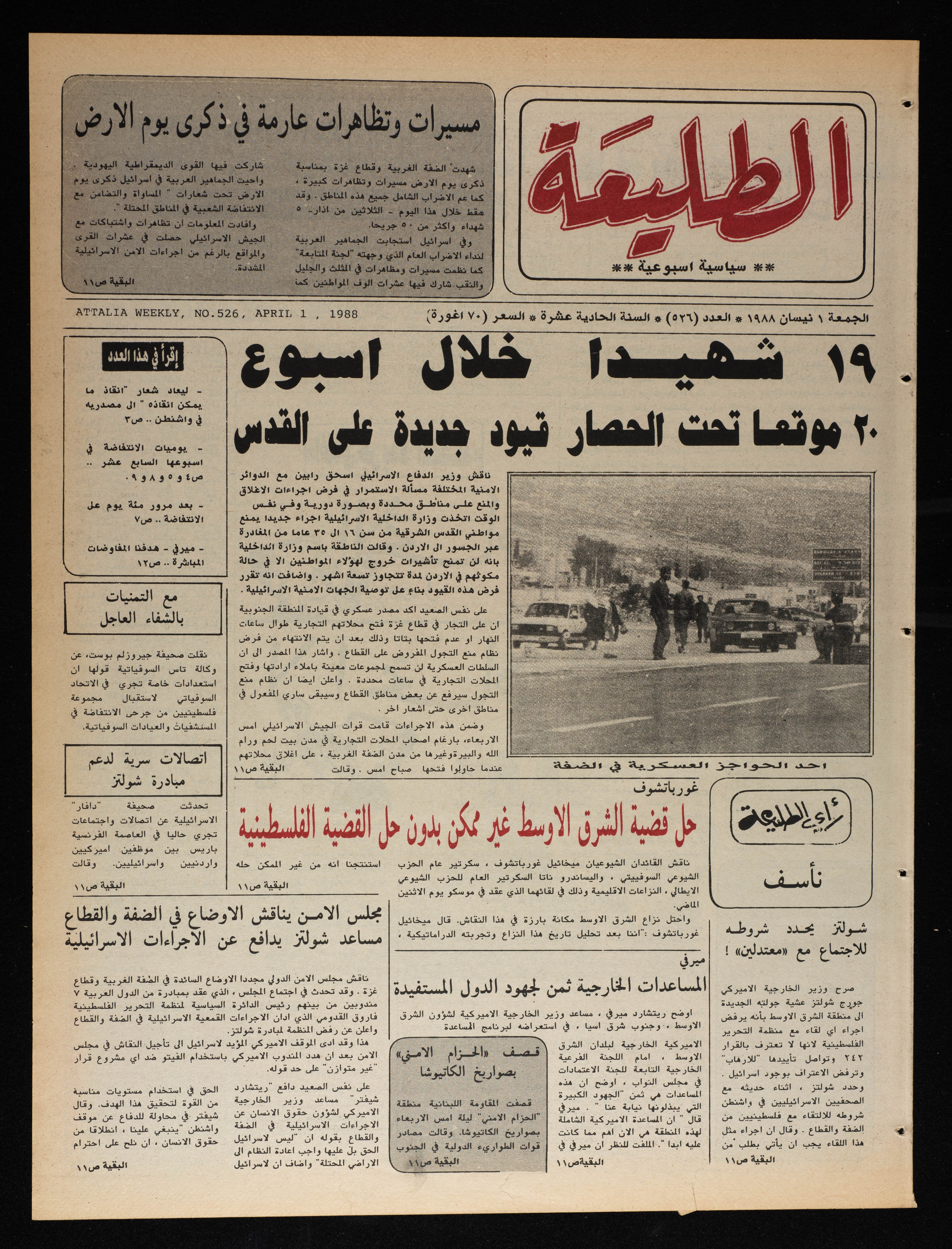 Printed in Ṣalah ad-Din Press with Bashir al-Barghuthy as the managing editor, this 12-page issue no. 526 of Attali’ah Newspaper, issued on 1 April 1988, features the following topics: 1. Mass rallies and demonstrations commemorating Land Day. 2. 19 shaheeds within a week, 20 sites under siege, and new restrictions on Jerusalem. 3. Gorbachev: Solving the Middle East issue is not possible without solving the cause of Palestine. 4. Confidential communications in support of the Shultz Initiative. 5. The Security Council discusses the situation in the West Bank and the Gaza Strip, Shultz's deputy defends the Israeli measures. 6. Murphy: Foreign aid is the price recipient countries pay. 7. Bombing the security belt with Katyusha rockets. 8. Wide condemnation of the decision to close al-Ittihad Newspaper. 9. General Aharon Yariv: We should fear the continuation of the status quo more than the establishment of a Palestinian state. 10. The seventeenth week of the Intifada. 11. The shaheeds of the seventeenth week. 12. Military orders on the eve of Land Day. 13. Yossi Melman from the Washington Post: Resettlement has always been an Israeli option that has been discussed briefly but seriously. 14. Dan Margalit in Haaretz: A hundred days after the Intifada, Israelis are in despair. 15. The closure of the Palestinian Information Centre. 16. Saudi Arabian missiles serve the US plan. 17. America blackmails its friend Saudi Arabia.