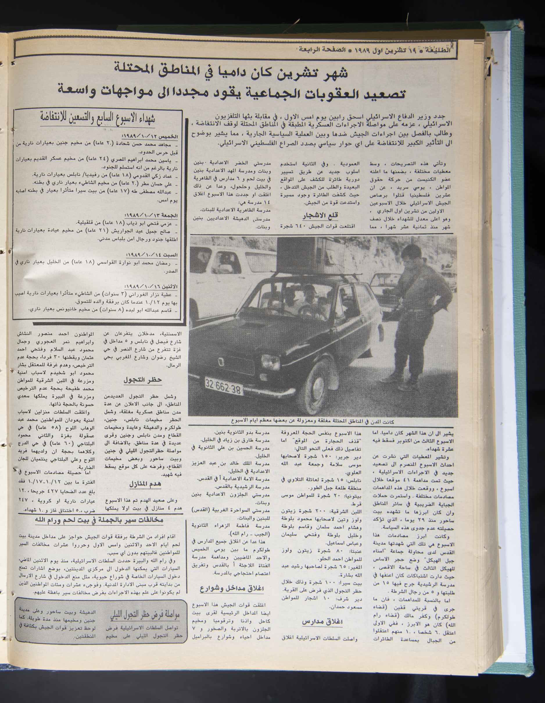 Printed in Ṣalah ad-Din Press with Bashir al-Barghuthy as the managing editor, this 12-page issue no. 607 of Attali’ah Newspaper, issued on 19 October 1989, features the following topics: - Arafat from Baghdad: Stop the killing of people. - Curfews imposed on four Palestinian refugee camps, clashes and the tax collection campaign against Beit Sahour continued. - After the issuance of the Central Council decisions: Palestinian consensus opposing the Baker Plan and affirming adherence to the British peace initiative. - An official reception of Arafat in Prague. - A unified national list for the Jordanian elections, the Jordanian communists are united. - Egyptian-Libyan agreements to normalize relations and the Soviet Union welcomes rapprochement while America opposes. - A compromise formula on the Syrian withdrawal and the Tripartite Committee of the Arab Heads of State is to consider the initiative at the Taif Session. - The German News Agency: Huonker was sacked for health reasons. - Why did the British Consul anger the Israeli Occupation Authorities? - The number of homes demolished in Idhna has reached 35. - October was bloody in the Palestinian Occupied Territories, and the escalation of collective punishments leads, yet again, to large-scale confrontations. - Shaheeds of the ninety-seventh week of the Intifada. - Ze'ev Schiff: The Intifada shook the status quo policy. - Al-Auja farmers insist on staying and clinging to the land despite the drought and cooperative societies and capital owners are invited to contribute to relief farmers from their struggle. - The Intifada tops the work of the Central Council. - An Arab front to support the Intifada. - In El Salvador: peace is in sight. - The escalation of resistance in Sudan against the putschists. - The debts of poor countries dominate Mitterrand's visit to Latin America.