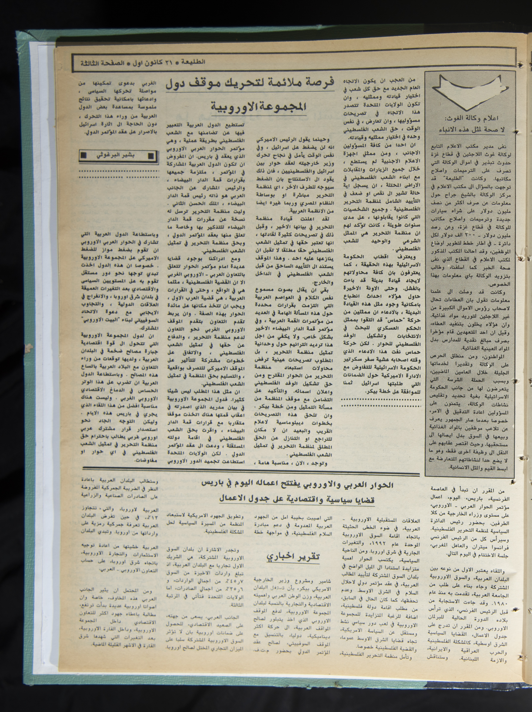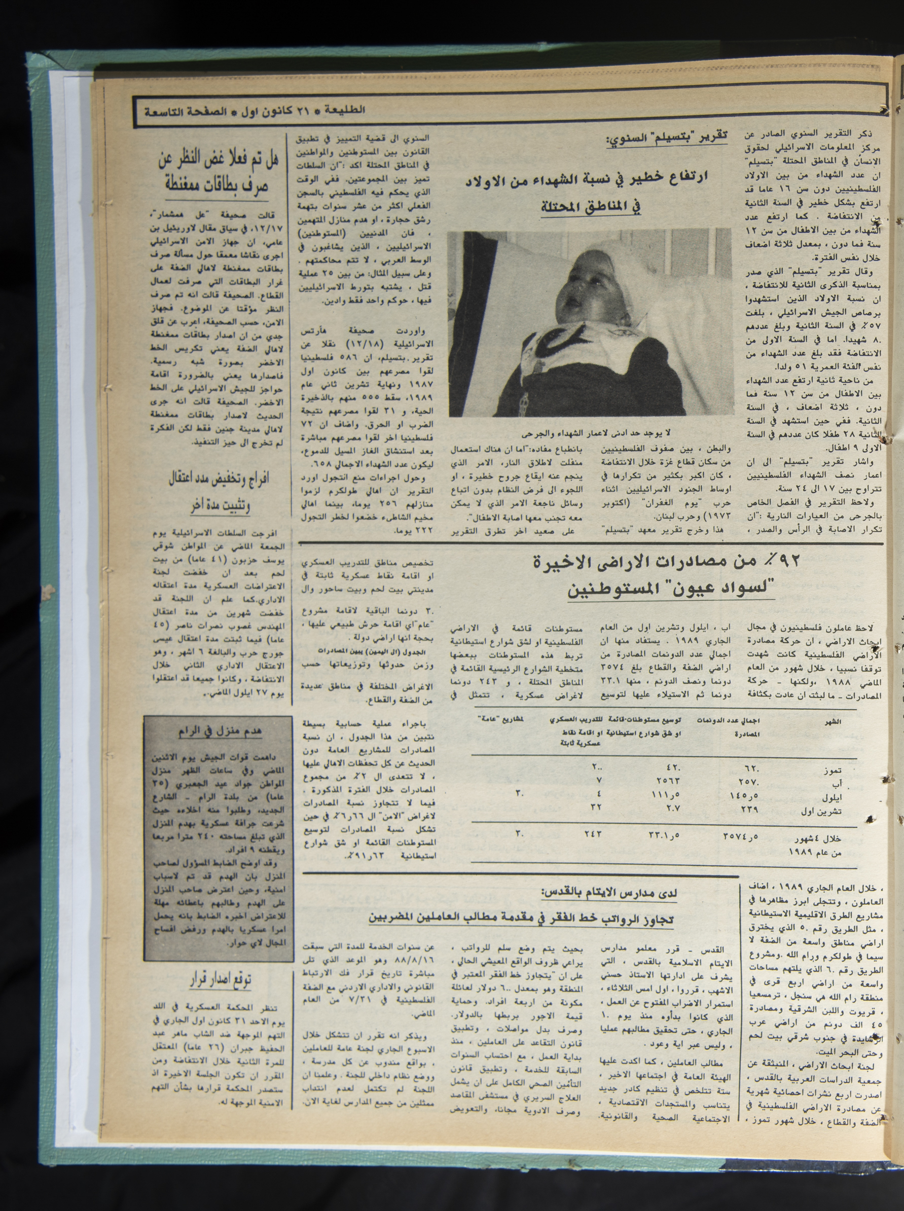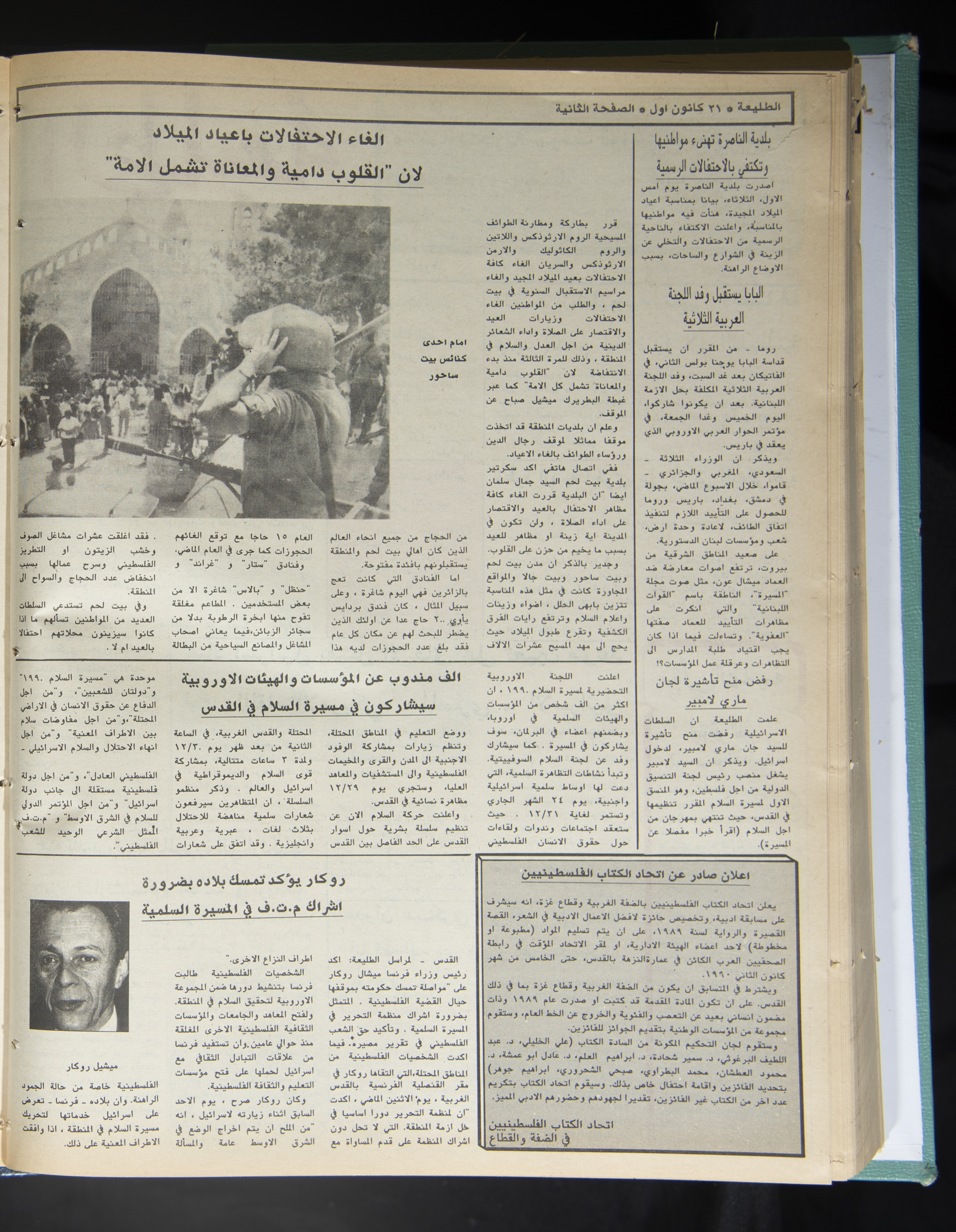Printed in Ṣalah ad-Din Press with Bashir al-Barghuthy as the managing editor, this 12-page issue no. 616 of Attali’ah Newspaper, issued on 21 December 1989, features the following topics: - The Executive Committee statement: Forming a dialogue delegation representing the Palestinian people is an absolute right of the PLO. - The death of a detainee in his cell in Gaza and forty notices for homes demolition. - Washington confirms and Iran denies the conclusion of the oil agreement. - The Gulf Summit ends its work, renewing support for the Palestinian peace initiative. - The deportation of three women and their children to Jordan. - Another Jordanian step on the road toward democracy. - A military order authorizing the Israeli Occupation Authorities to confiscate properties. - Israel's obstinacy fails in allocating a date for the American-Egyptian-Israeli meeting. - A wide campaign to condemn the massacre committed by the ruling "Ceaușescu Family" in Romania. - A US military aggression against Panama. - Cancelling Christmas celebrations because "hearts are bloody and suffering affects the people". - The Pope receives the delegation of the Tripartite Committee of the Arab Heads of State. - It is better for Israel to recognize the truth and the Palestinian people. Will Palestinian's chaos make a return? - Shaheeds of the 2nd week of the 3rd year of the Intifada. - Israeli sources: out of fifty thousand detained, only seventeen thousand will be tried. - Shamir and the policy of smashing heads. - Residents of Canada's Palestinian Refugee Camp continue to pay the price for "peace deals". - The emergency conference of the Socialist Unity Party of Germany: more freedoms and a new constitution for the Party. - A water crisis may turn into a political crisis between Turkey and Syria because of the "Euphrates" waters. - Stifling economic crisis in Iraq and Ṣaddam tightens his grip. - Pausing the delivery of French weapons to Libya in response to Arab and Western pressure.