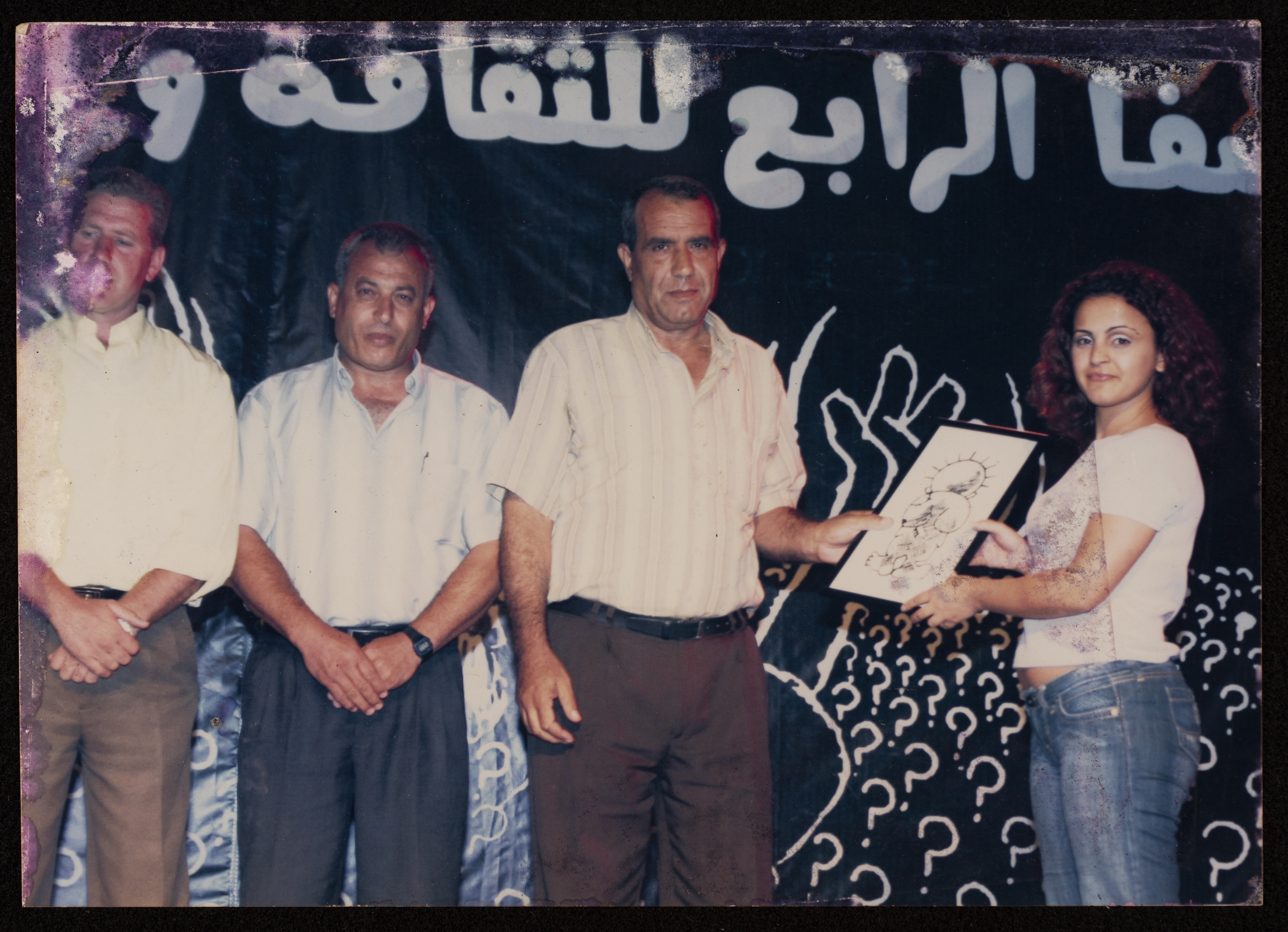 Taken in 2007, this photograph captures members of the Handhalah Cultural Center handing over an award for a member of a music band at the three-day 4th Saffa Culture and Art Festival held by the Center at the Saffa School for Boys and sponsored by the A. M. Qattan Foundation and in cooperation with the Popular Art Centre.