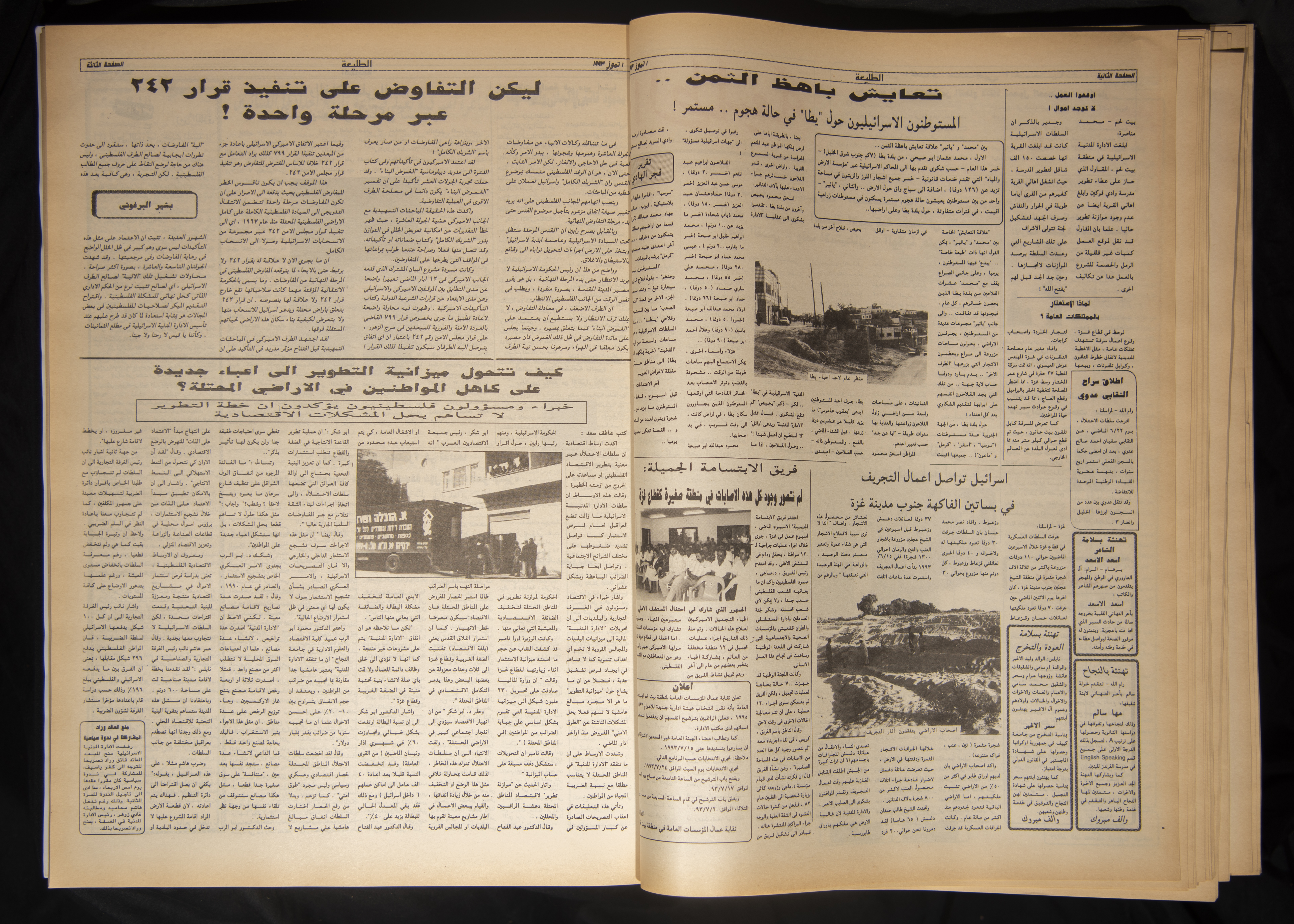 وثيقة مطبوعة باللغة العربية، مكونة من 12 صفحة، وهي عبارة عن العدد 798 من جريدة الطليعة، 1 تموز 1993، حرره بشير البرغوثي، وطُبع في المطبعة العربية الحديثة في القدس، وقد تناول هذا العدد مجموعة من العناوين والموضوعات، منها: - رئيس اتحاد منتجي الحمضيات: يجب رفع الطوق الأمني عن القطاع لإنقاذ محصول الحمضيات من الدمار. - مع نهاية الجولة العاشرة: الوفد افلسطيني: الوثيقة الأمريكية يجب أن تتضمن: وضع القدس، وقف الاستيطان، الولاية على الأرض. - عرفات: المفاوضات الجارية تشكل الفرصة الأخيرة لإحلال السلام. - رابين: القدس ستبقى عاصمة لإسرائيل وتحت سيادتها. - اعتصام احتجاجي ضد عزل القدس، لجنة متابعة الأرنونا تنظمة لمدة أسبوع. - غسان الخطيب: الاجراءات الاسرائيلية في القدس عقبة رئيسة أمام المفاوضات. - شق طريق استيطاني في عين قينيا. - اسرائيل تواصل أعمال التجريف في بساتين الفاكهة جنوب مدينة غزة. - اعتقالات واسعة في دير استيا تشمل 20 ولدًا. - "ما بعد الحداثة" تعريف المصطلح مشكل في حد ذاته. - اتفاقية جينيف، وجهة نظر قانونية وشخصية، بقلم: فيلتسيا لانغر. - رئيس المؤتمر اليهودي الأمريكي: الولايات المتحدة تدعم المفاوضات من منطلق حماية مصالحها ودعم اسرائيل. - قائد المنطقة الشمالية يعترف بارتفاع العمليات العسكرية. - رابين: أقسمت أن أكون آخر من ينسحب إلى حدود 67. - نديد دولي بالهجوم الصاروخي الأمريكي على بغداد. - في منطقة نابلس: قلق شعبي من تكرار سقوط ضحايا في حوادث سير مع مركبات عسكرية اسرائيلية. - منظمة أمريكية لحقوق الإنسان تطالب واشنطن الالتزام بمعايير حقوق الانسان في تعاملها مع اسرائيل.