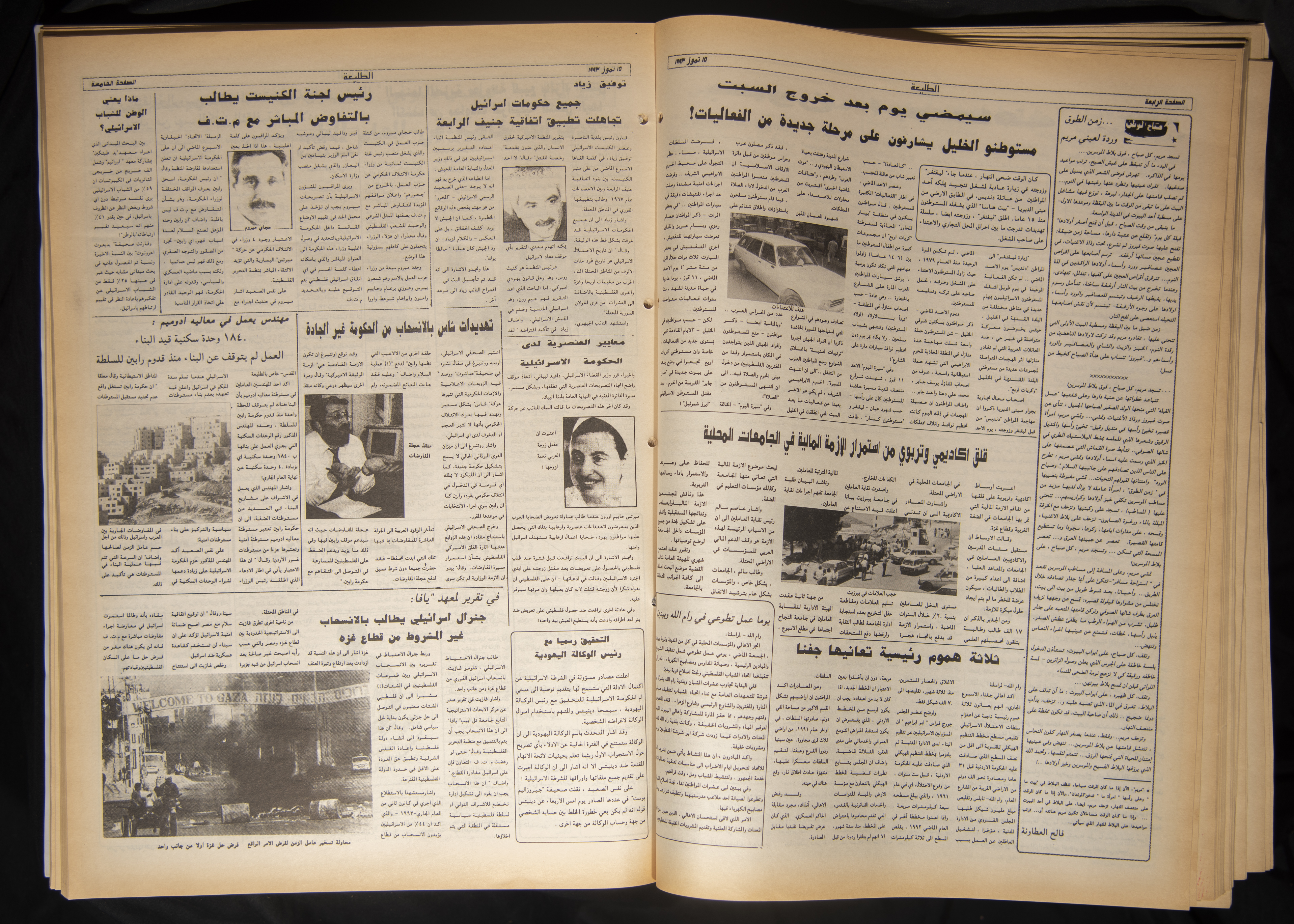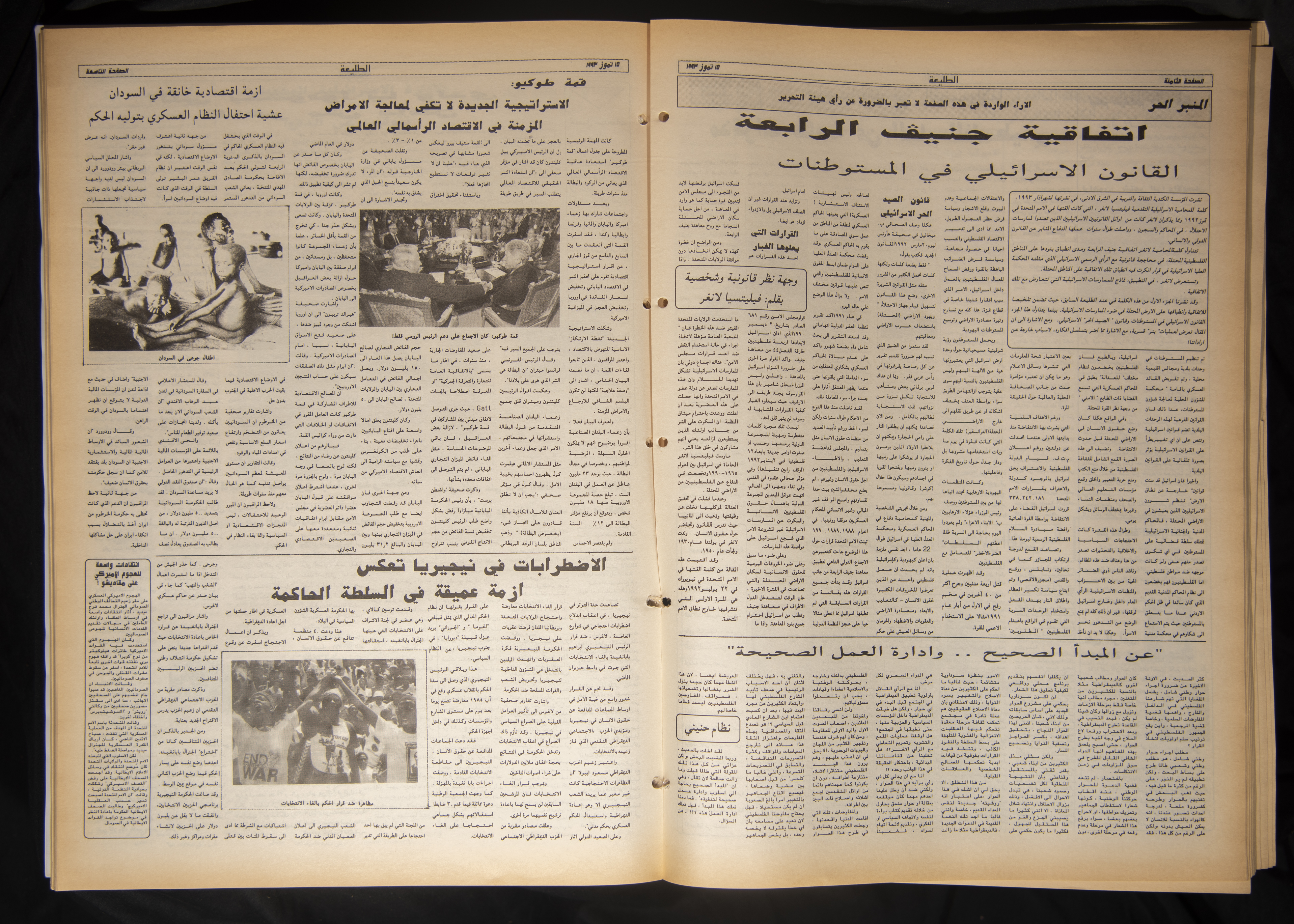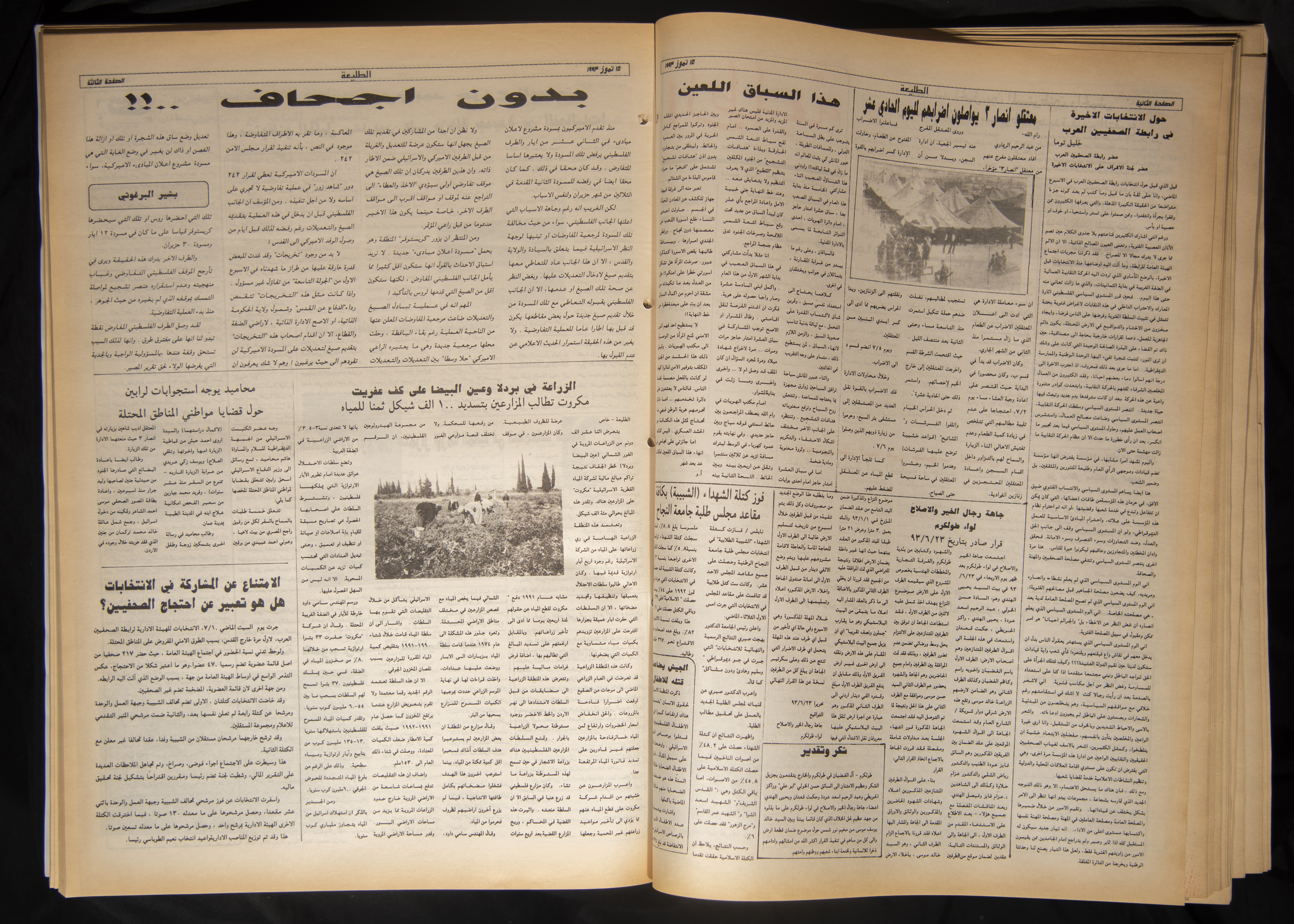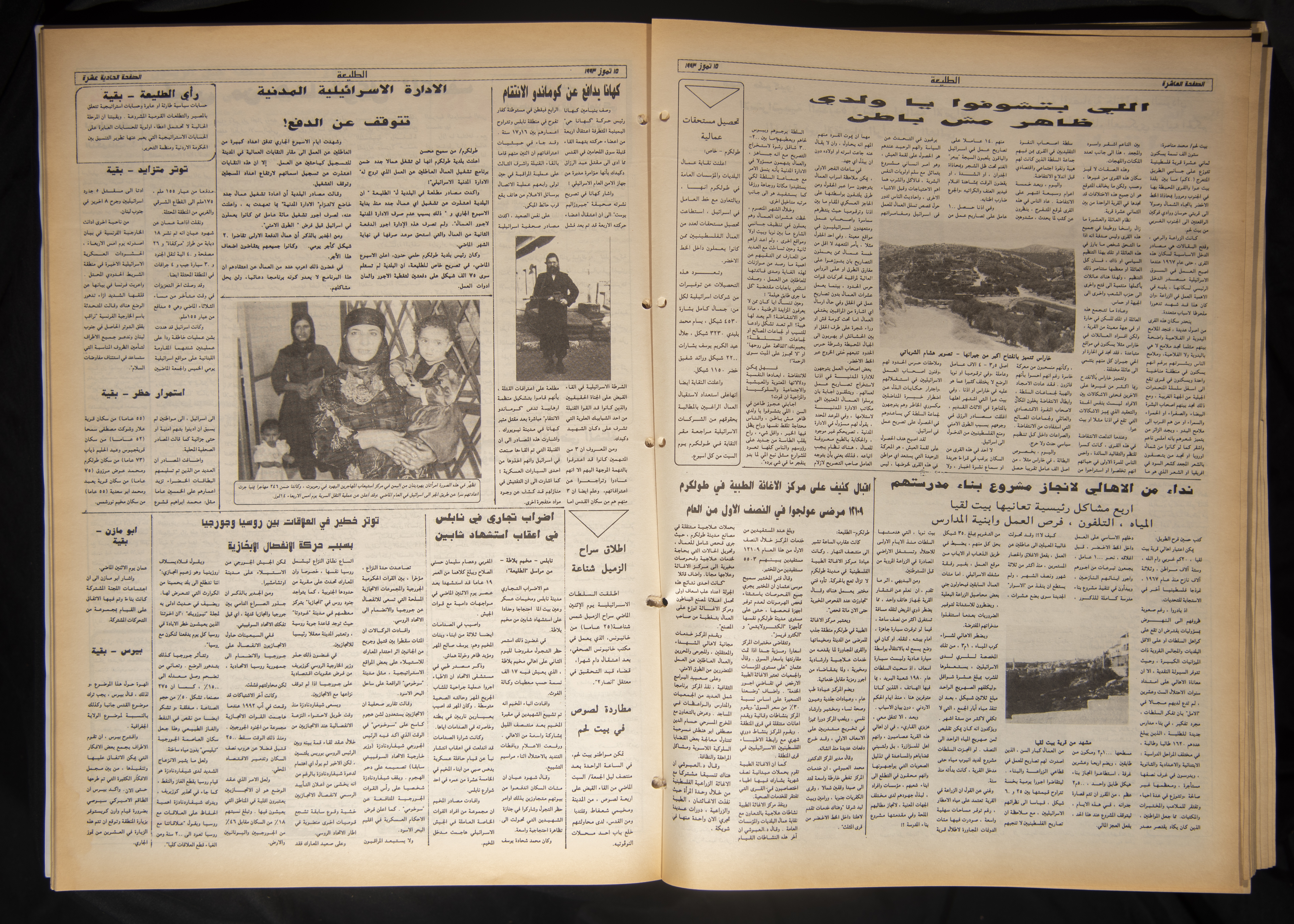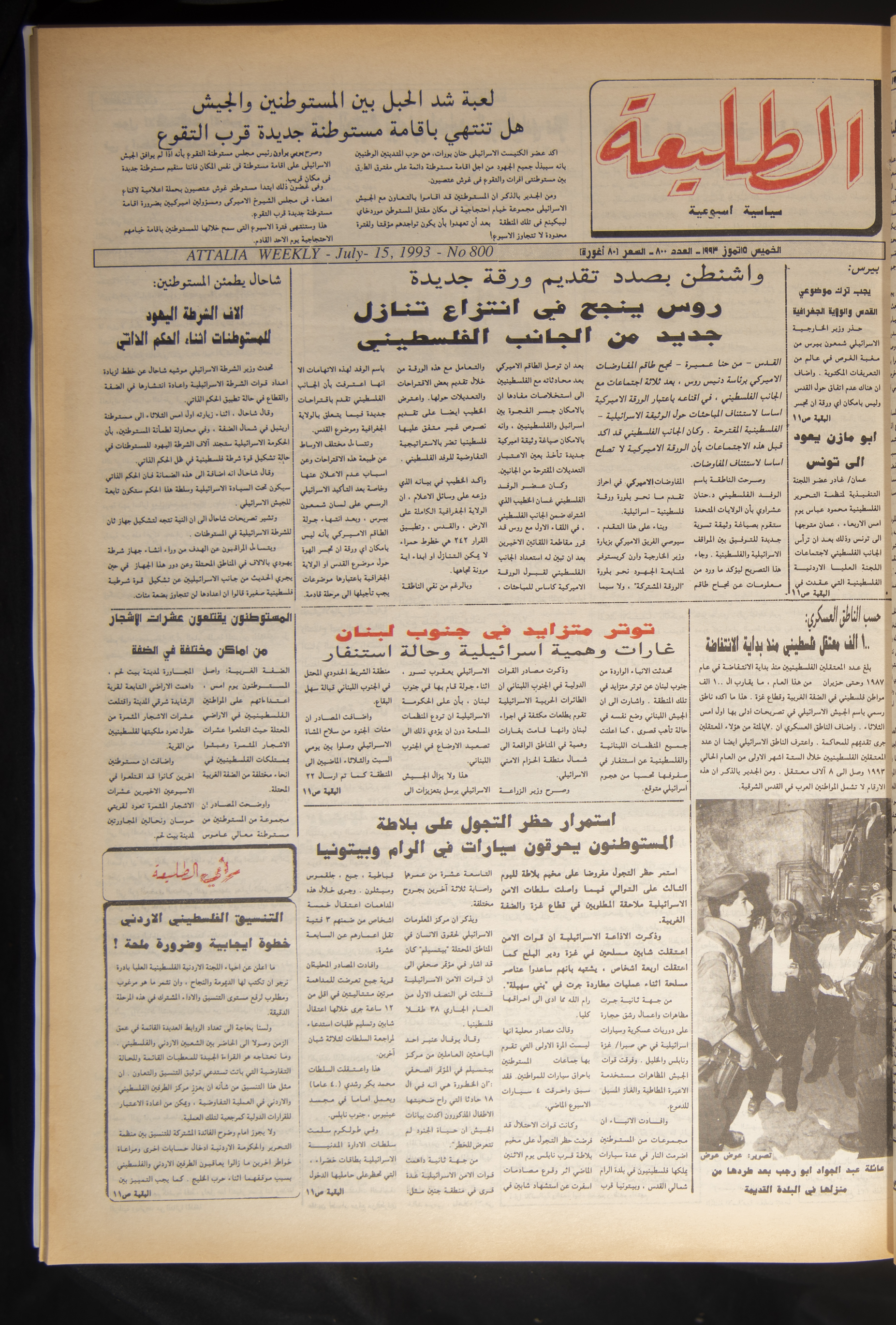 The eight hundredth issue of Attali'ah Newspaper which was published on July 15, 1993. Bashir al-Barghuthy is the issueʾs editor-in-chief, and it was printed in Salah ad-Din Press in al-Quds (Jerusalem). The 12-page issue covers the following: - Will the tug of war between Israeli settlers and the Israeli Occupation Army end in the construction of a new settlement near Tuqu'. - Washington is about to propose a new draft: Ross succeeds in forcing Palestinians to make a new concession. - Shahal assures settlers: Thousands of Israeli police officers will be stationed at settlements during the interim self-government period. - Peres: The issues of al-Quds (Jerusalem) and sovereignty over land should be dropped. - Tension escalates in South Lebanon. Israeli mock raids and a state of alert reigns over the area. - A black-and-white photograph of the family of Abdel-Jawad Abu Rajab after they were evicted from their house in the Old City of al-Quds (Jerusalem). - An article penned by Khalil Touma entitled “On the Arab Journalists' Associationʾs Recent Elections”. - Tawfiq Zayyad: Israeli authorities have deliberately disregarded the articles of the Fourth Geneva Convention. - The chairman of the House Committee calls for direct negotiations with the Palestine Liberation Organisation (PLO). - In a report by the Jaffee Center for Strategic Studies: An Israeli general calls for unconditional withdrawal from the Gaza Strip. - Felicia Langer in Fury and Hope: Personal diaries on the general Palestinian situation. - A personal and legal point of view by Felicia Langer entitled “The Fourth Geneva Convention and Israeli Law in the Settlements”. - Kahane defends the Commando of Vengeance. - The Israeli civil administration halts payments. - A Palestinian-Israeli-American youth meeting on the closure of al-Quds (Jerusalem).