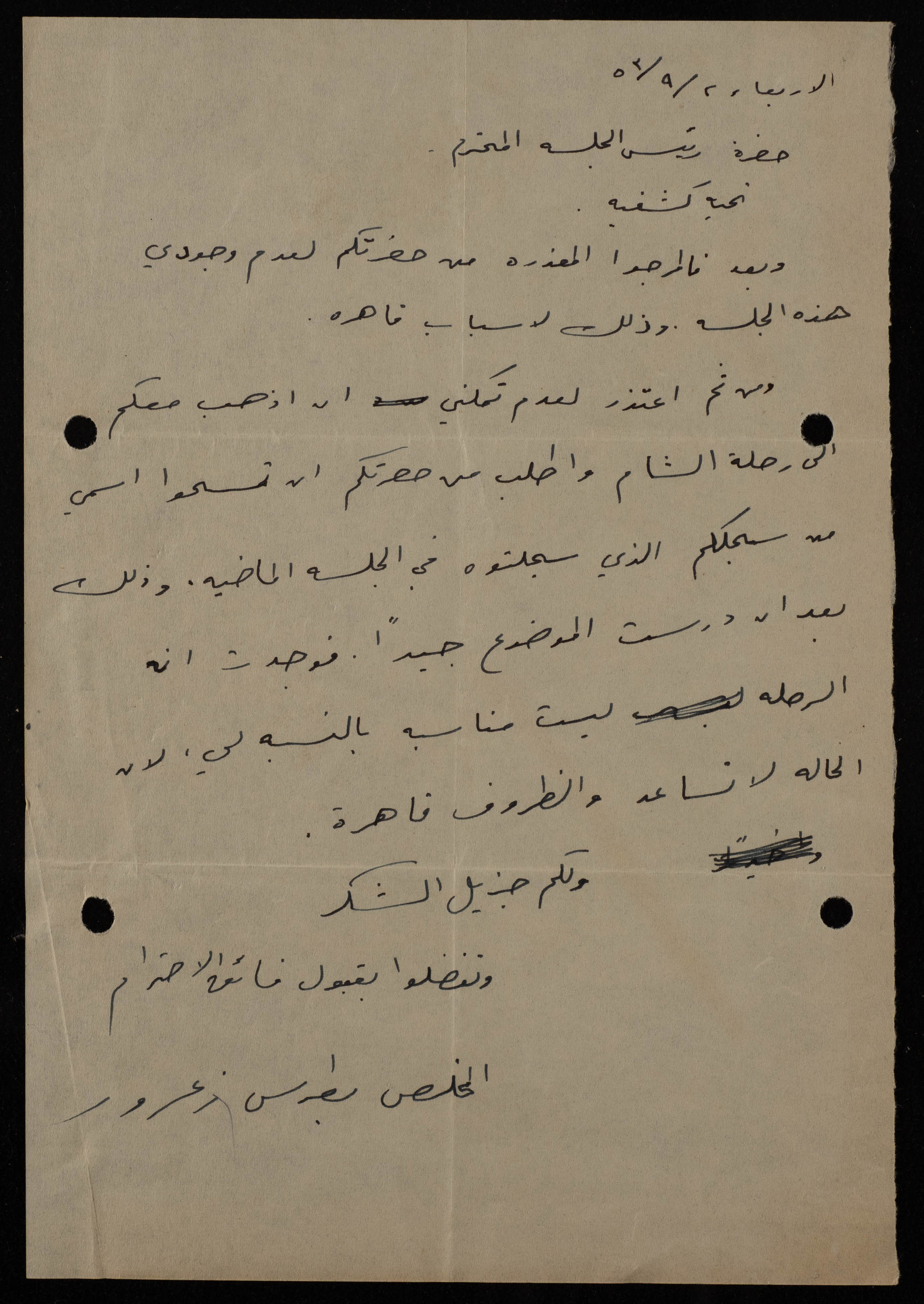 .وثيقة مكتوبة باللغة العربية، تتضمن رسالة من بطرس زعرور بتاريخ 2 أيلول 1953 حول اعتذار لعدم تمكنه لذهاب الى رحلة الشام