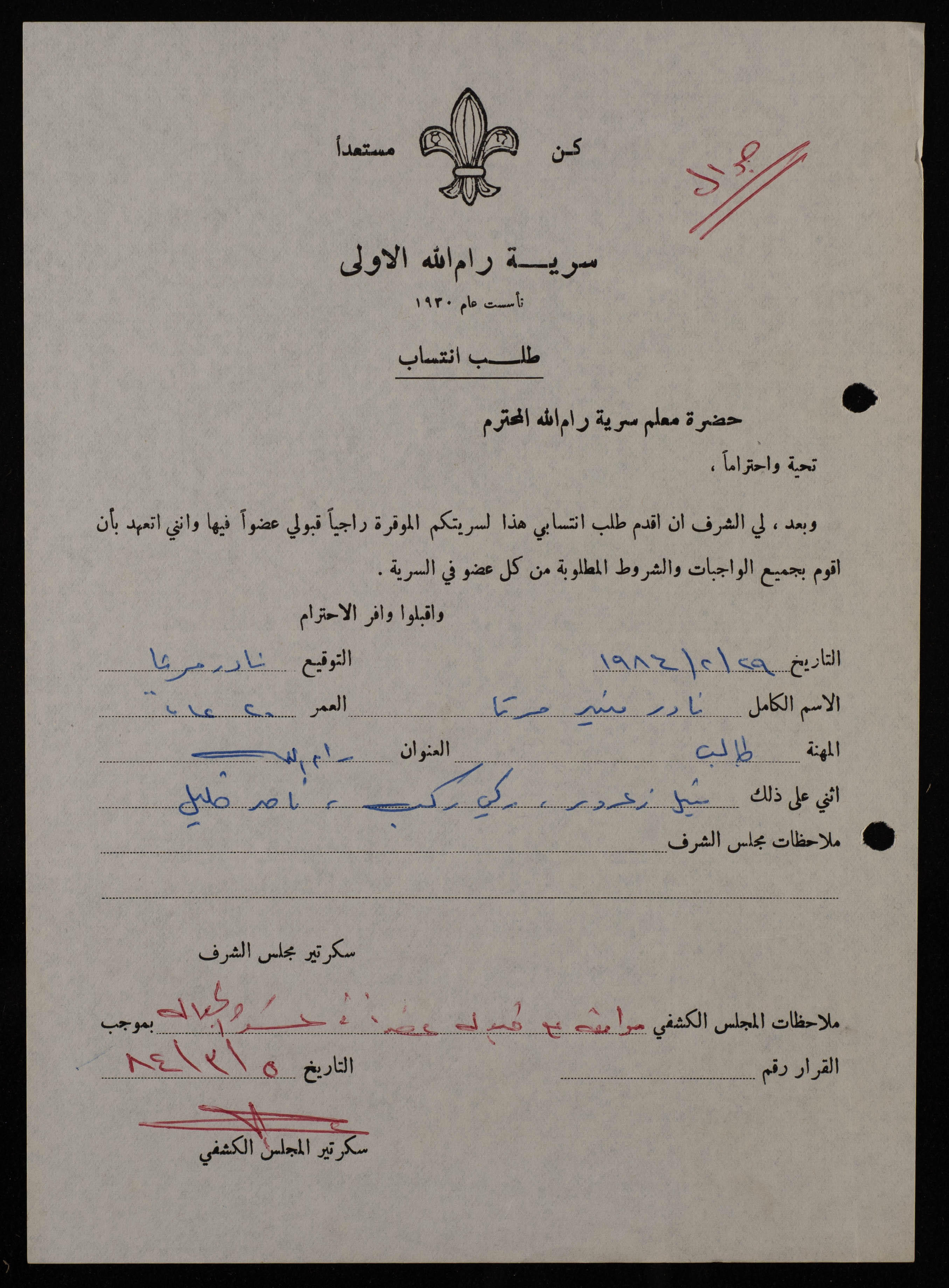 وثيقة مطبوعة باللغة العربية، تتضمن طلب انتساب مقدم من قبل نادر منير مرتا الى سرية رام الله الاولى بتاريخ 29 شباط 1984 وتم الموافقه على عضويته بتاريخ 5 آذار 1984 وتم توقيعه من قبل سكرتير المجلس الكشفي.