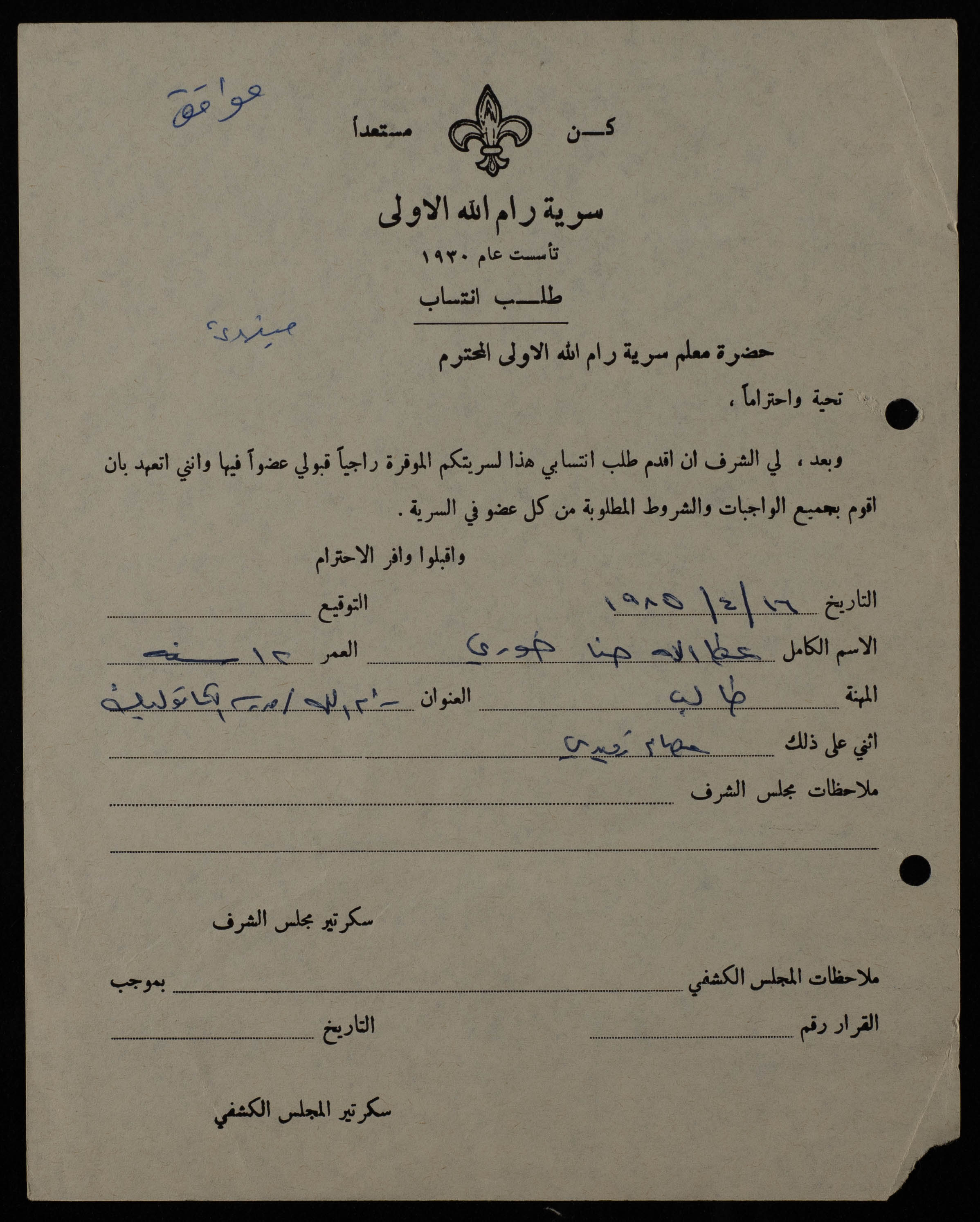 وثيقة مطبوعة باللغة العربية، تتضمن طلب انتساب مقدم من عطالله حنا خوري الى سرية رام الله الاولى بتاريخ 16 نيسان 1985 وتم موافقة المجلس الكشفي على الطلب.