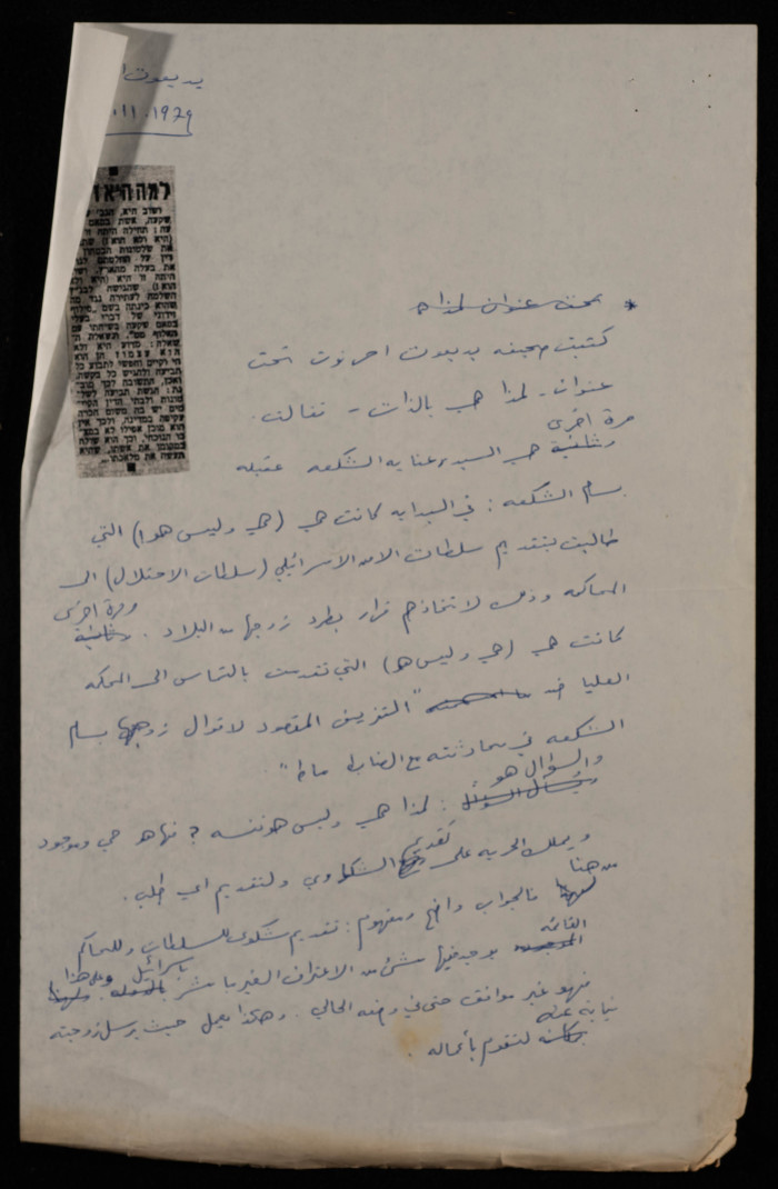 Translated from Hebrew into Arabic, this document shows a cutting from the Yedioth Ahronoth Newspaper published in 1979 featuring a news piece entitled "Why Her?" about Bassam Shak'a's mentality and his wife Inaya who demanded that the Israeli Occupation Forces be brought before court following their decision to deport her husband Bassam Shak'a.