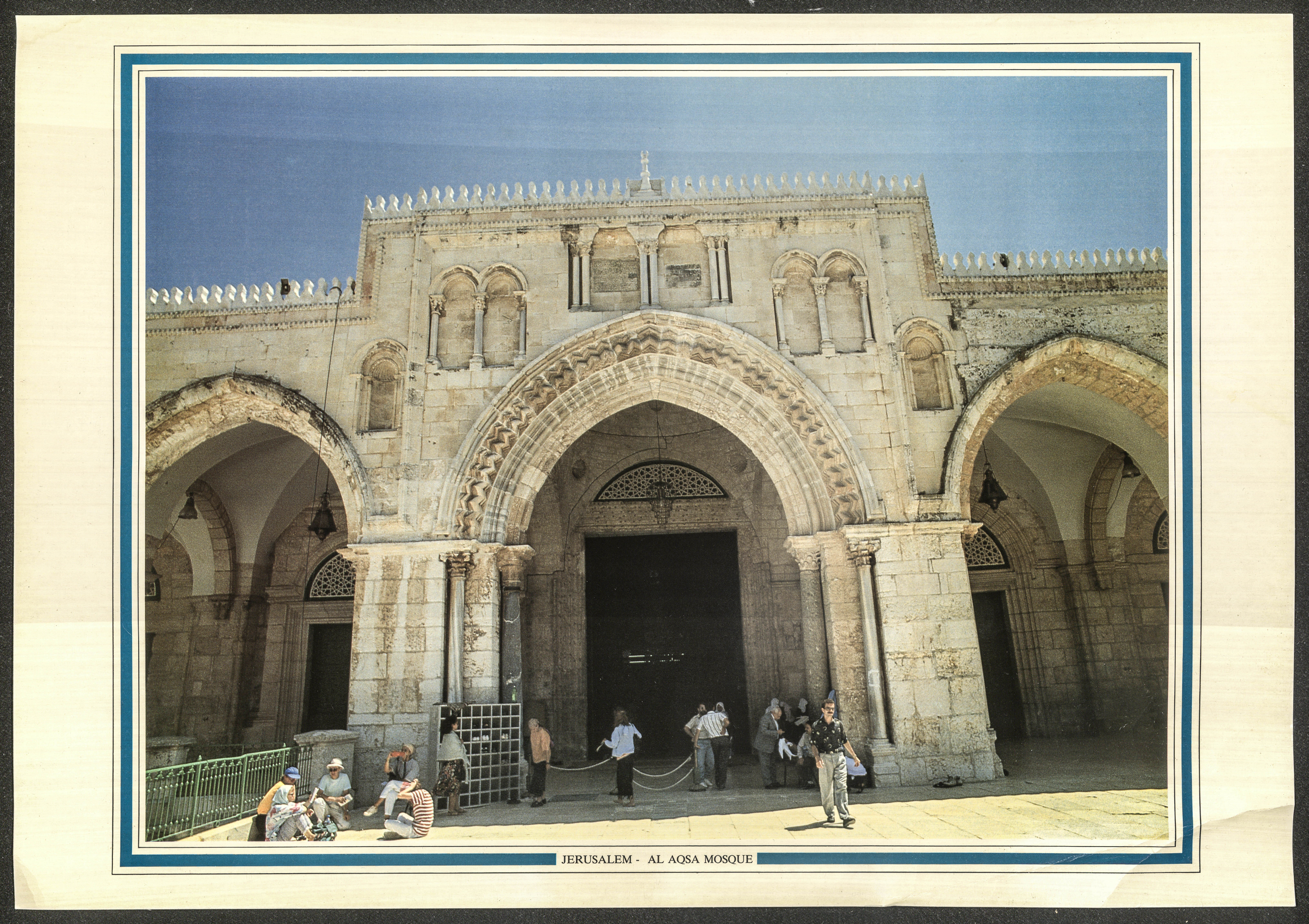 Found in Sanabel Centre for Studies and Popular Patrimony Collection, this colour poster contains a photograph titled, "Jerusalem - Al-Aqsa Mosque".