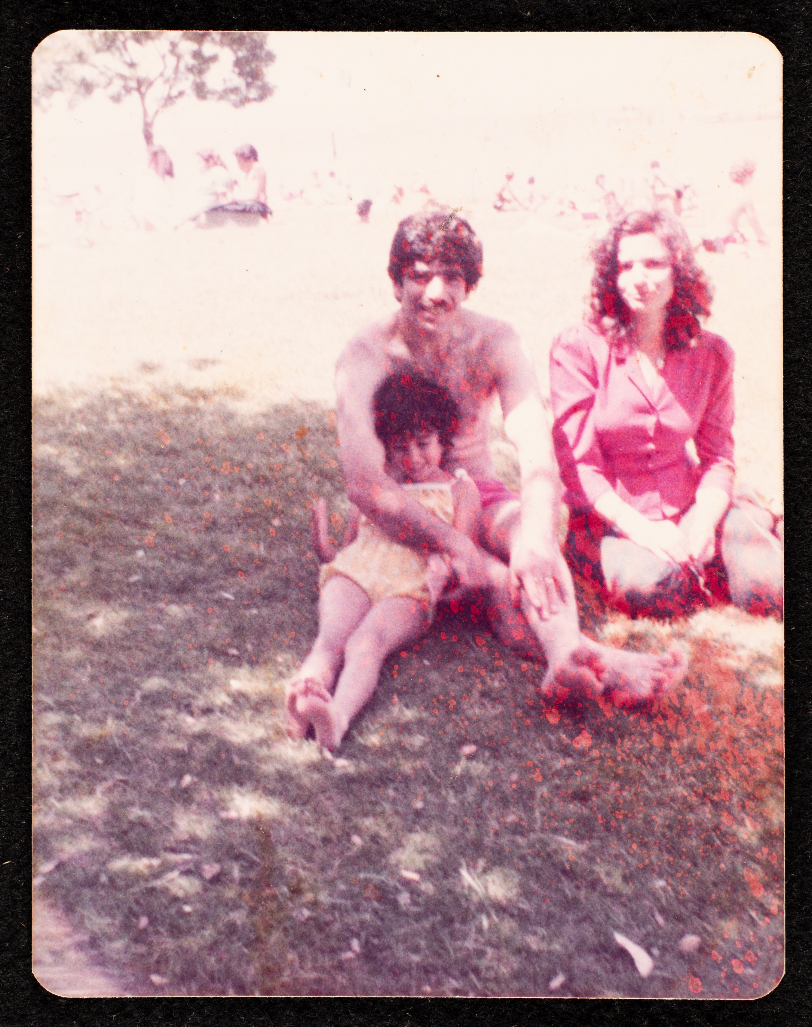 This photograph shows Fo'ad Qare holding an unknown child and Ester Habash sitting in a public park in the United States of America.