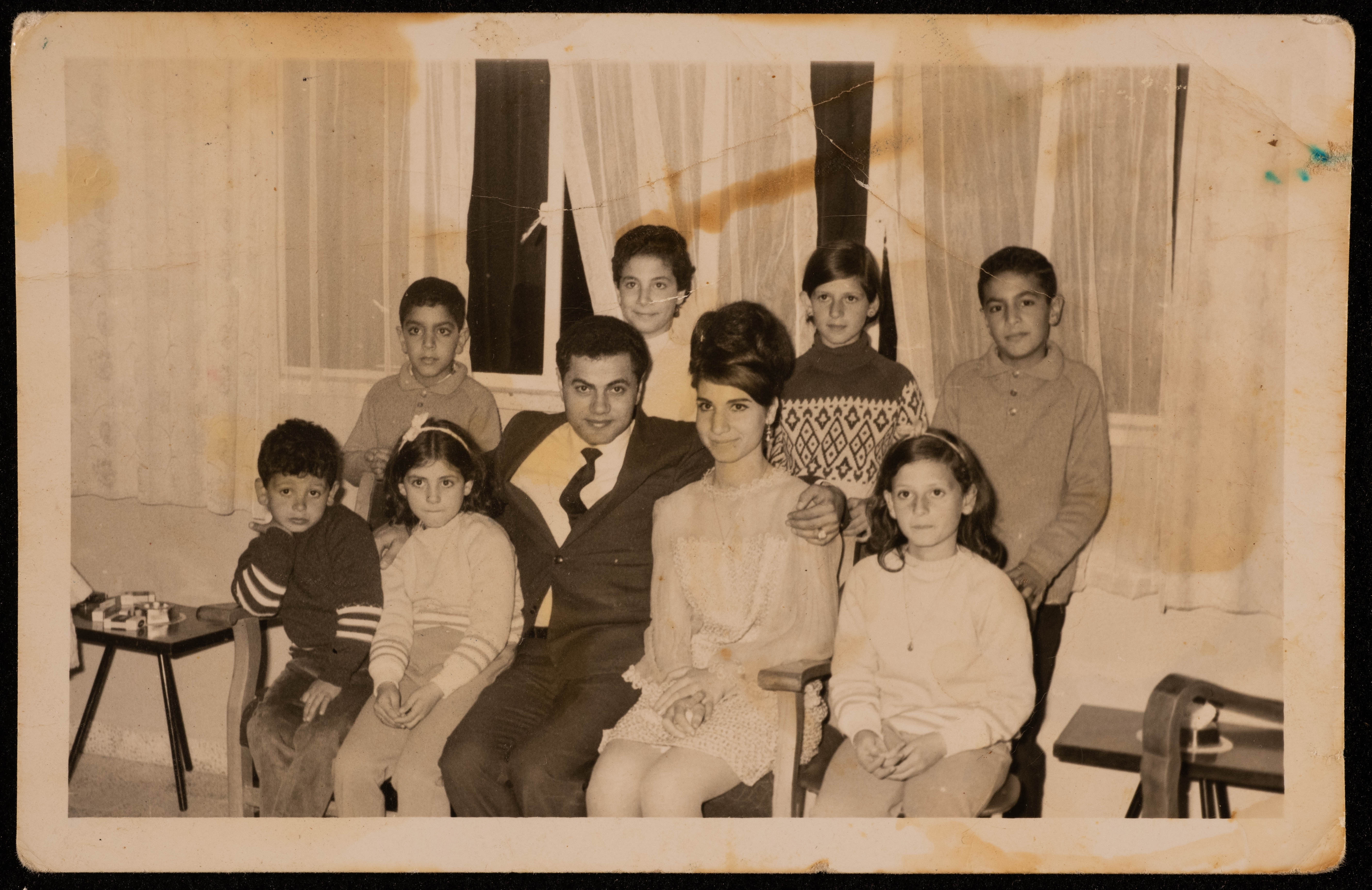 صورة غير مؤرخة، لرجل يرتدي بدلة رسمية، وامرأة مرتديةً فستاناً، جالسين وحولهم مجموعة أطفال لم تُحدد أسماؤهم.