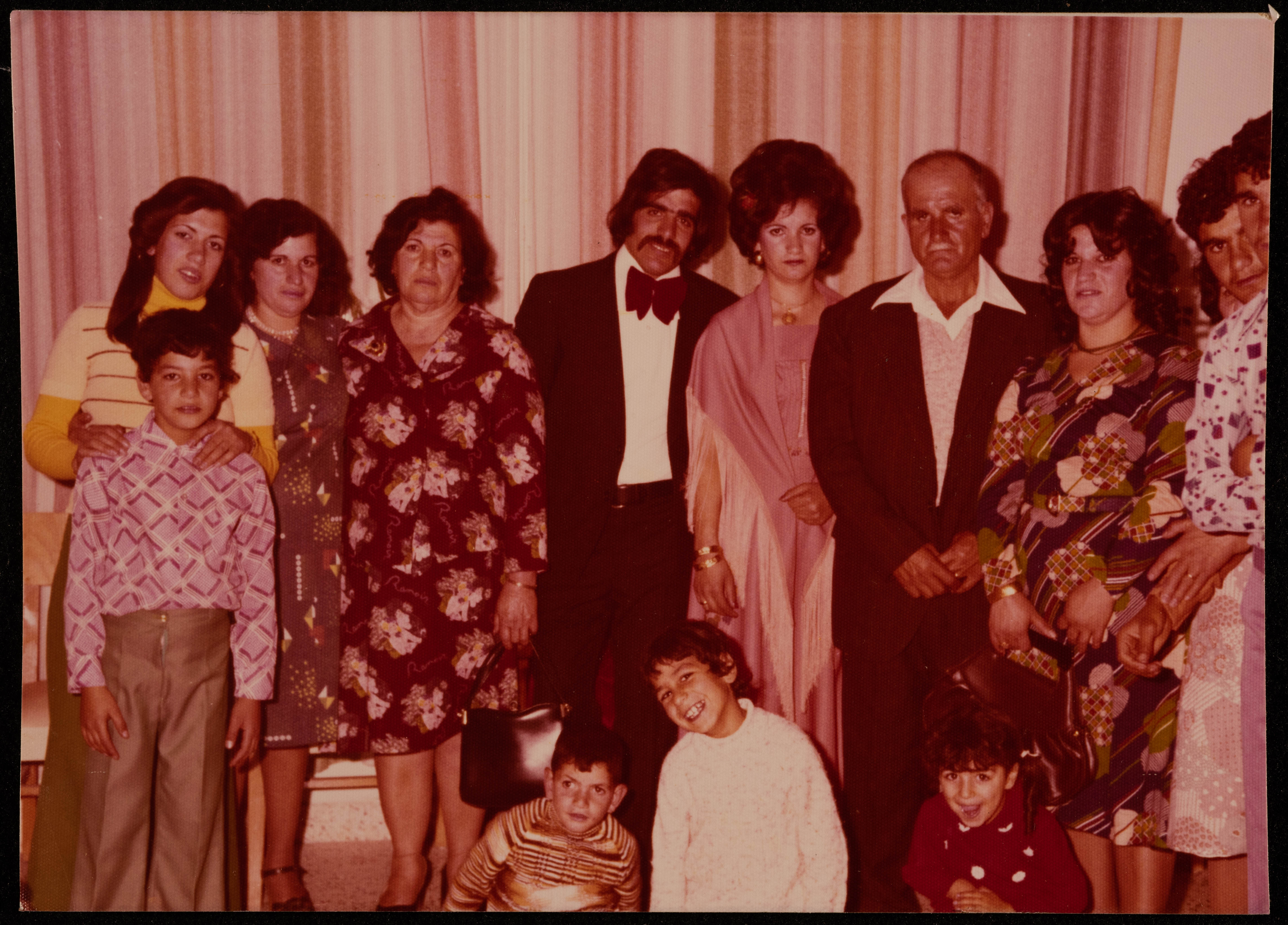 This photograph shows Fo'ad Qare and Lillian Izz on their engagement day, from the left appears, Nazar ad-Dalu and her brother, Nilly Habash, Salma Habash, Salma Habash, Samir Qare, Lillian Izz, a woman whose name isn't identified, Saba Izz, Wiliam Izz, and in the front sits, from the left, Issa Izz, a child whose name isn't identified, and Taghreed el-Hilo.