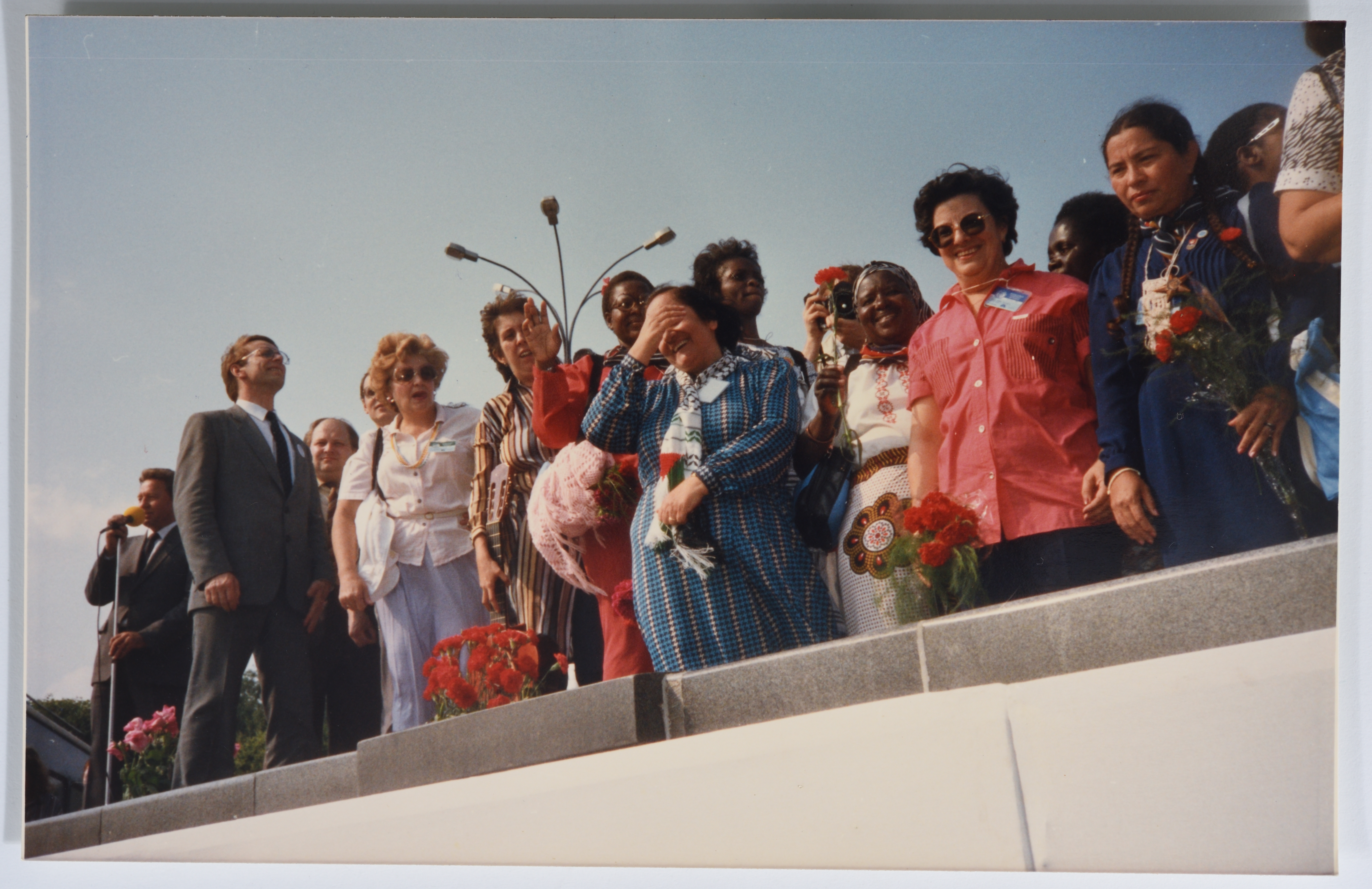 صورة ملونة تتوسطها عصام عبد الهادي مع الوفود المشاركة في المؤتمر العالمي للمرأة عام 1987 في موسكو.