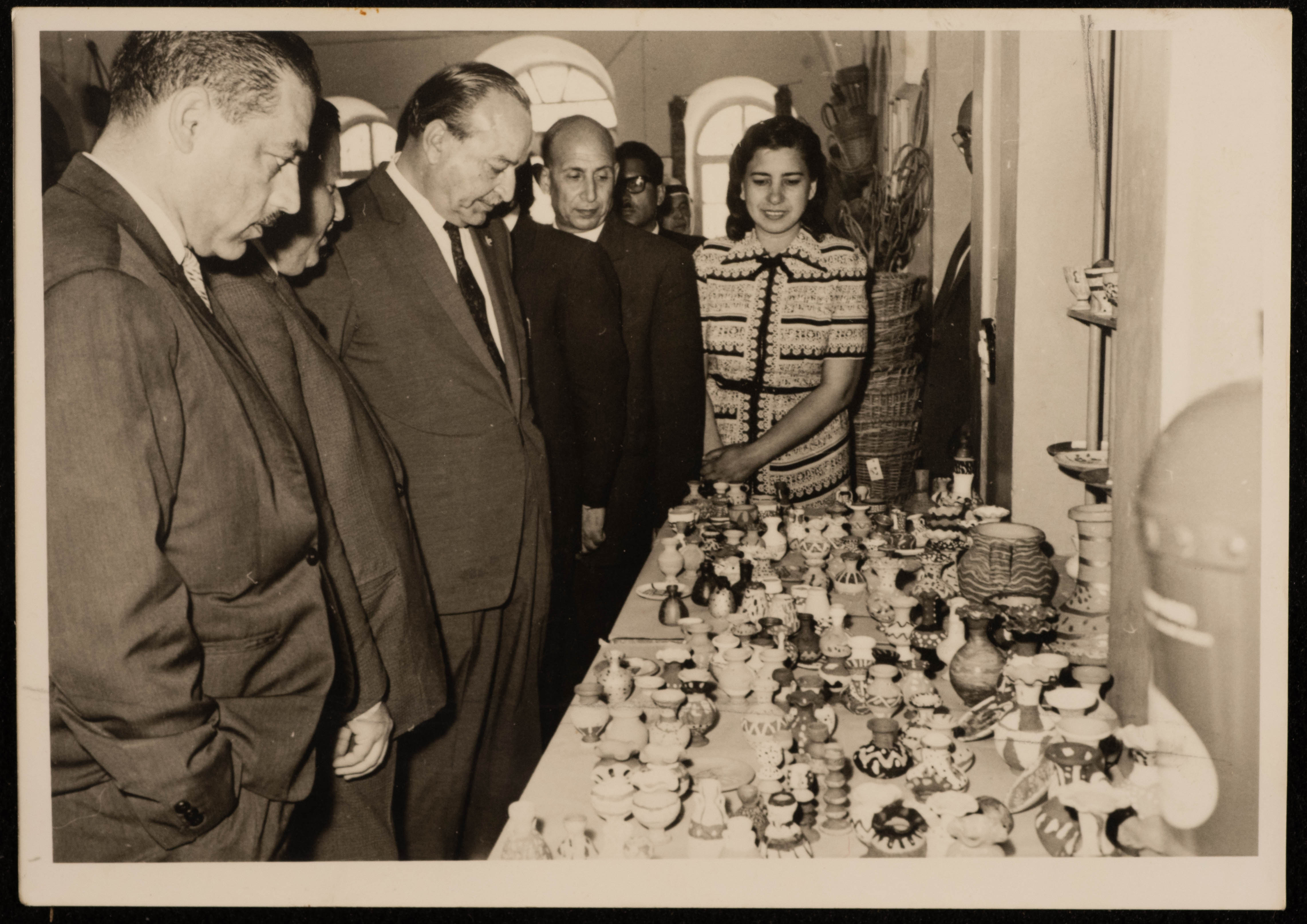 صورة جماعية غير مؤرخة، تظهر فاطمة المحب وعلى يمينها حسني الأشهب مدير التربية والتعليم ثم محافظ القدس أنور الخطيب ثم عزمي الأرناؤوط مدير المدرسة، وذلك في معرض وسائل الإيضاح في المدارس الذي أشرفت عليه المحب.