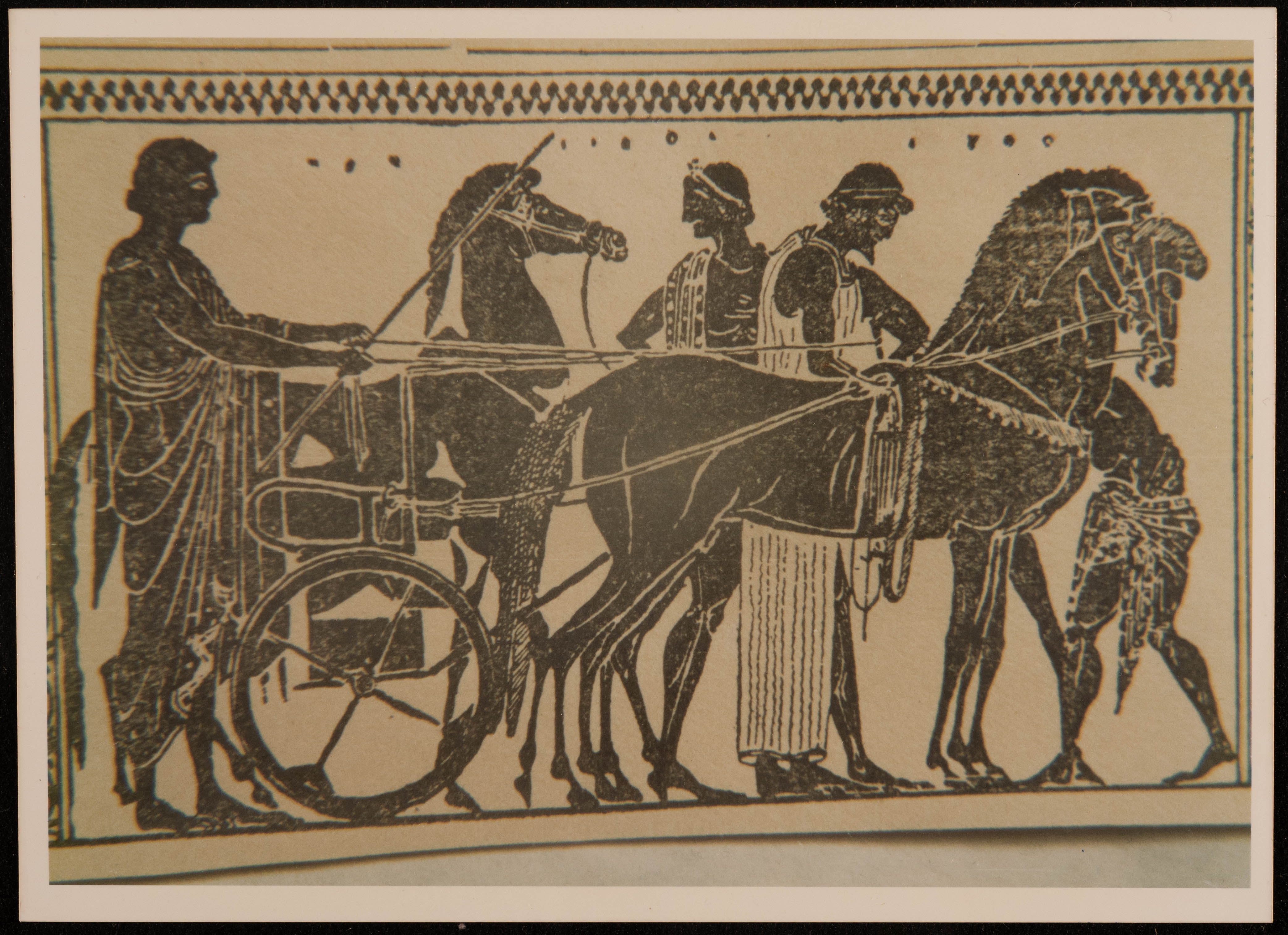 صورة غير مؤرخة، تظهر تماثيل فرعونية وعربة بأحصنة، كانت فاطمة المحب تصورها لضرورات الدراسة، وذلك أثناء دراستها في المعهد العالي للفنون الجميلة في القاهرة.