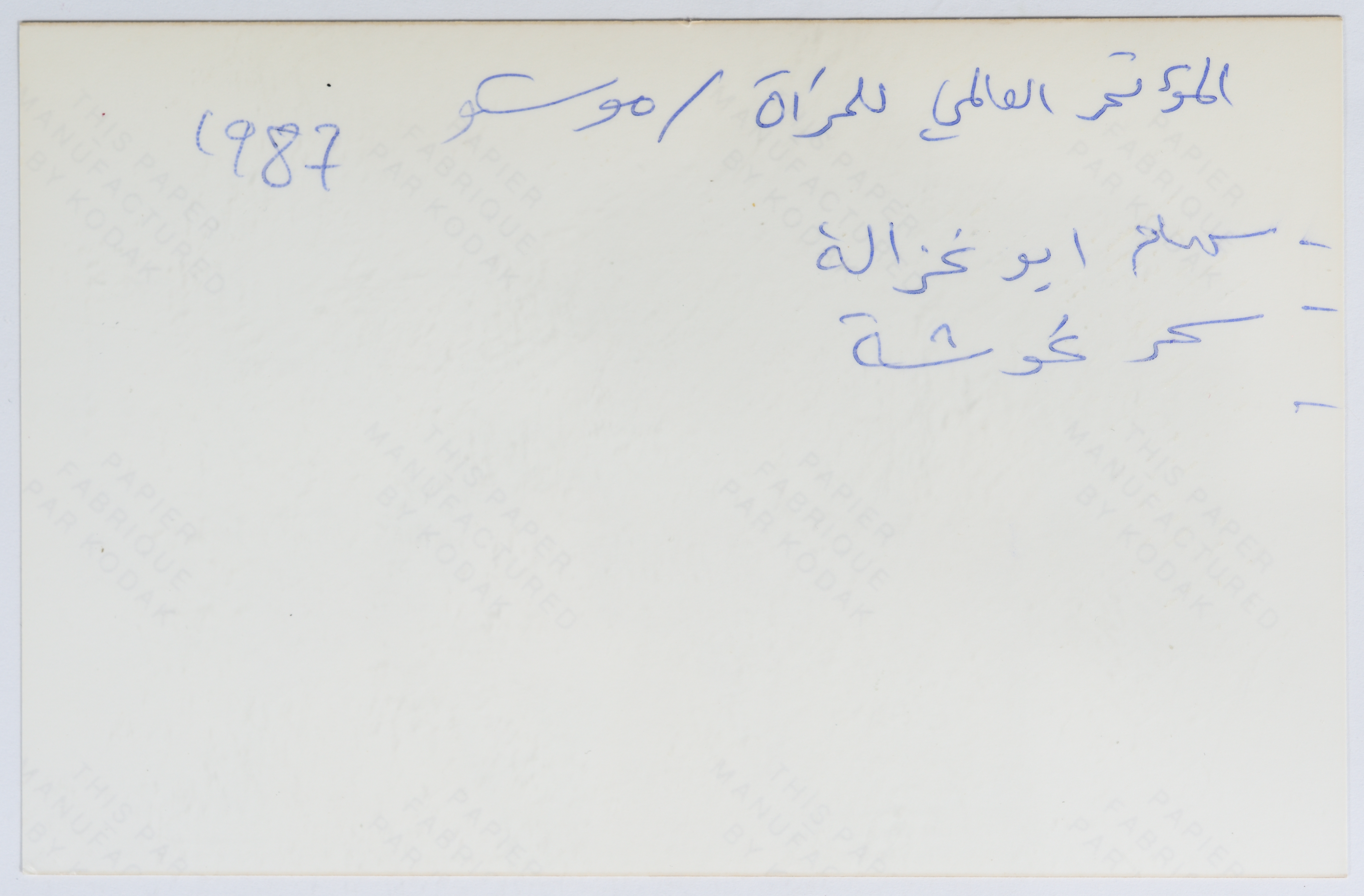 صورة ملونة من مشاركة الاتحاد العام للمرأة الفلسطينية في مؤتمر المرأة العالمي في موسكو وتظهر في الصورة كل من: سهام أبو غزالة وسحر غوشة.