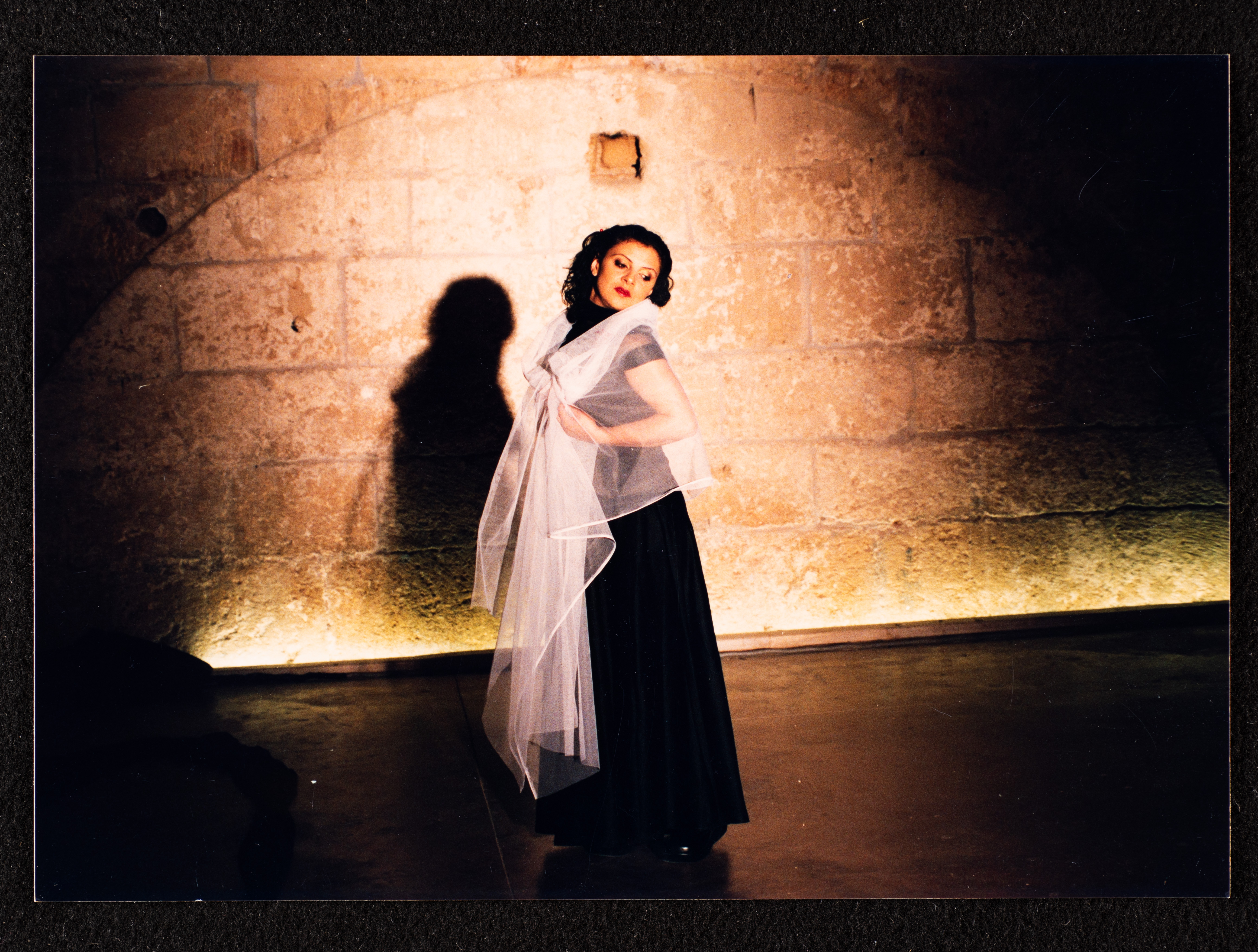 This photograph captures a glimpse of the performance of, "Hathihy Ana" [This is Me], a play scripted and directed by Nisreen Faʿur; performed at al-Midan Theatre in Haifa by Maysa Khamis Ammury; filmed by Bashar Thaher.