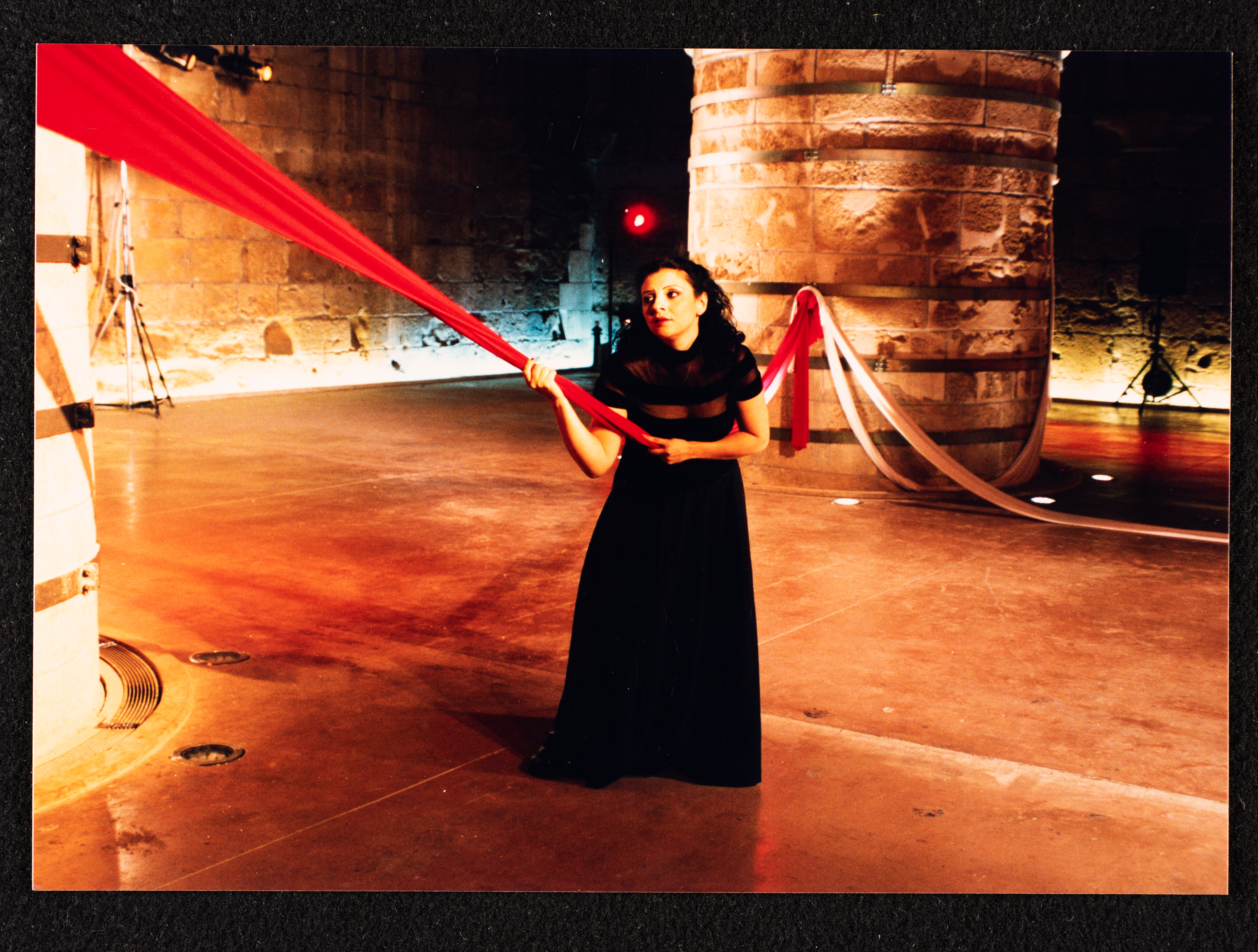 This photograph captures a glimpse of the performance of, "Hathihy Ana" [This is Me], a play scripted and directed by Nisreen Faʿur; performed at al-Midan Theatre in Haifa by Maysa Khamis Ammury; filmed by Bashar Thaher.