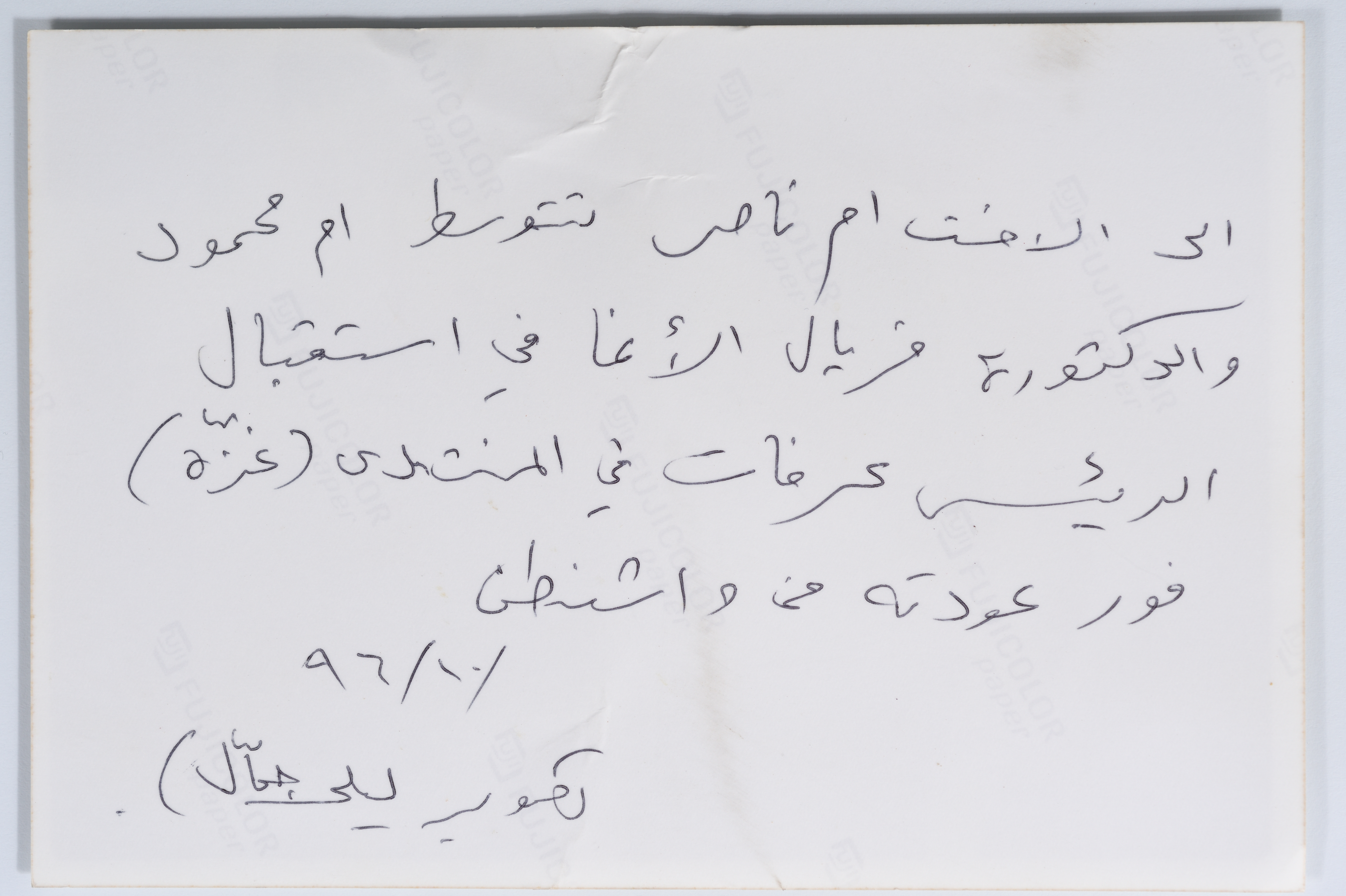 A colour photograph of Mrs. Salwa Abu Khadra, Ms. Najla Yassin and Ms. Feryal Al Agha during their reception to the late President Yaser ʿarafat after his return from Washington to Gaza in 1996