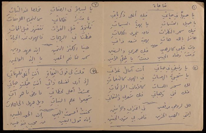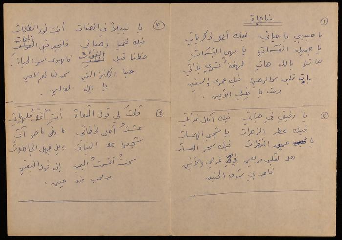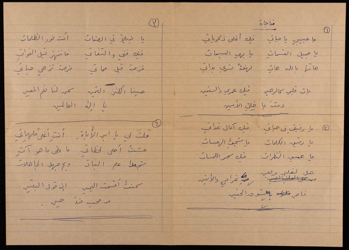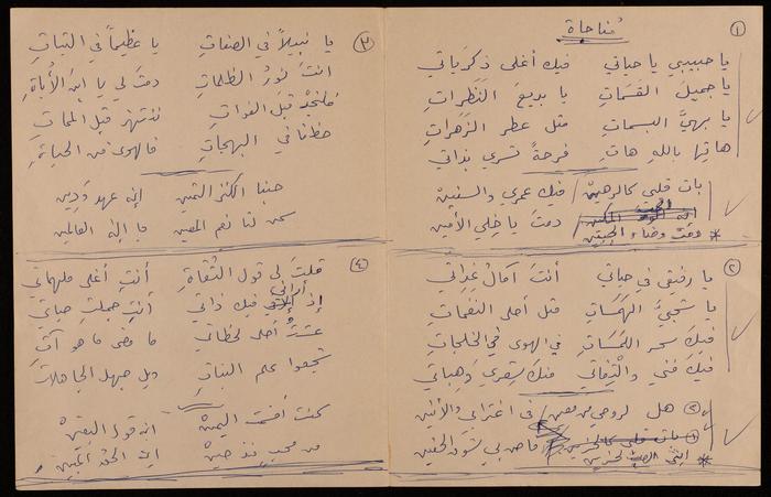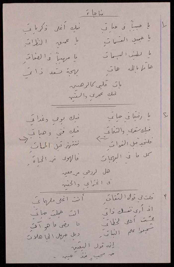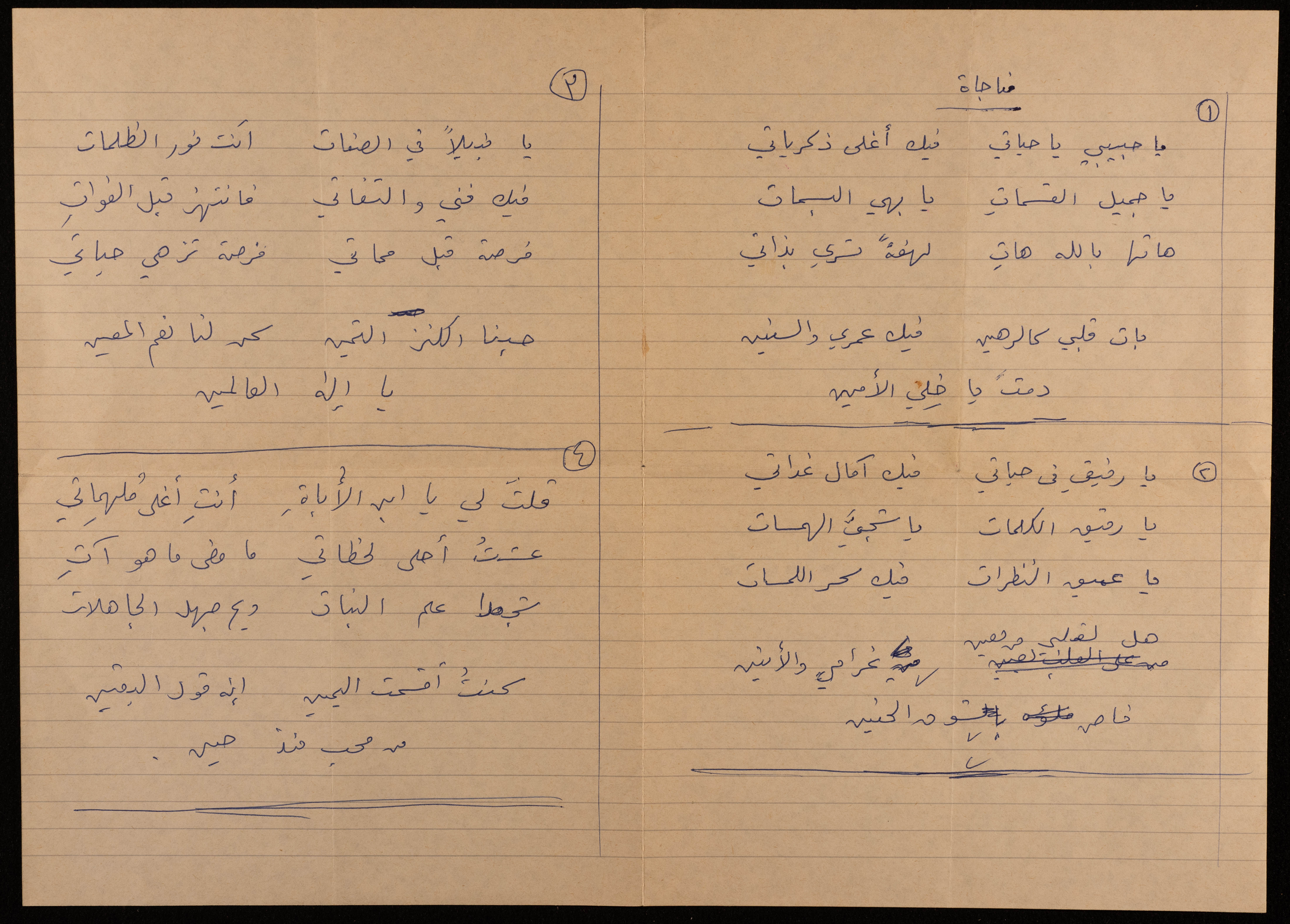 وثيقة مكتوبة بخط اليد، وٌجدت في مجموعة عمر الجلاد الأرشيفية، وهي عبارة عن قصيدة للفنانة التشكيلية فاطمة المٌحب، بعنوان: "مناجاة"، تناجي فيها الحبيب وتتحدث عن صفاته الجميلة.