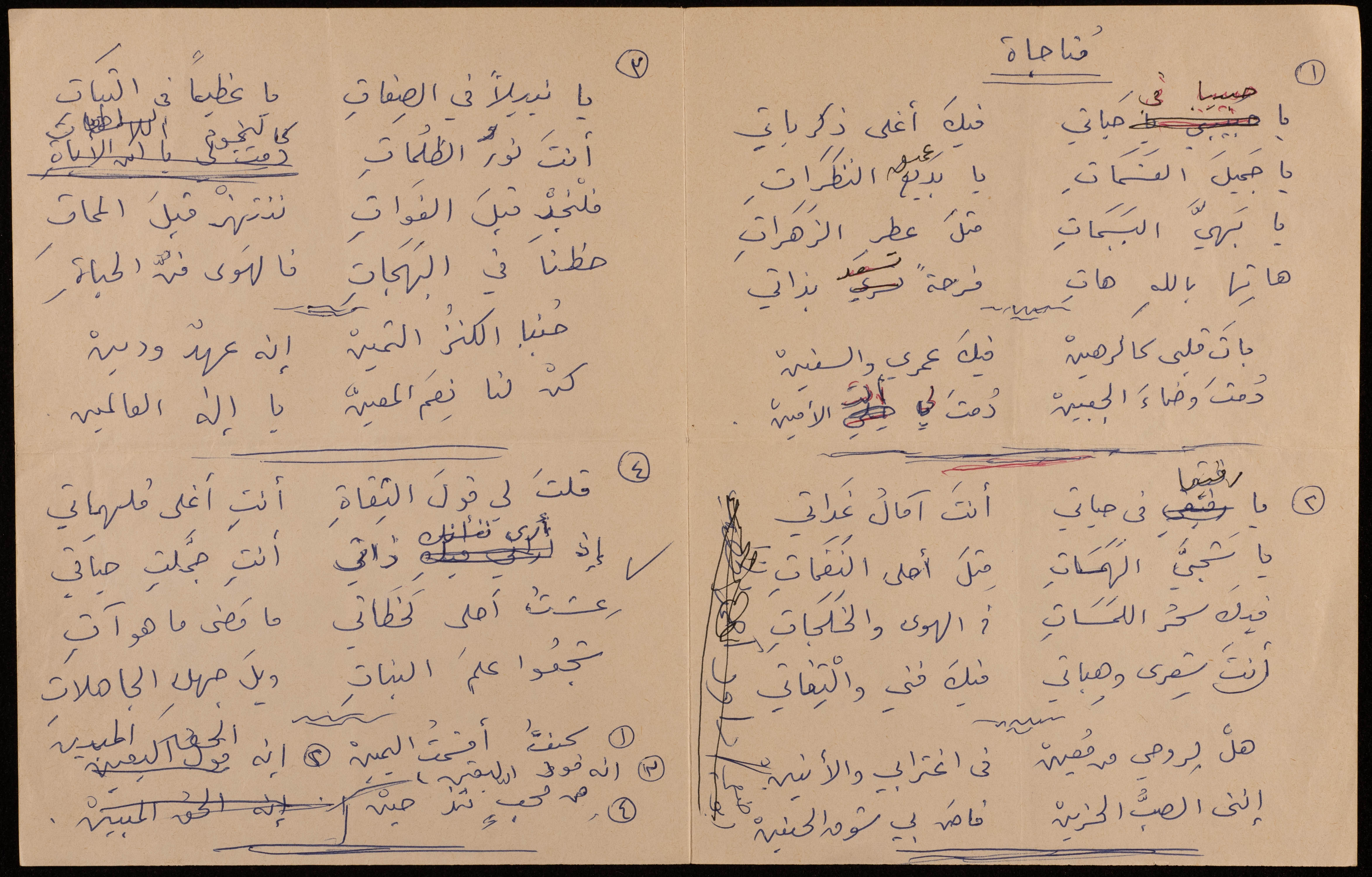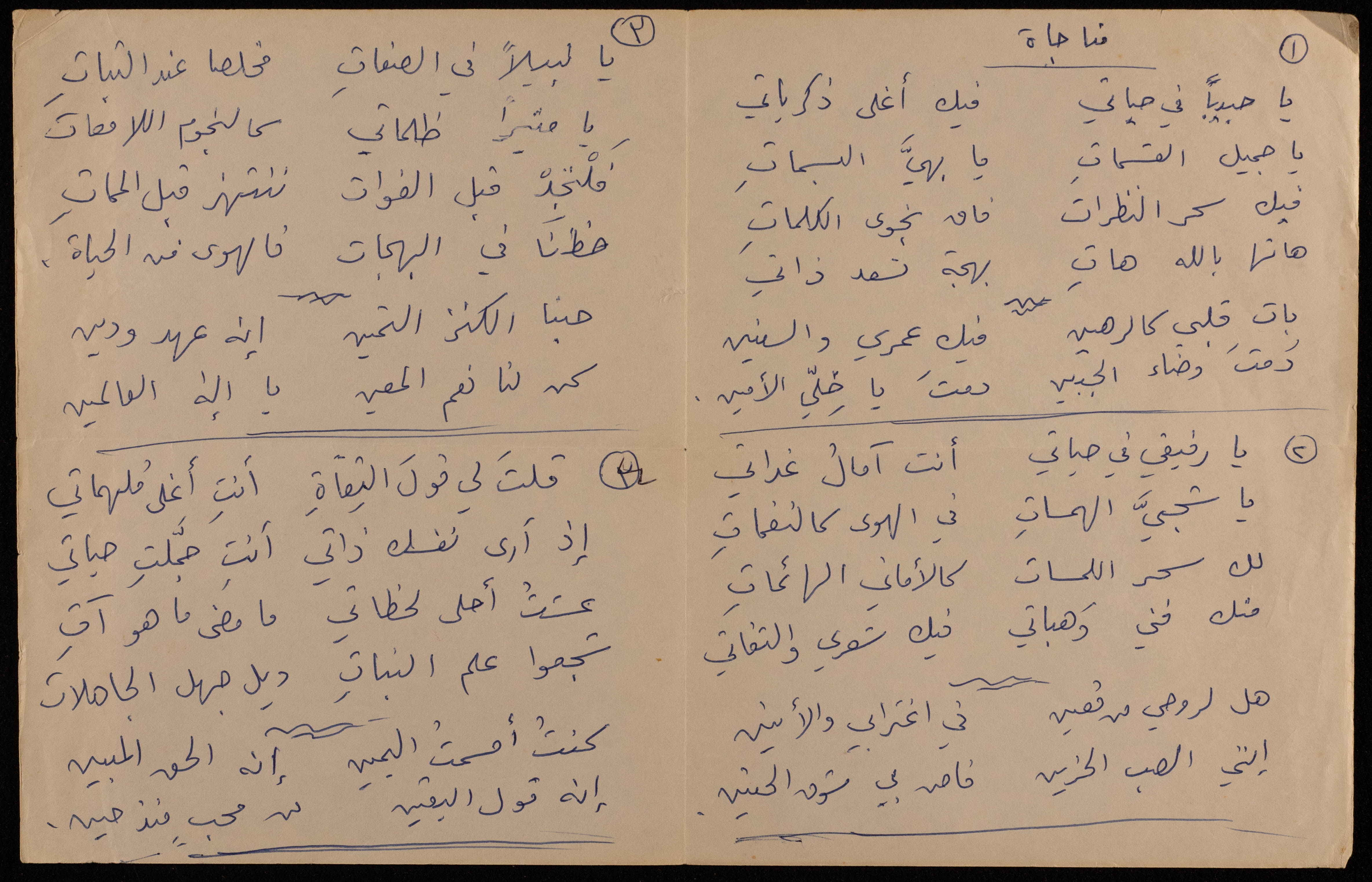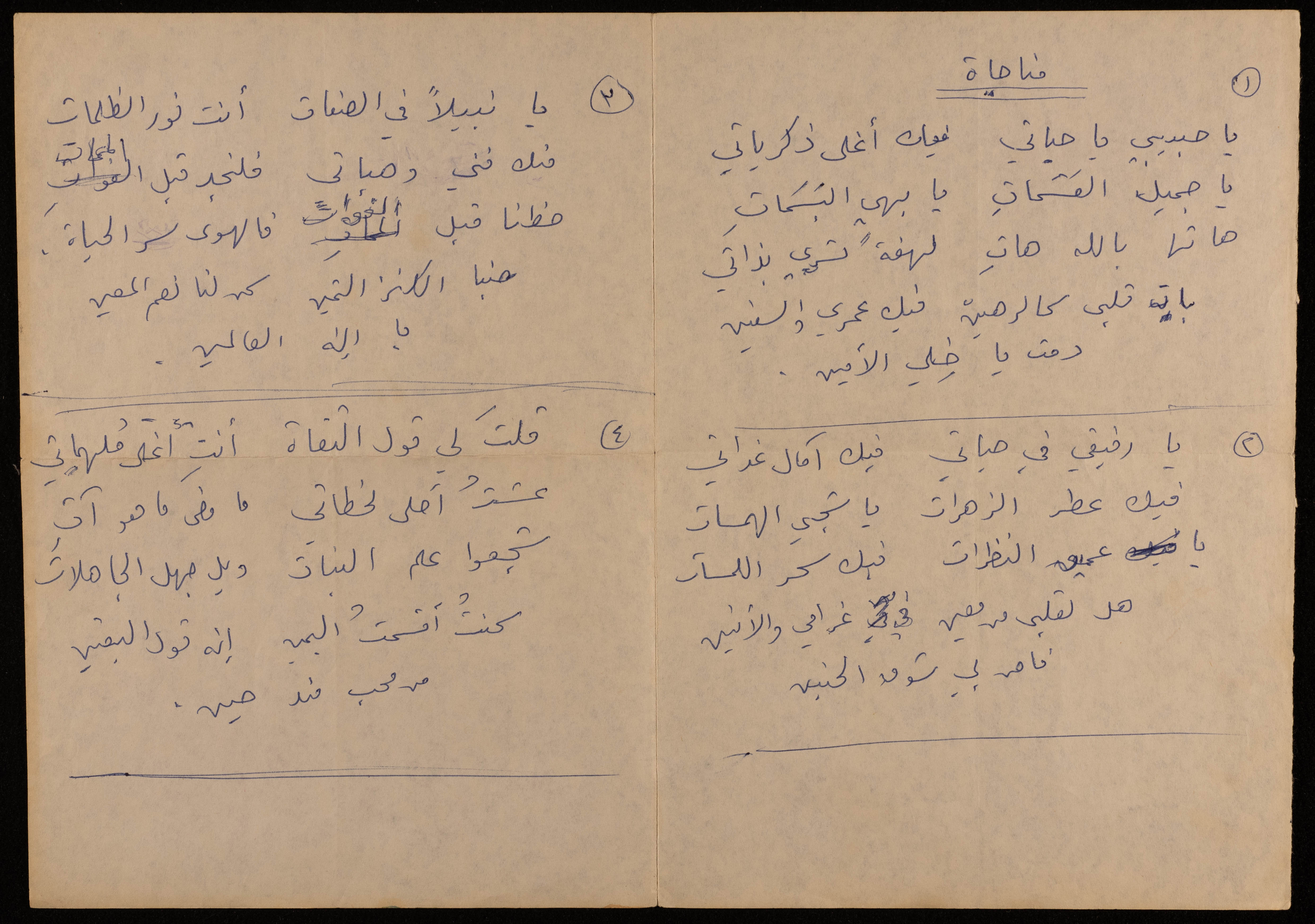 وثيقة مكتوبة بخط اليد، وٌجدت في مجموعة عمر الجلاد الأرشيفية، وهي عبارة عن قصيدة للفنانة التشكيلية فاطمة المٌحب، بعنوان: "مناجاة"، تناجي فيها الحبيب وتتحدث عن صفاته الجميلة.