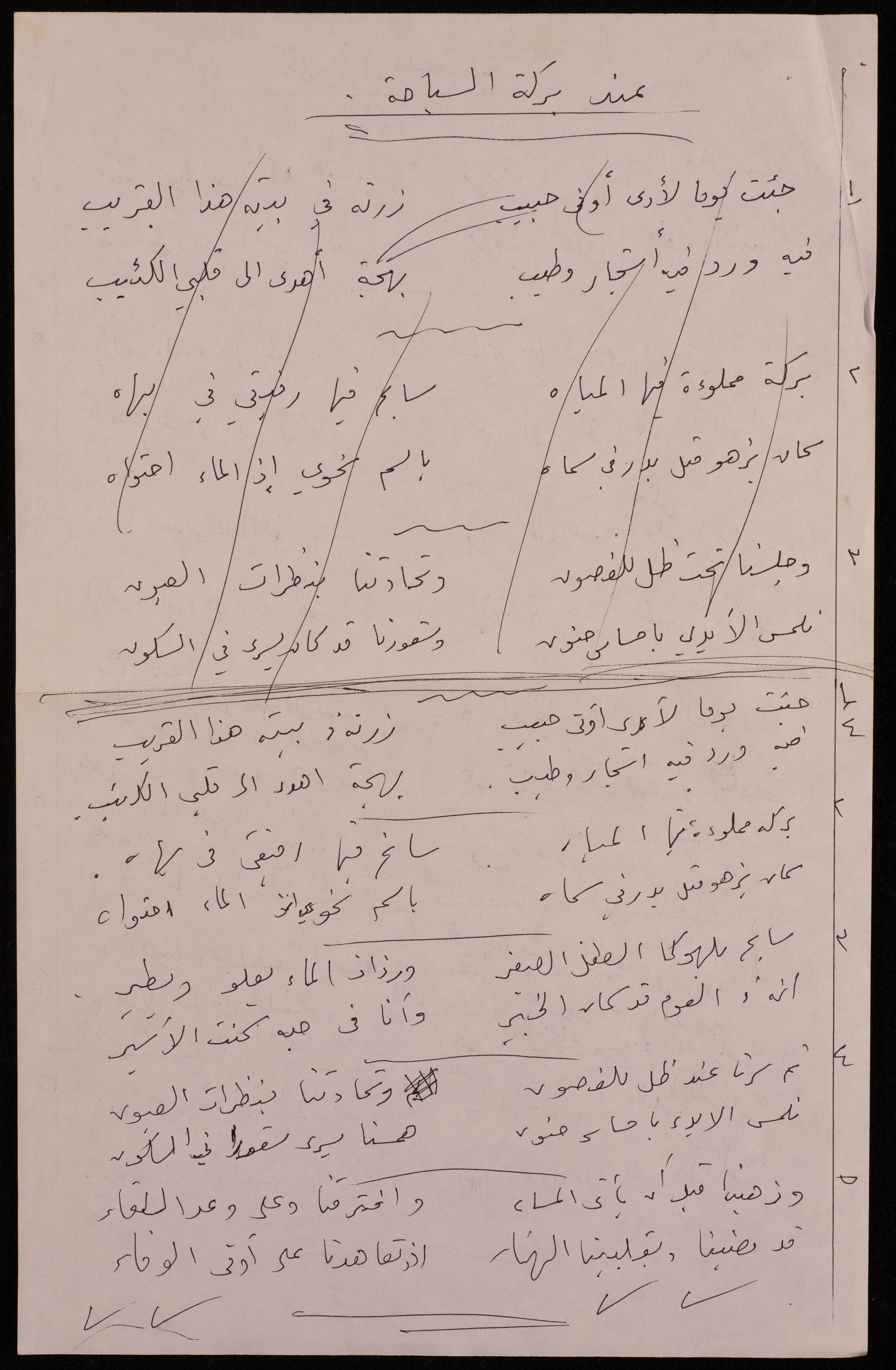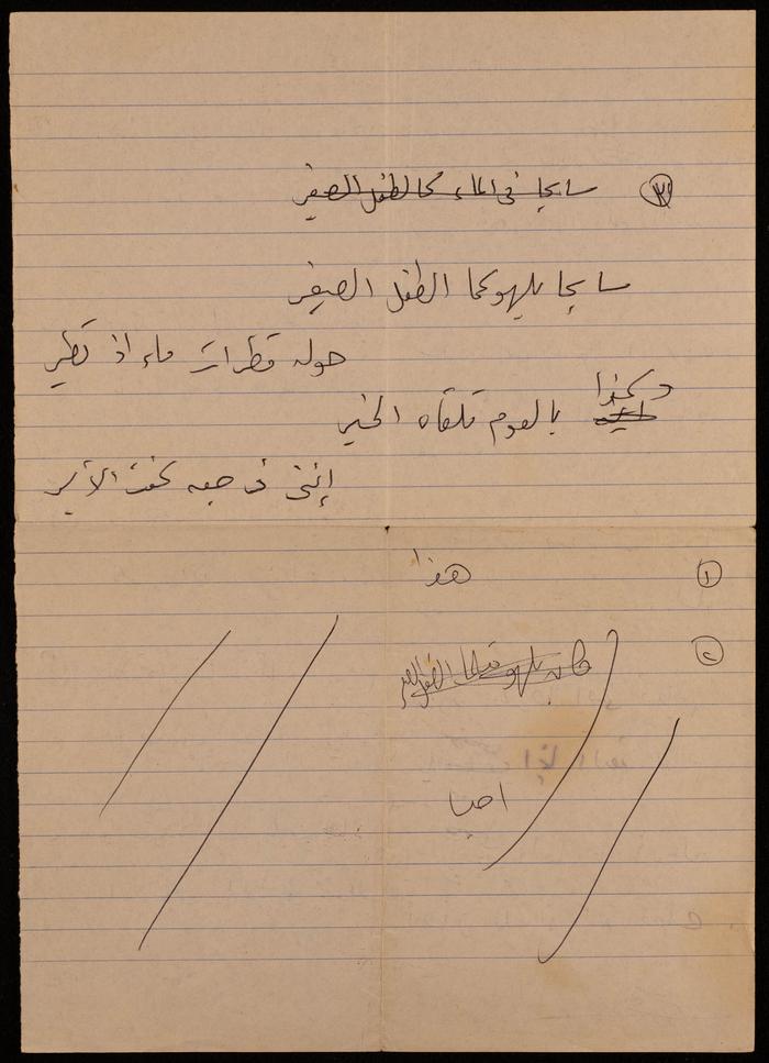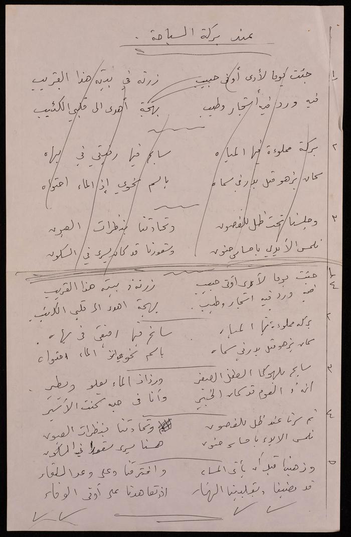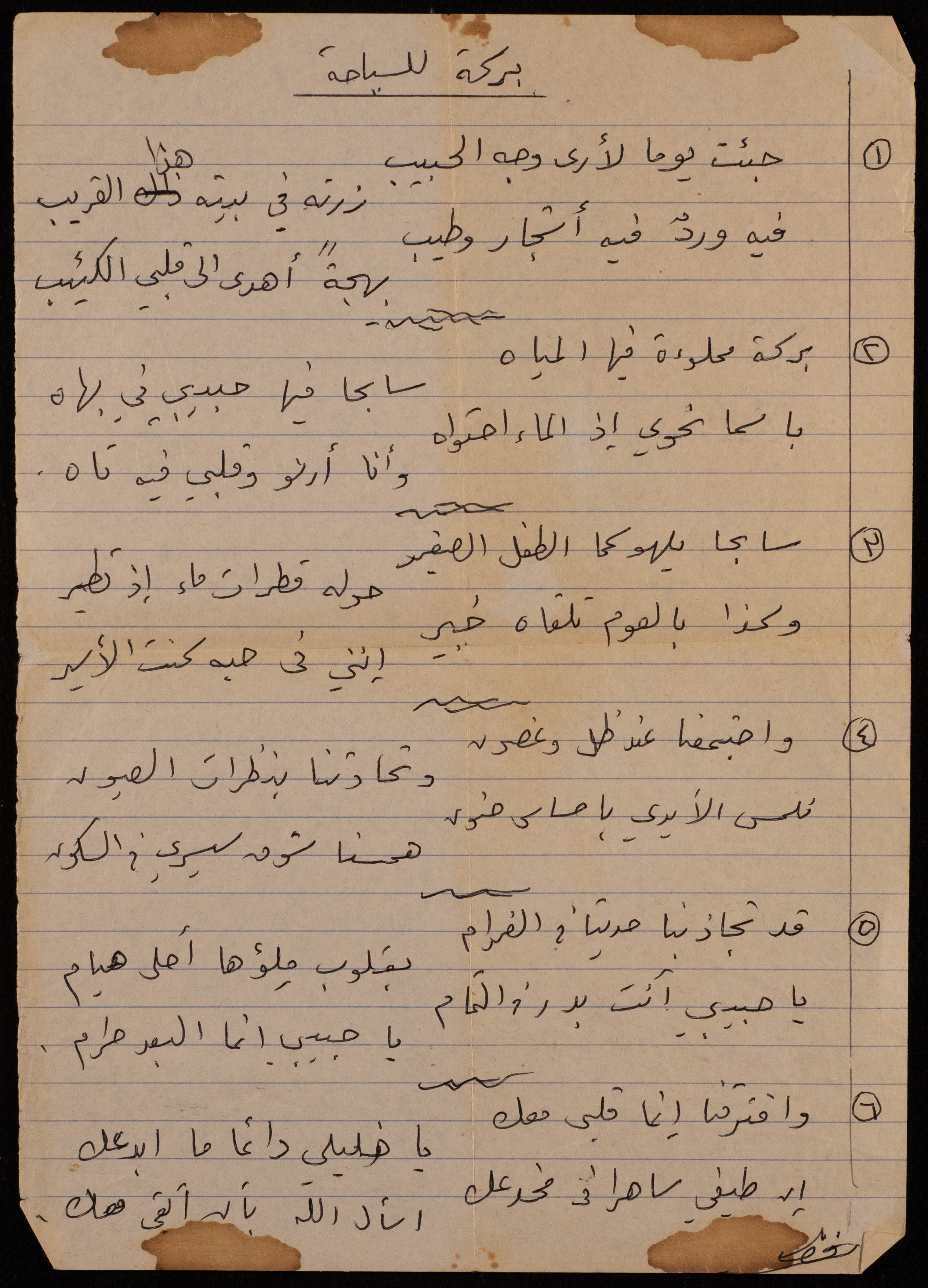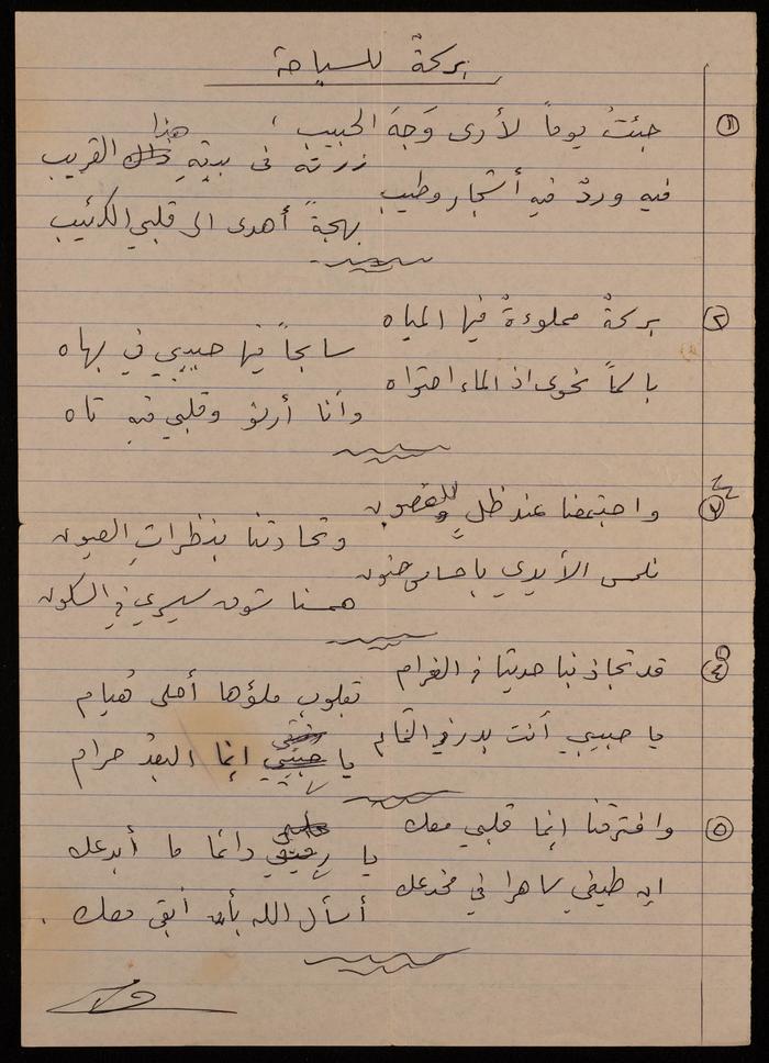 وثيقة مكتوبة بخط اليد، وٌجدت في مجموعة عمر الجلاد الأرشيفية، وهي عبارة عن قصيدة للفنانة التشكيلية فاطمة المٌحب، بعنوان: "عند بركة السباحة"، تصف فيها لقاء حبيبها عند بركة السباحة.