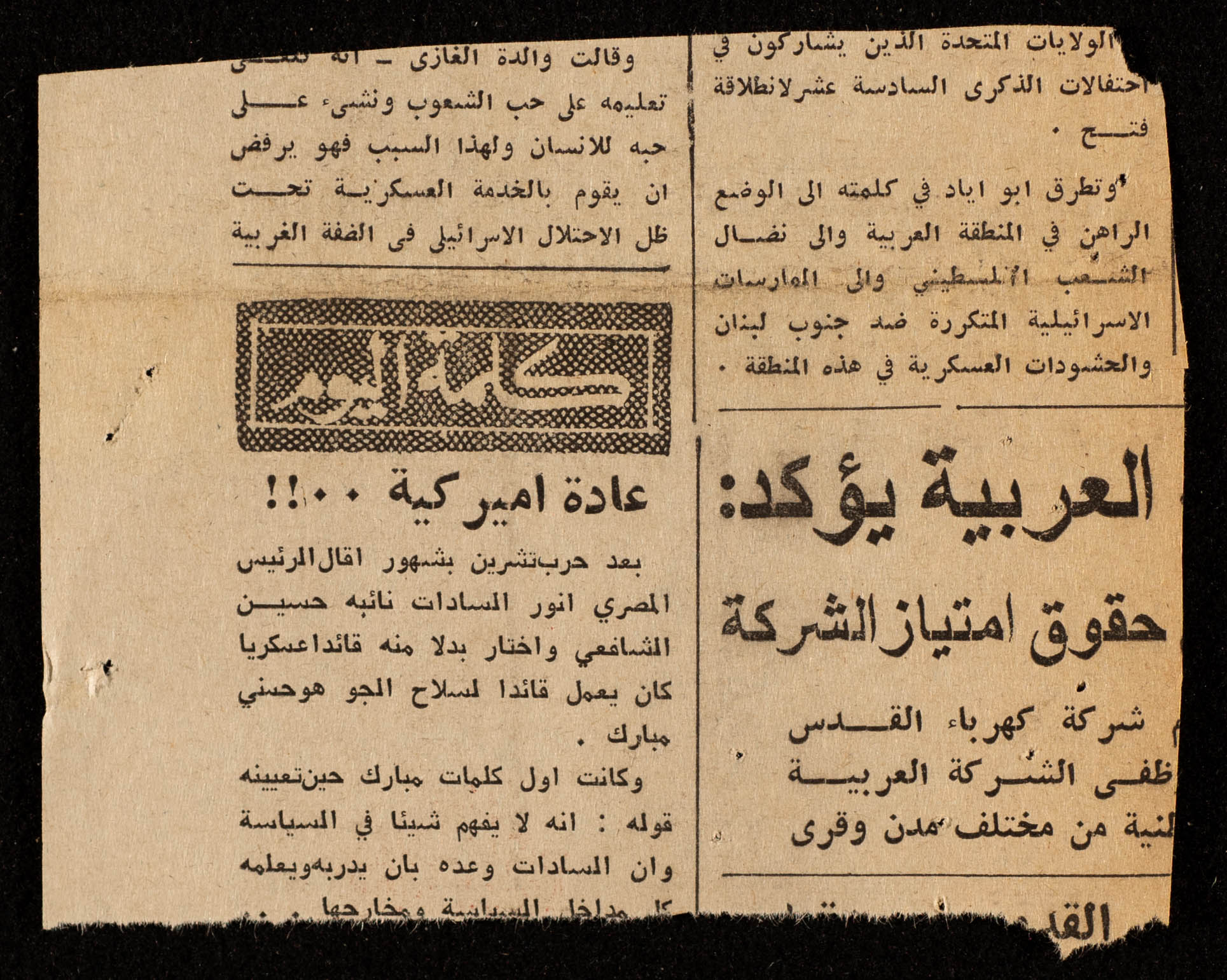 وثيقة مطبوعة باللغة العربية، تتضمن قصاصة من جريدة تتحدث عن تهنئة إدارة واعضاء مركز شباب بلاطه و خلدون عبد لحق عضو بلدية نابلس بعودة بسام الشكعة رئيس بلدية نابلس بمناسبة عودته الى ارض الوطن