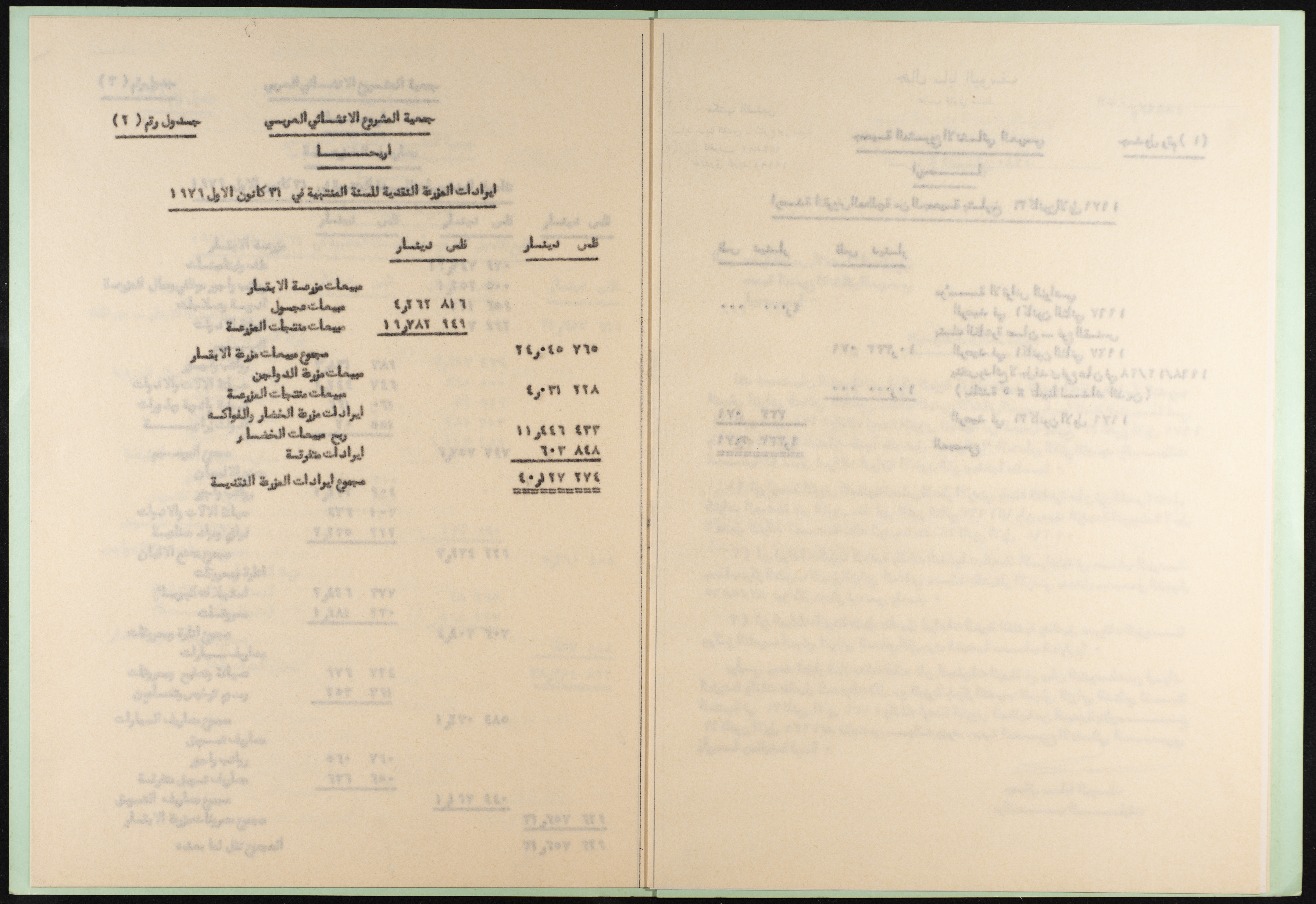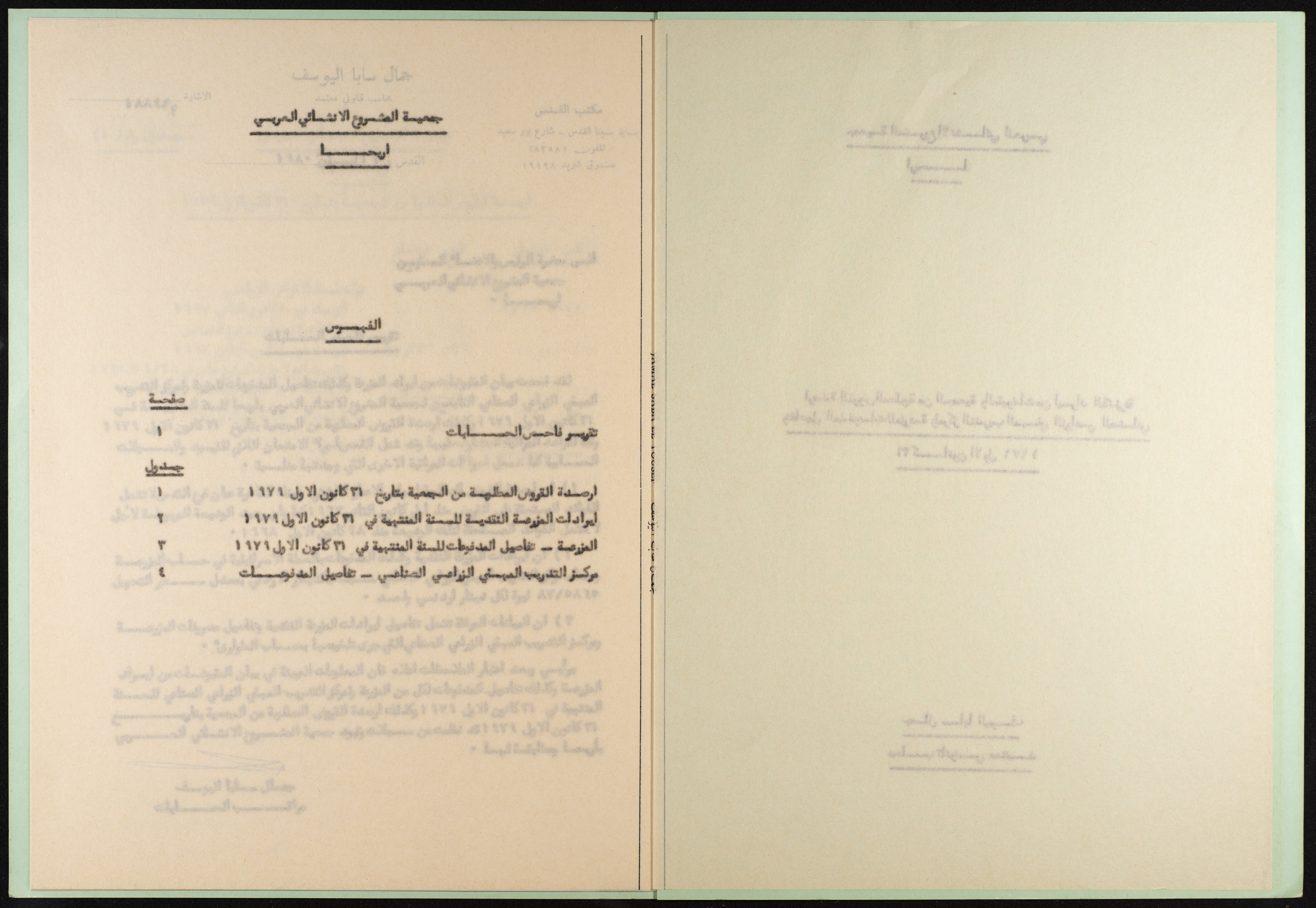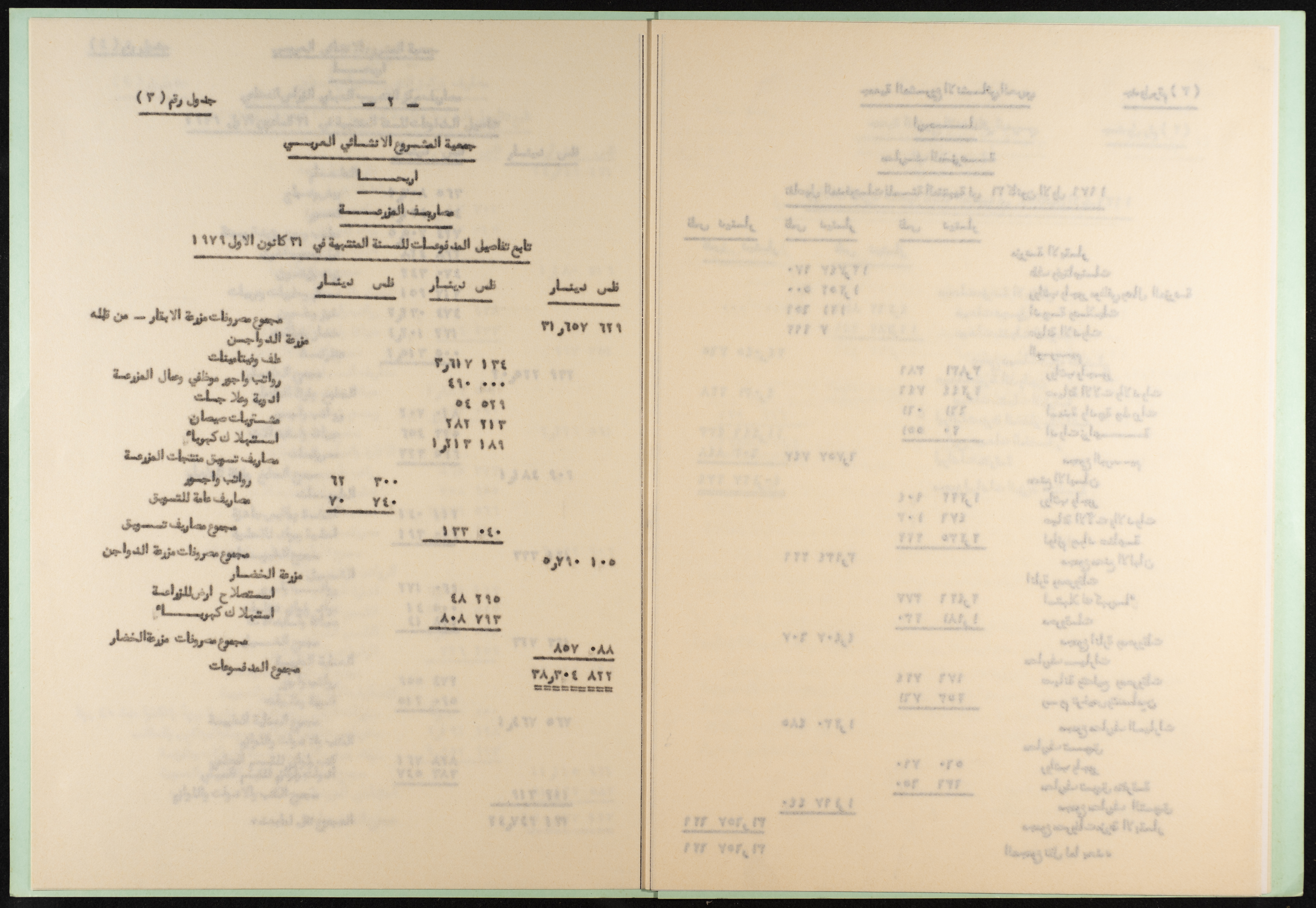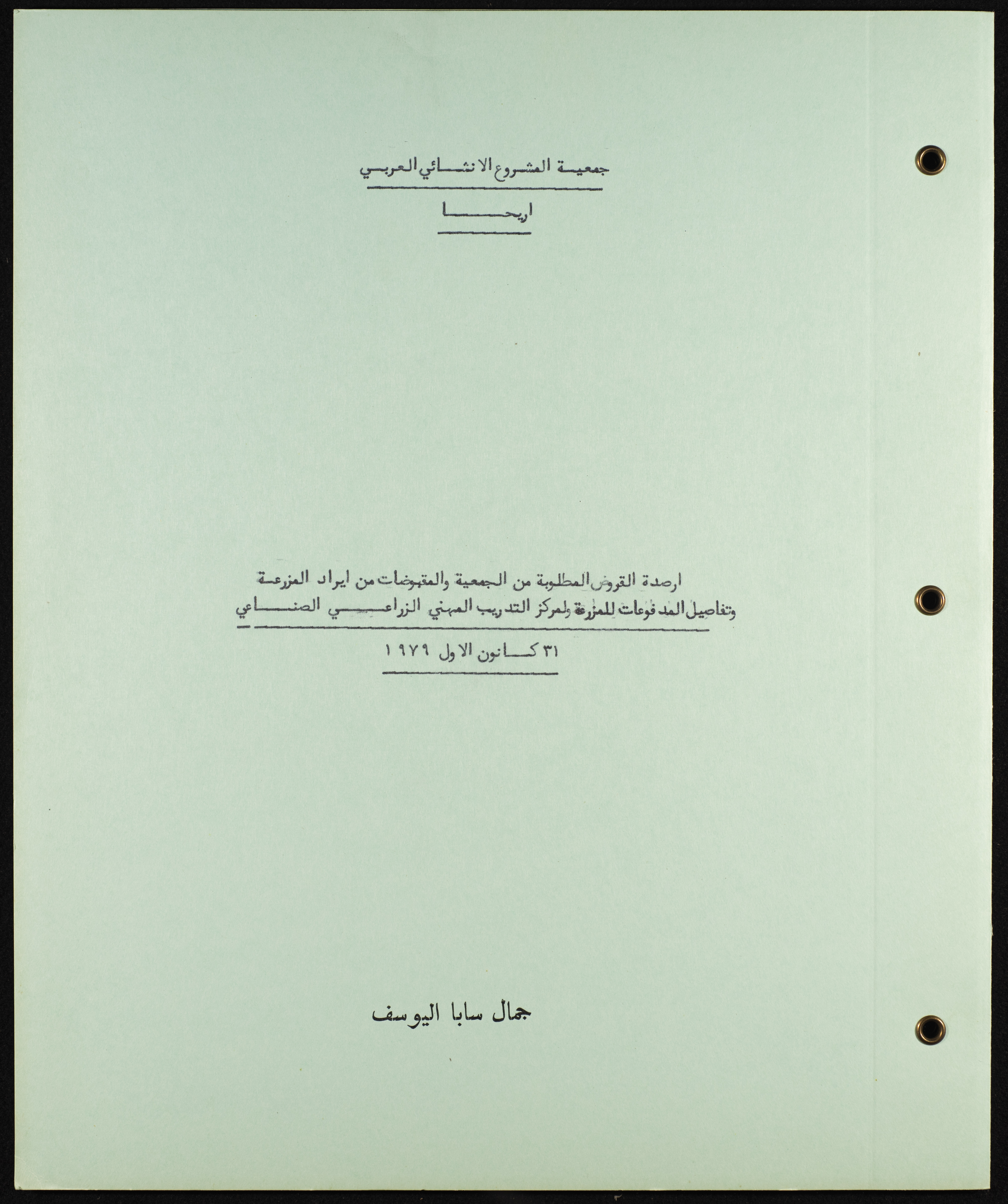 وثيقة مطبوعة باللغة العربية من مجموعة موسى العلمي، ترصد القروض المطلوبة من جمعية المشروع الإنشائي العربي في أريحا والمقبوضات من إيرادات المزرعة، والمدفوعات للمزرعة ولمركز التدريب المهني الزراعي الصناعي لتاريخ 31 كانون الثاني 1979، أعدها المحاسب القانوني جمال اليوسف بتاريخ 16 نيسان 1980.