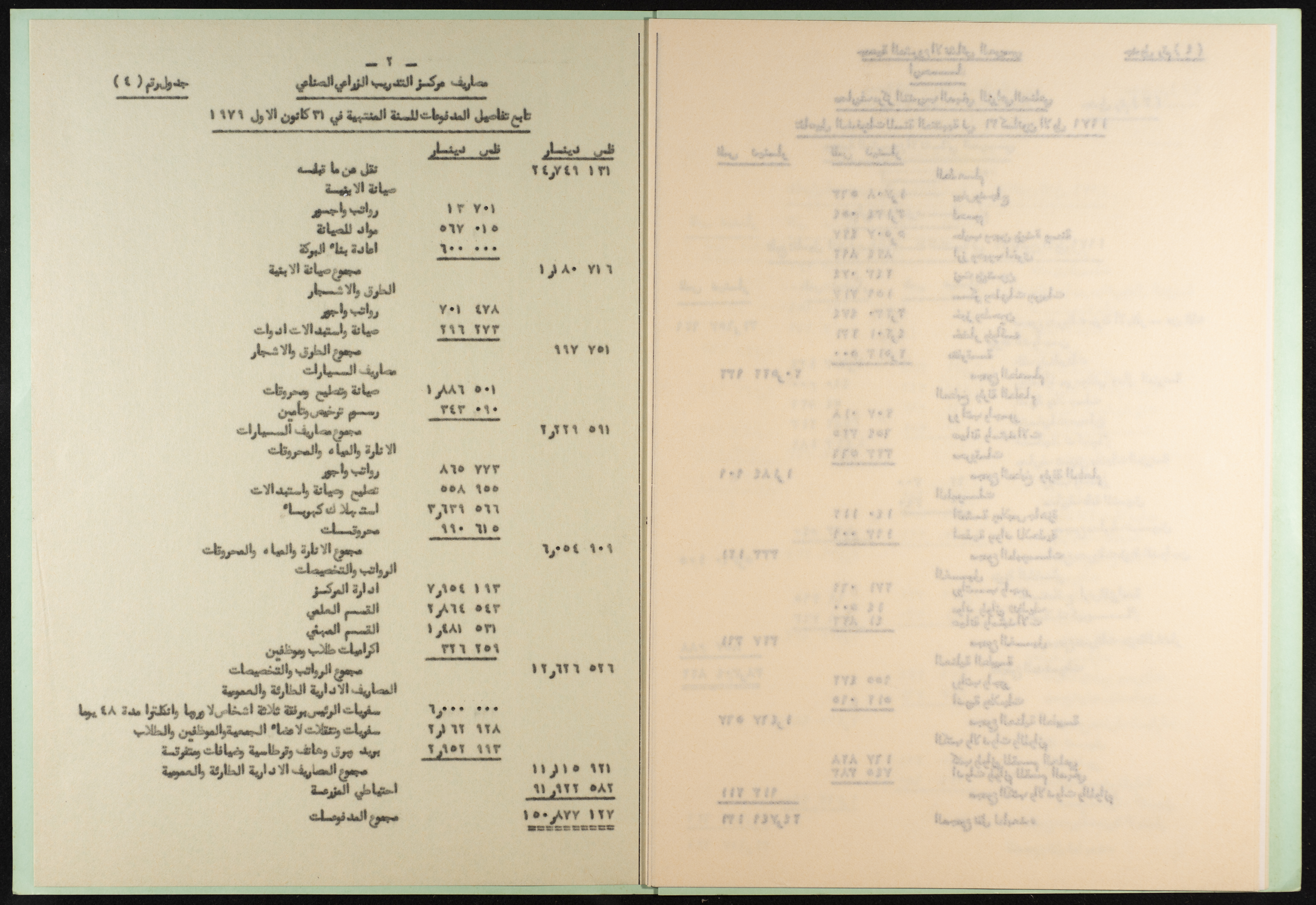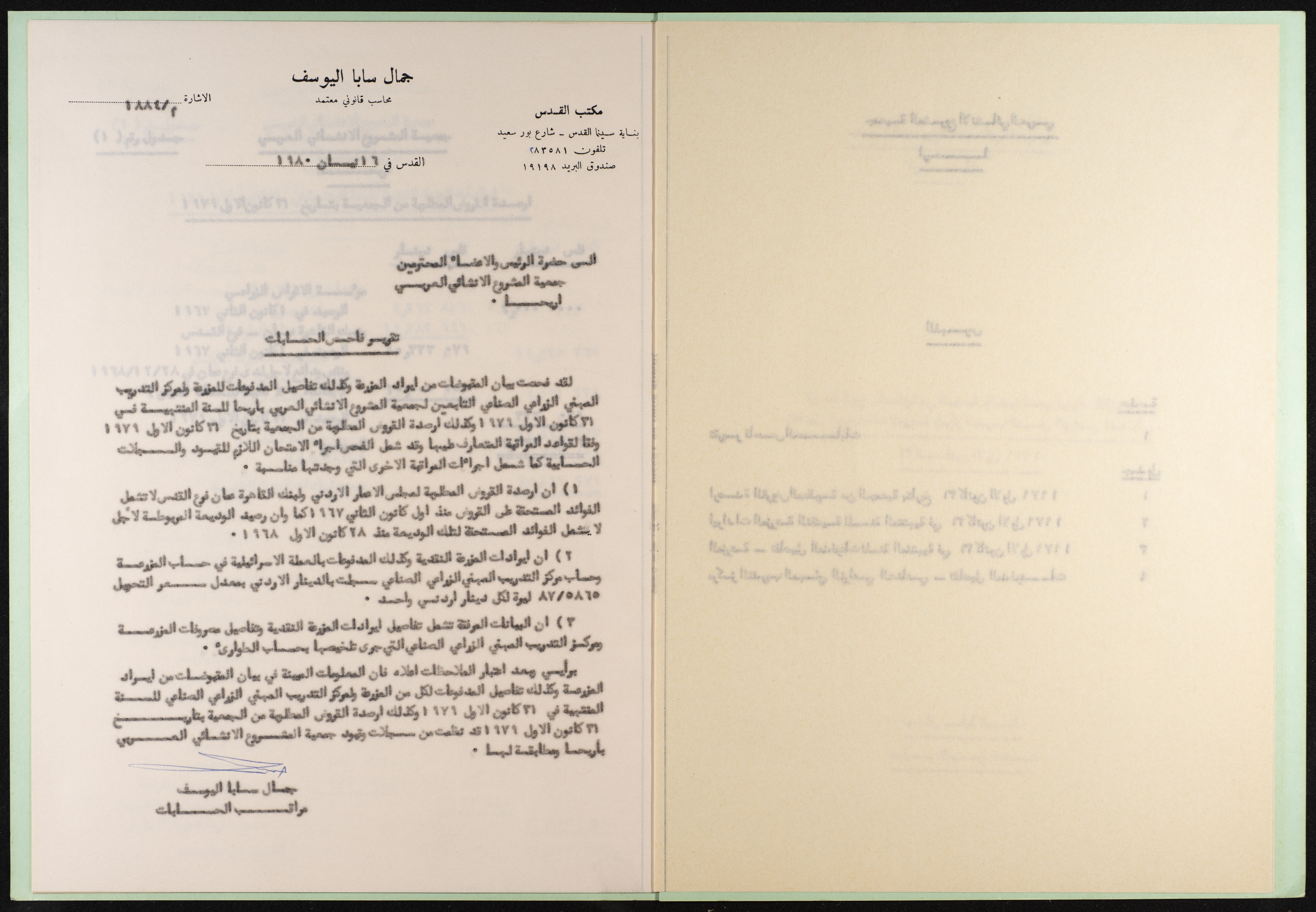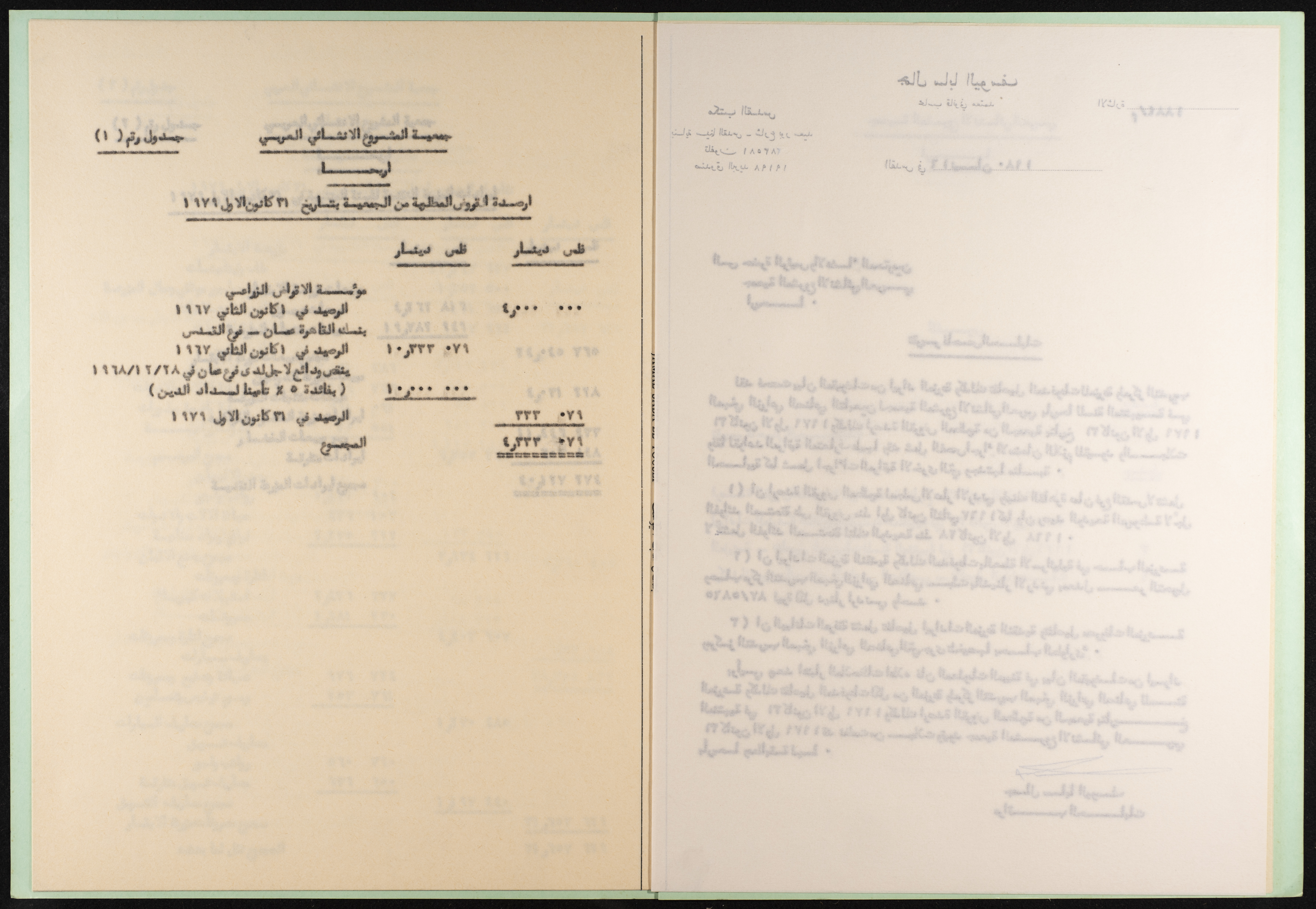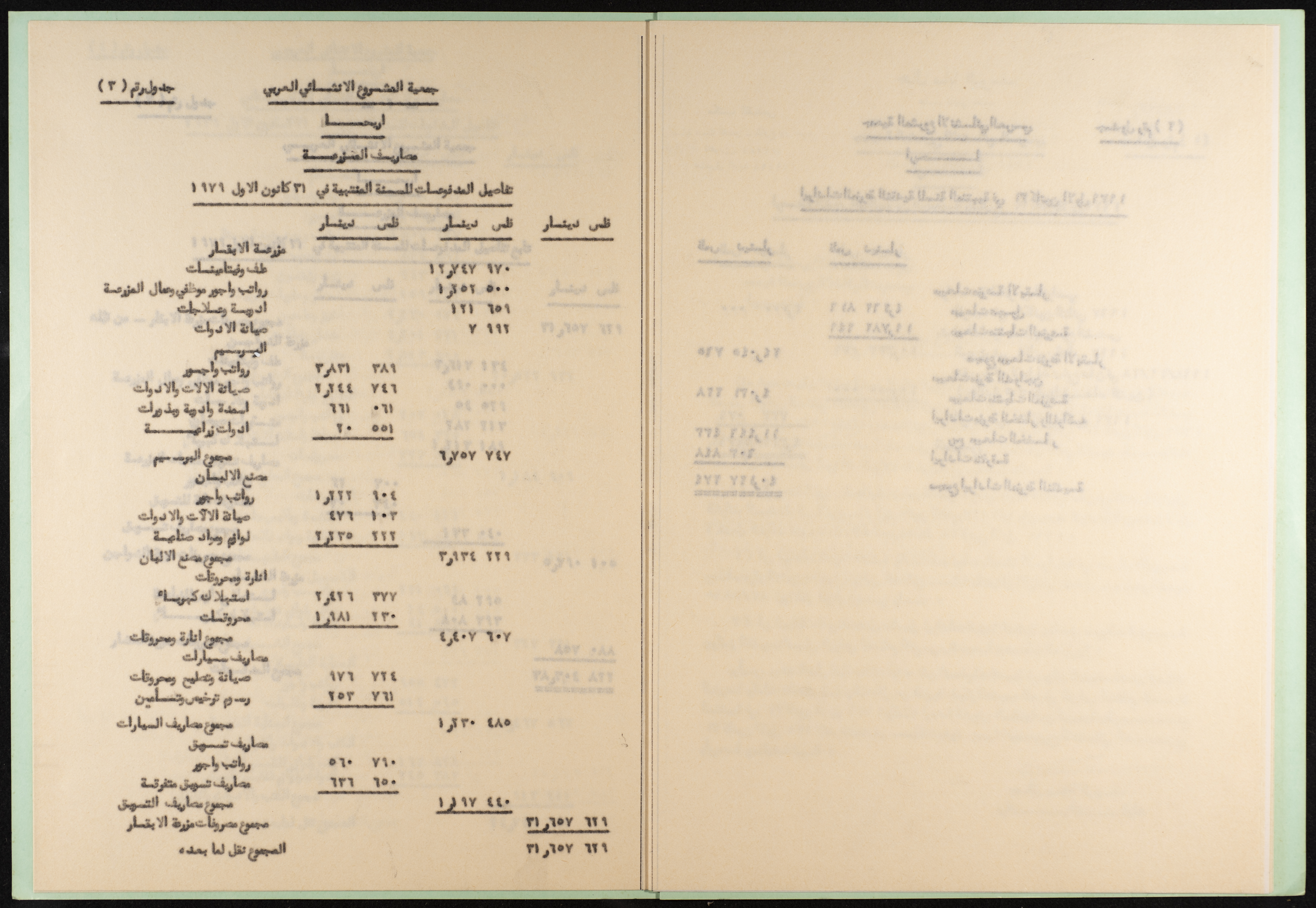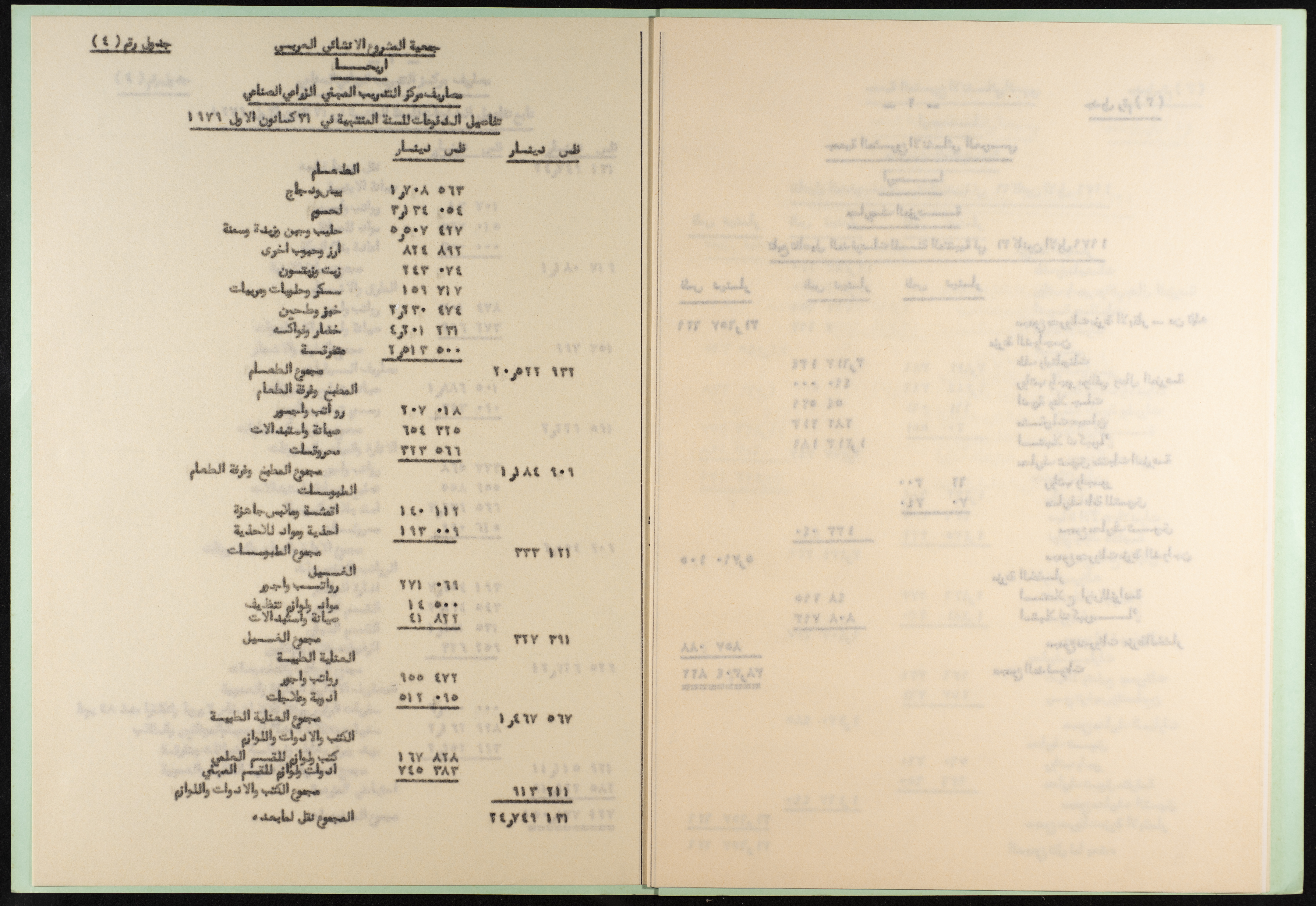 وثيقة مطبوعة باللغة العربية من مجموعة موسى العلمي، ترصد القروض المطلوبة من جمعية المشروع الإنشائي العربي في أريحا والمقبوضات من إيرادات المزرعة، والمدفوعات للمزرعة ولمركز التدريب المهني الزراعي الصناعي لتاريخ 31 كانون الثاني 1979، أعدها المحاسب القانوني جمال اليوسف بتاريخ 16 نيسان 1980.