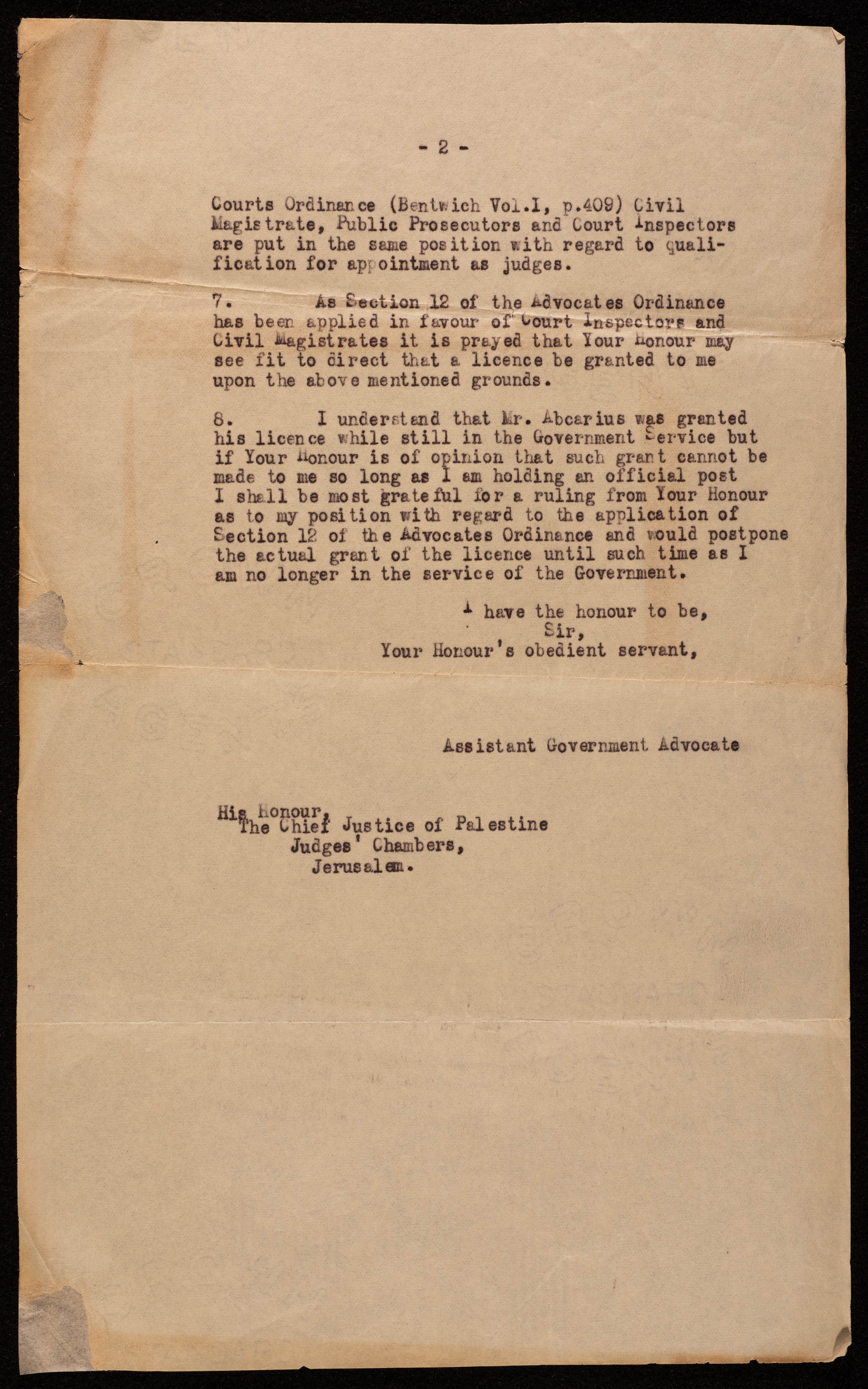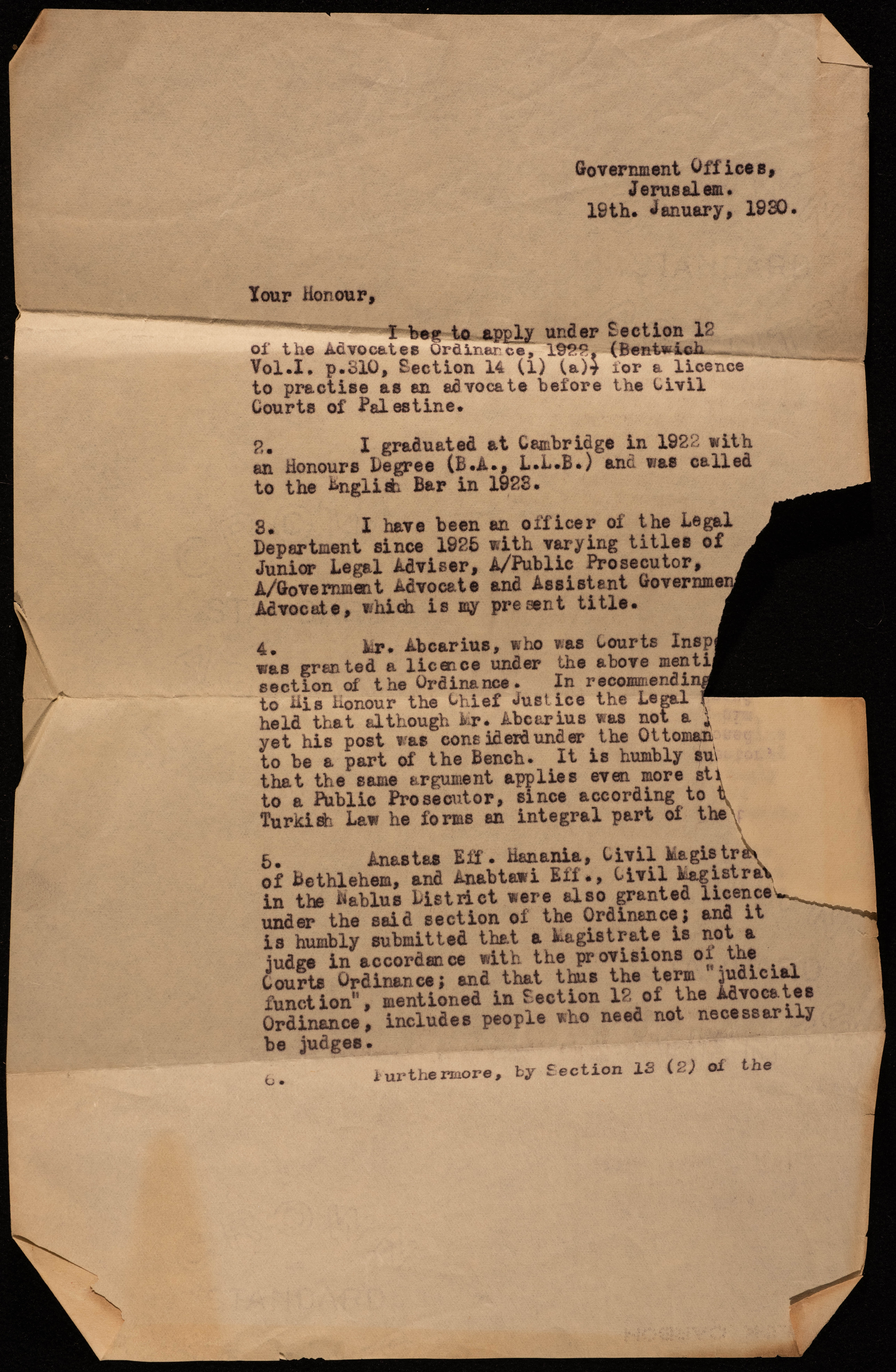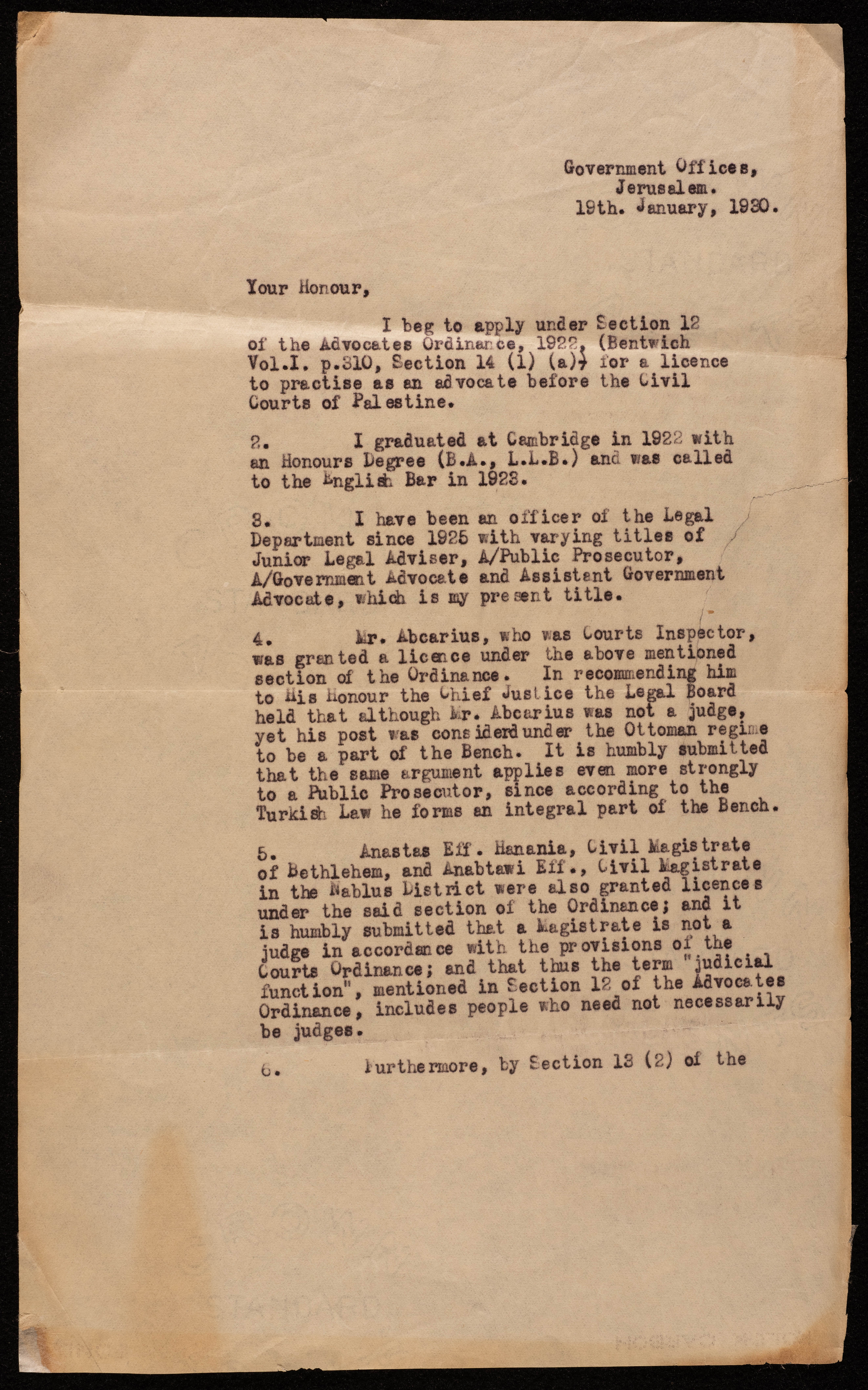 هي عبارة عن رسالتين تحفيزيتين لمكتب الحكومة في القدس بتاريخ 19 كانون الثاني عام 1930 وهذه الرسالئل مرسلة من محامي مساعد في الحكومة الى رئيس غرفة القضاة والعدالة في فلسطين بالقدس. ومضمون هاتين الرسالتين هو عبارة عن طلب لممارسة مهنة المحاماة في المحاكم المدنية في فلسطين حيث يتحدث هذا الشخص عن خلفيته التعليمية وعن خبرته في هذا الاختصاص .