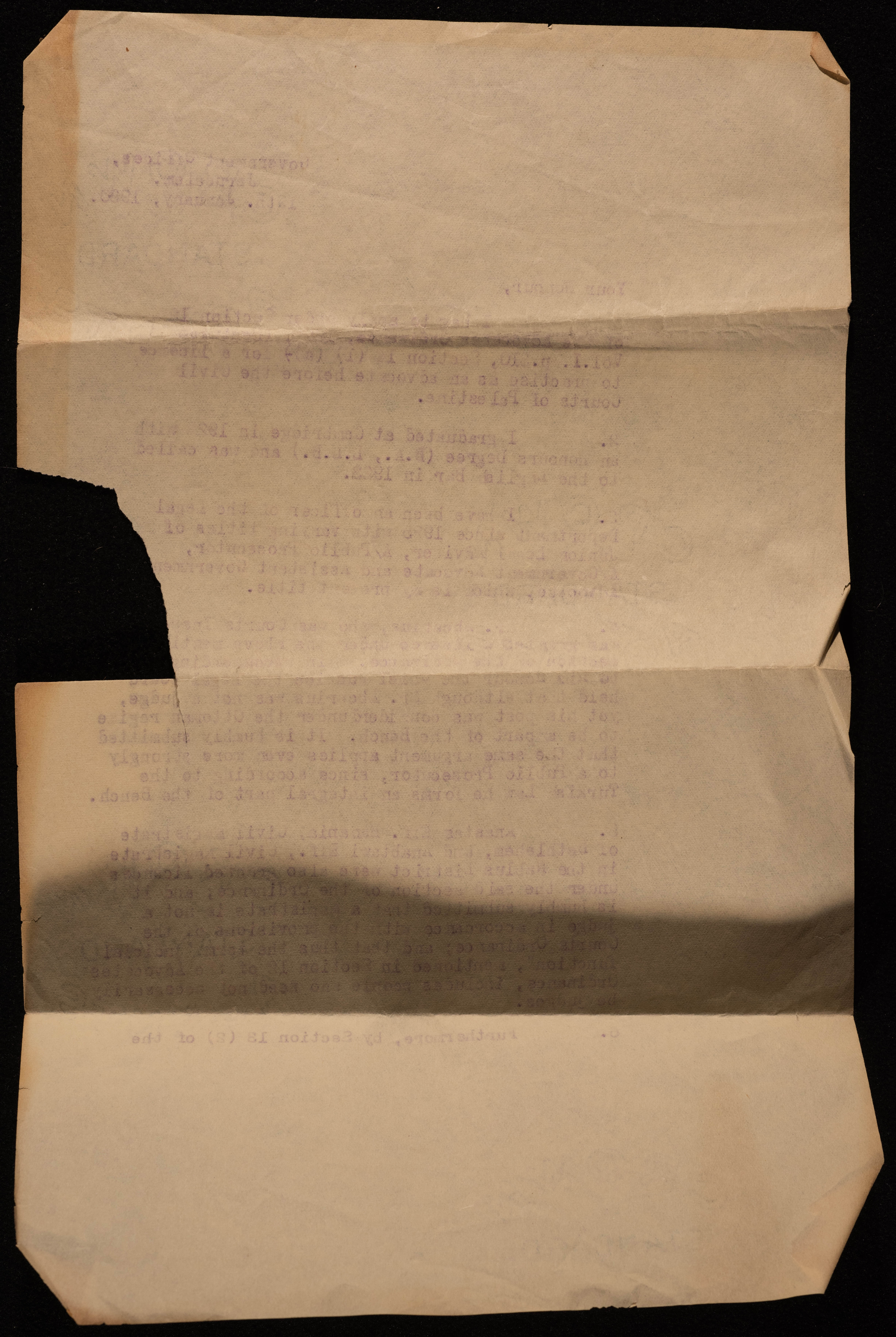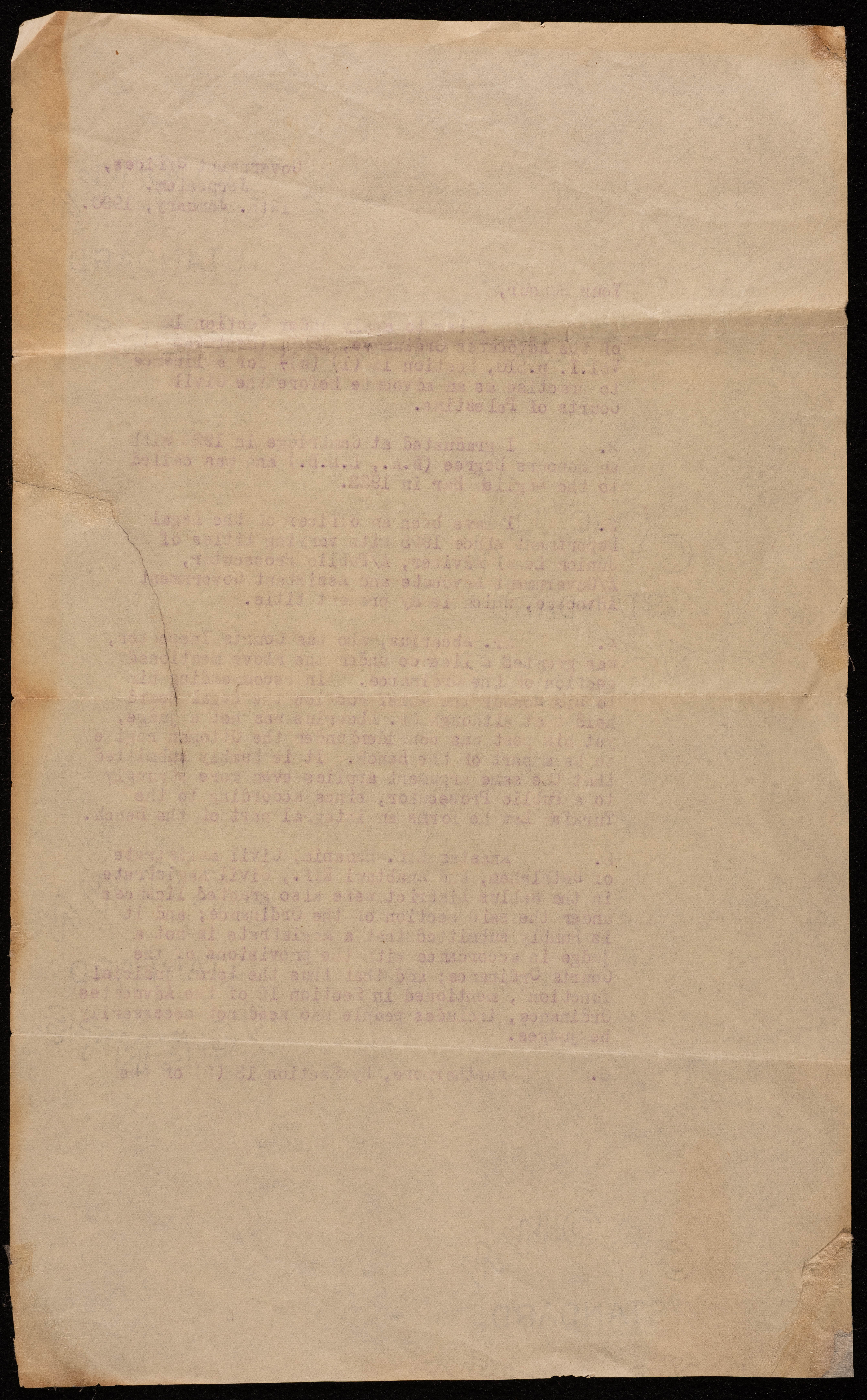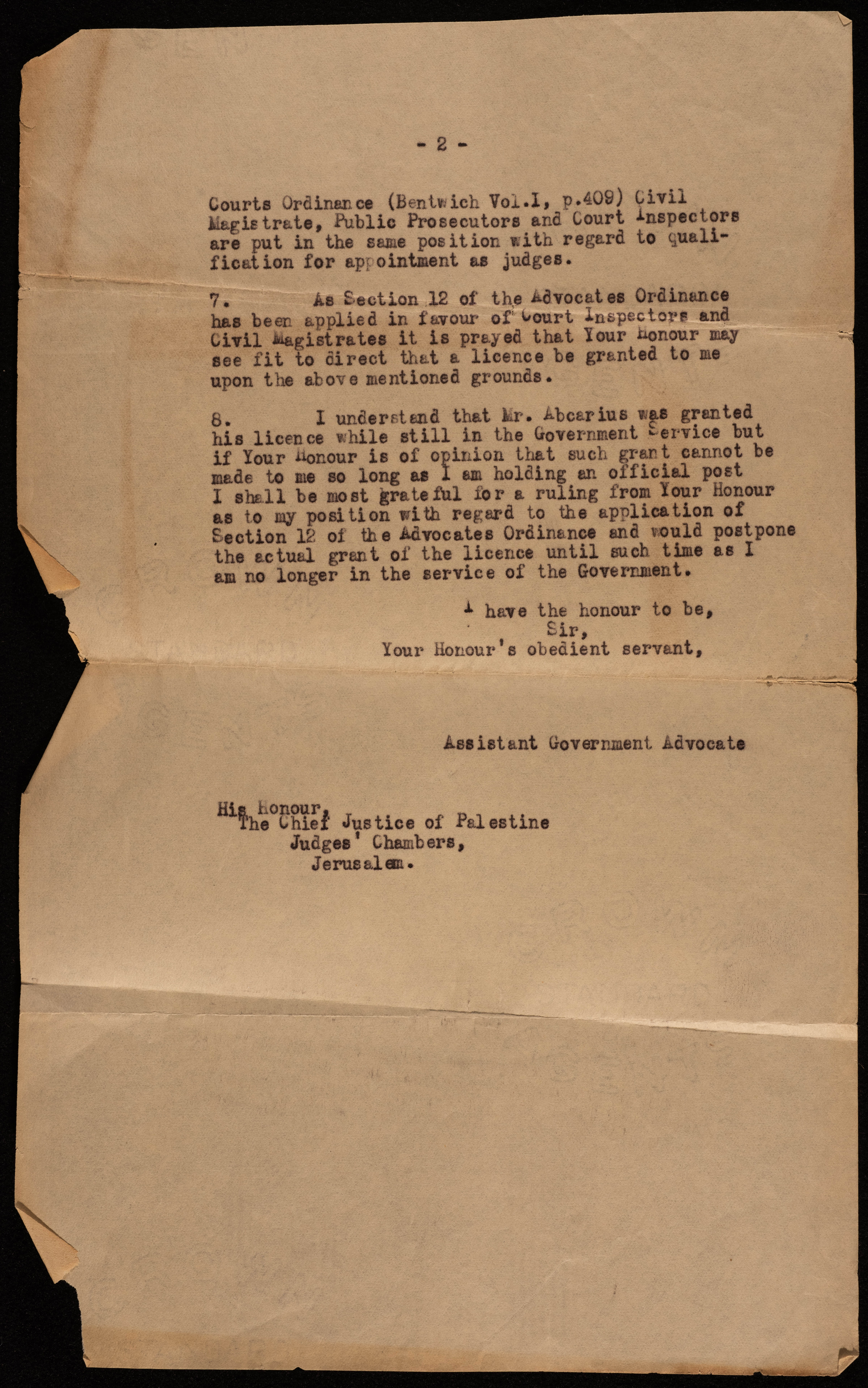 هي عبارة عن رسالتين تحفيزيتين لمكتب الحكومة في القدس بتاريخ 19 كانون الثاني عام 1930 وهذه الرسالئل مرسلة من محامي مساعد في الحكومة الى رئيس غرفة القضاة والعدالة في فلسطين بالقدس. ومضمون هاتين الرسالتين هو عبارة عن طلب لممارسة مهنة المحاماة في المحاكم المدنية في فلسطين حيث يتحدث هذا الشخص عن خلفيته التعليمية وعن خبرته في هذا الاختصاص .